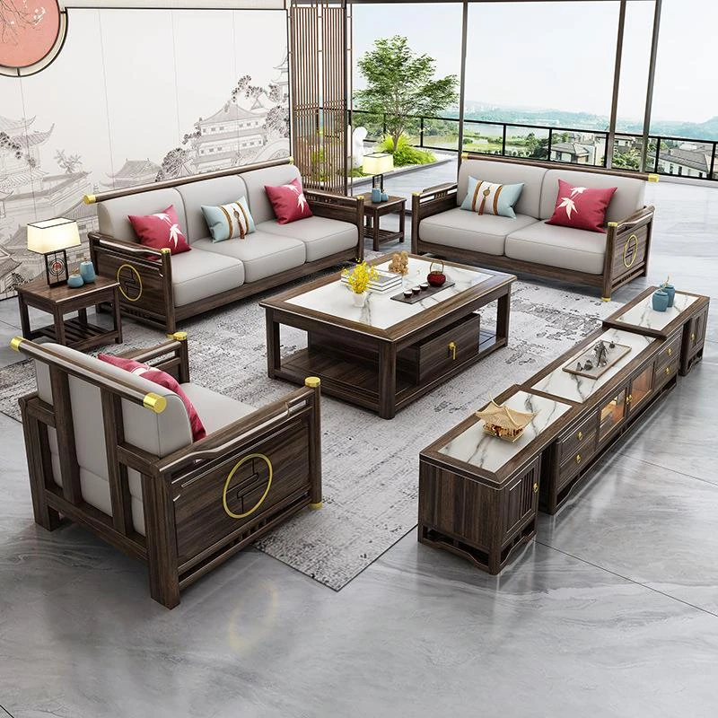 新中式デザインのウーキン材使用!高級感あふれる木製とファブリックのコンビネーション、洗練されたリビング空間を演出する実木ソファセット!あなたの家にぴったりのスタイルを。