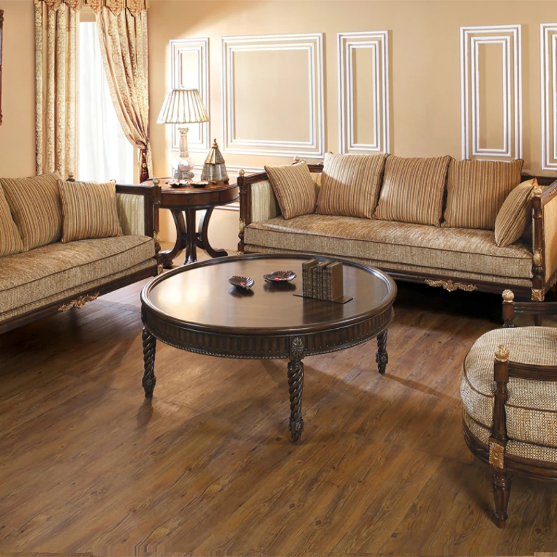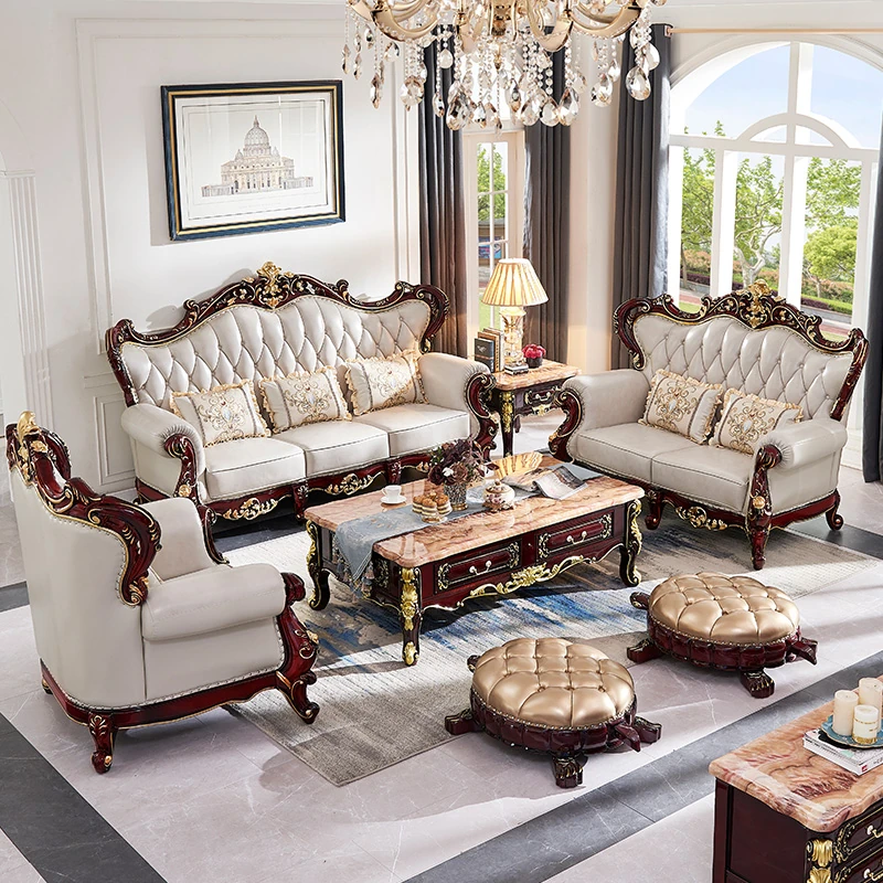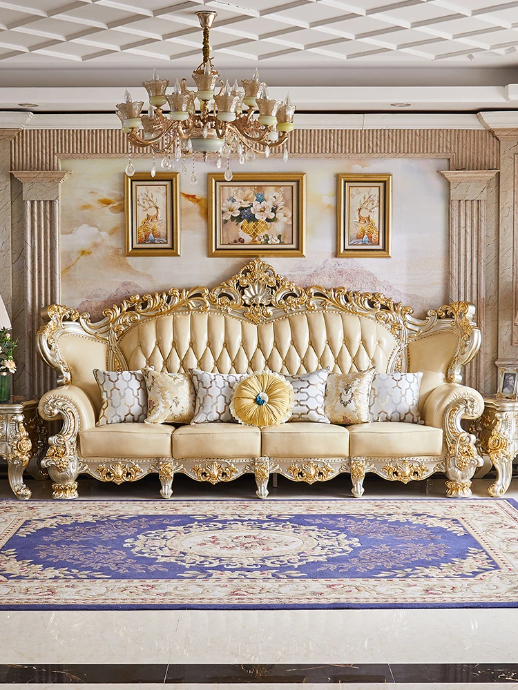 高級感溢れる欧式本革ソファー!豪華な赤檀材を使用した実木彫刻デザインで、別荘のリビングにぴったりの美式家具。123組み合わせで、洗練された空間を演出します。