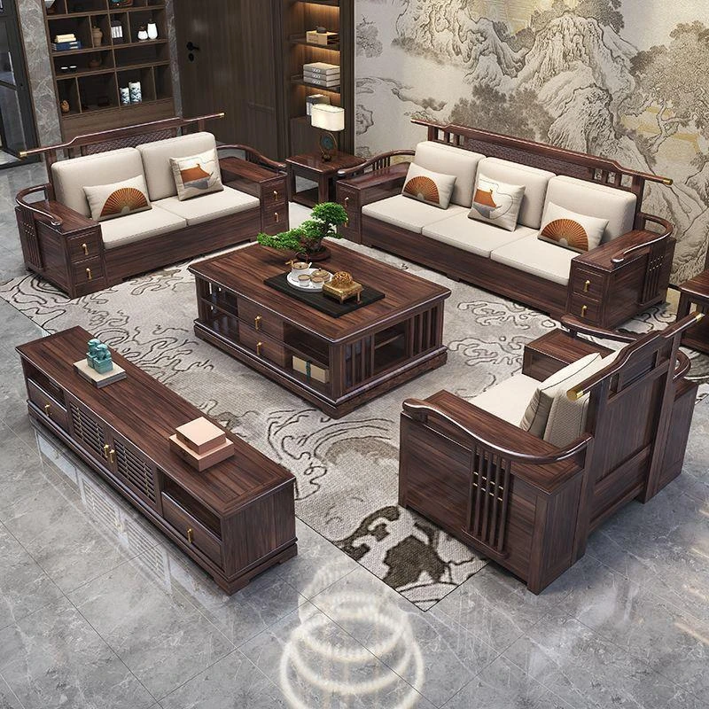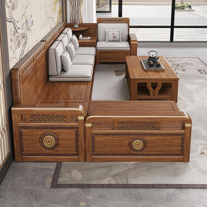 中式実木ウ金木ソファセット - スタイリッシュな収納付き、リビングに最適な広々としたデザイン!大容量で機能的な布張りソファ、家族みんながくつろげる快適な空間を提供します。