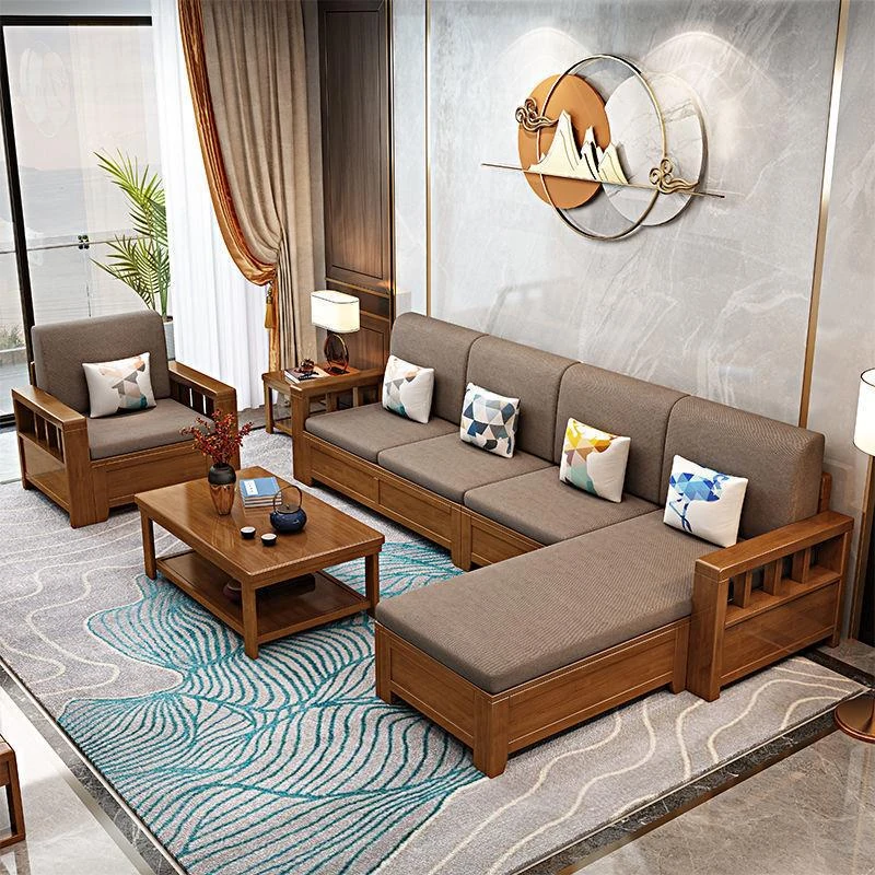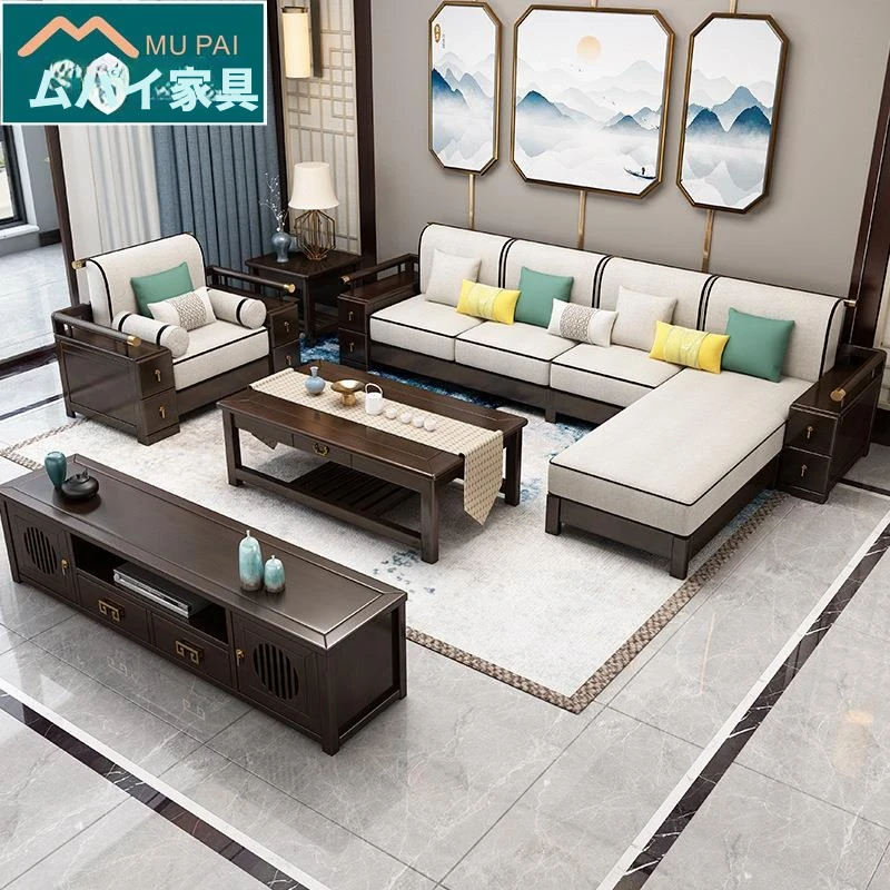 新中式デザインの無垢材ソファセット - 小さなリビングに最適な現代的なラグジュアリー、ヴィラスタイルのカウチとコーナーソファを組み合わせたおしゃれな家具。快適さと洗練された美しさを兼ね備えた一品!