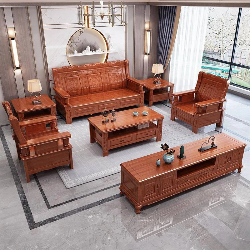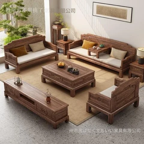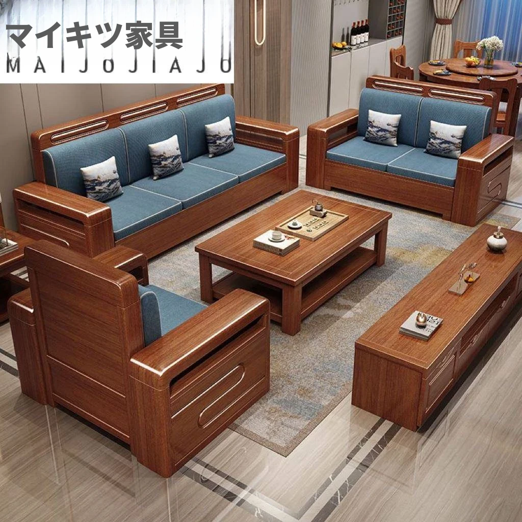 新中式デザインのリビングルーム用ソファセット、大小様々なお部屋に最適!冬も夏も快適に使える全木製ソファ。家全体の家具を一括で揃えられる便利さをお楽しみください!
