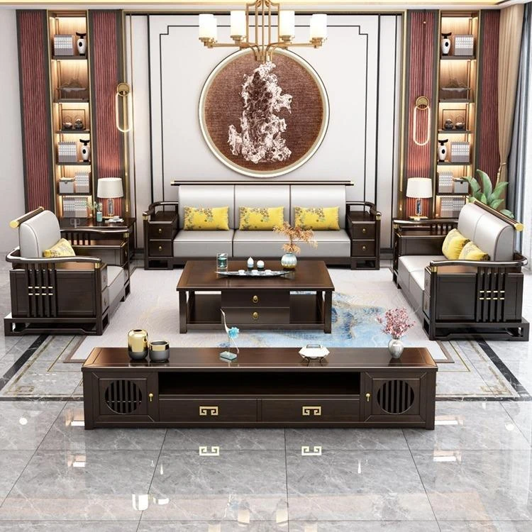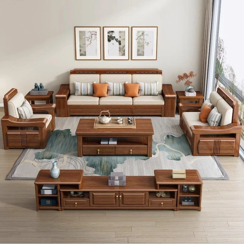 南米ウォールナットの新中式無垢材ソファ。リビングに最適なサイズで、冬も夏も快適に使えるクラシック家具セット!おしゃれで機能的な空間を演出します。