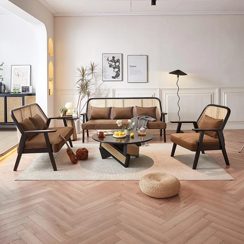 北欧スタイルの無垢材ソファセット|小型リビングに最適なモダンでシンプルなデザイン|人気の民宿風3人掛けラタンソファで心地よい空間を演出!