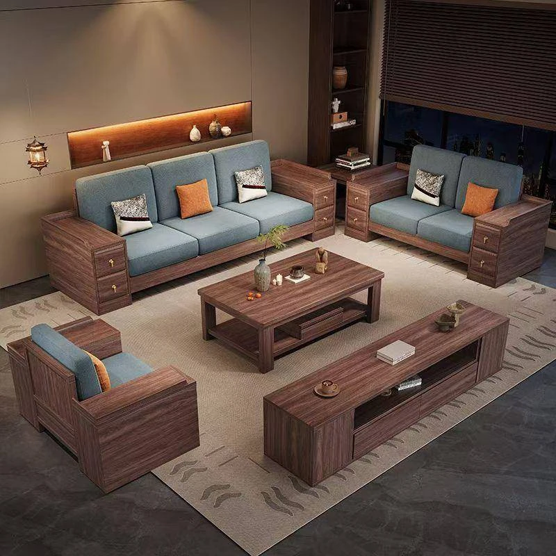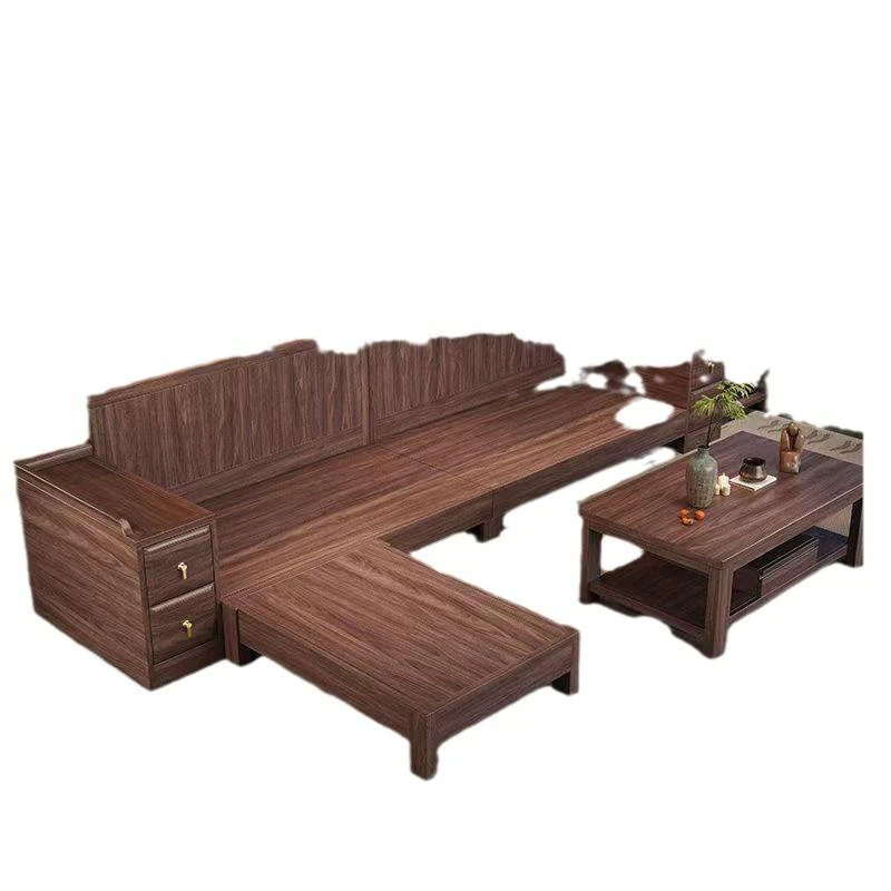 Black Walnut Solid Wood Sofa Set - Modern Minimalist New Chinese Style, Elegant Fabric Chaise Lounge with Storage, Perfect for Small and Large Living Rooms