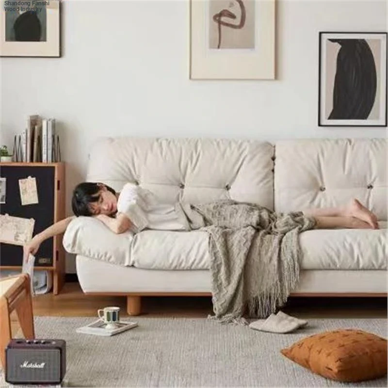 Cherry Wood Solid Cloud Fabric Sofa - Japanese Style 3-Seater for Small Spaces - Walnut Finish - Perfect for Cozy Living Rooms and Home Décor