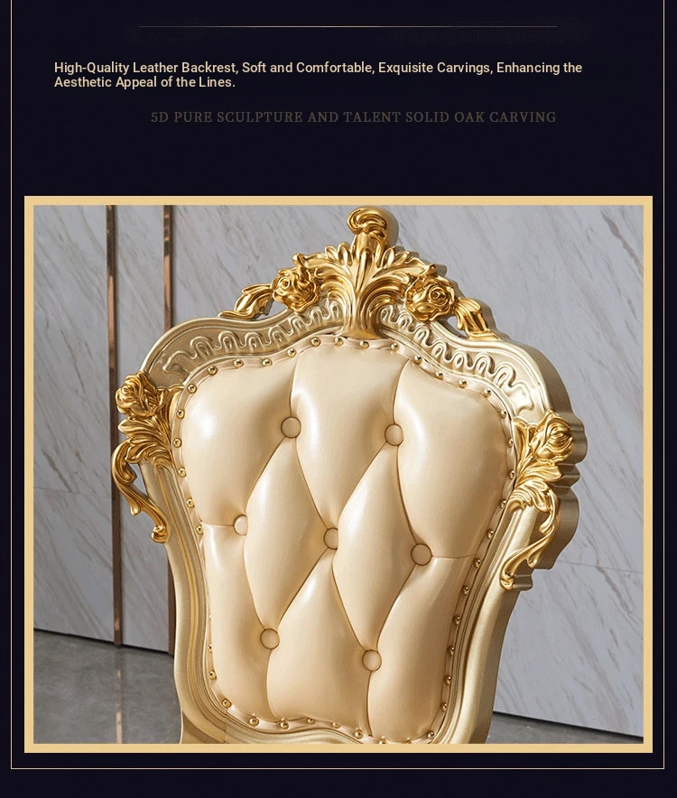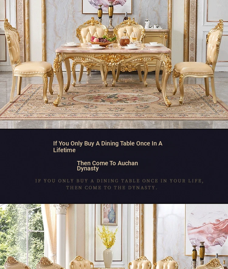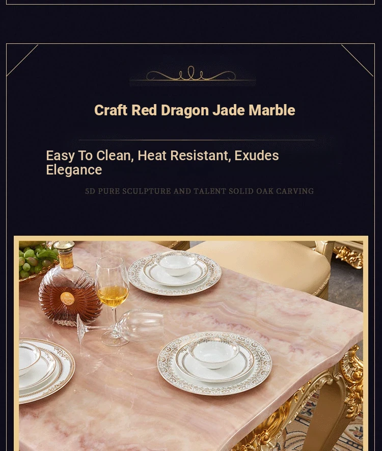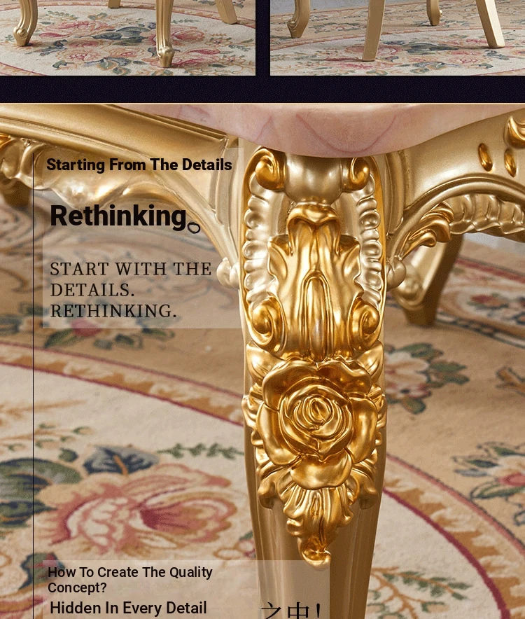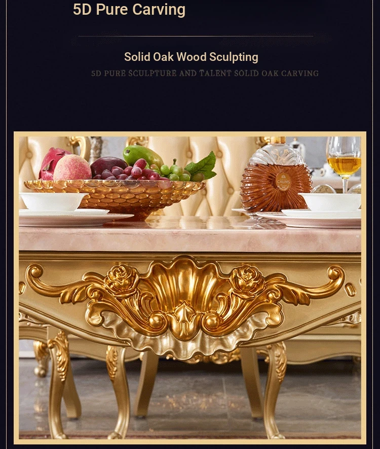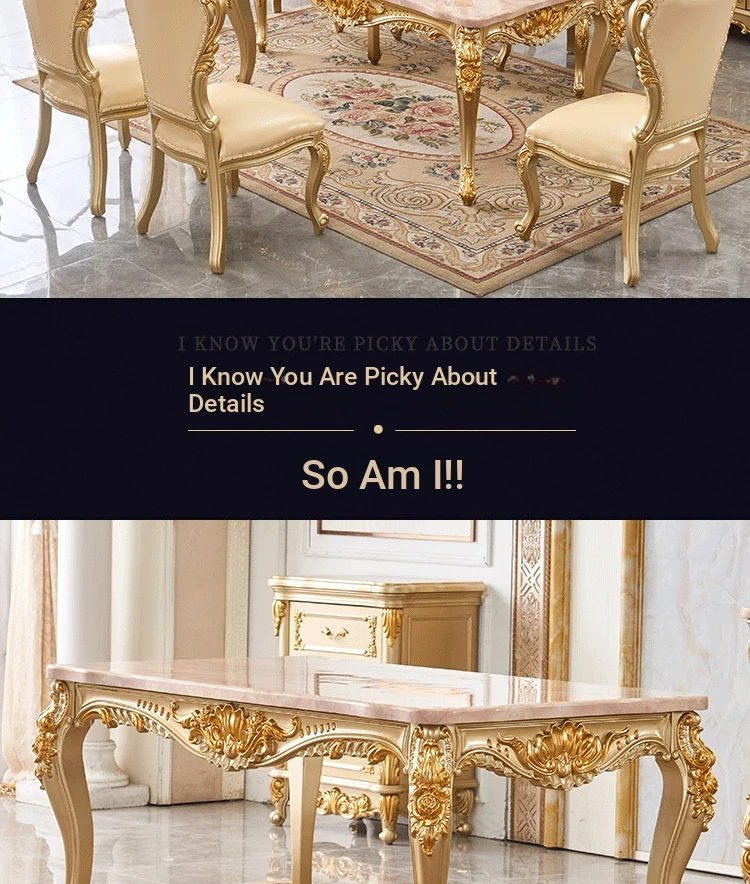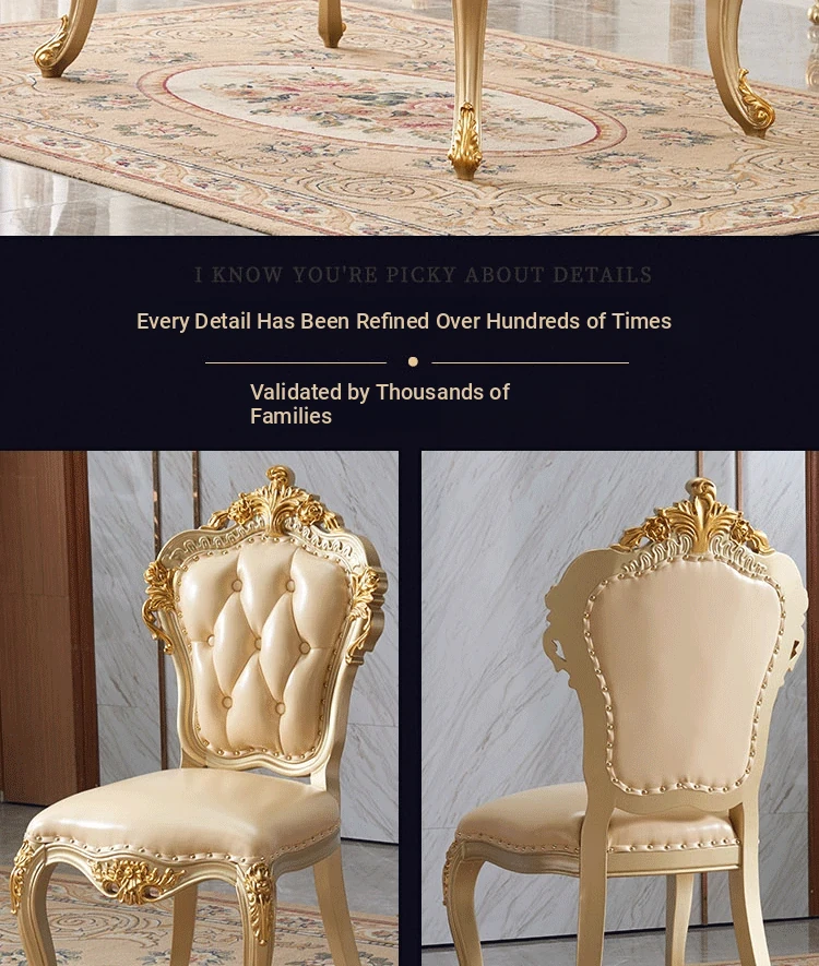 Elegant European Style Marble Top Gold Rectangular Dining Table Set - Minimalist Solid Wood Carved Dining Table and Chairs for Small Living Spaces