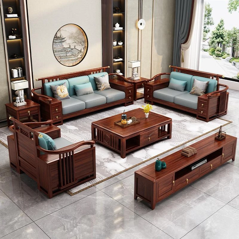 Elegant New Chinese Style Solid Wood Sofa Set with Storage - Luxurious Fabric Chaise Lounge for Small to Large Living Rooms, Perfect for Home Use