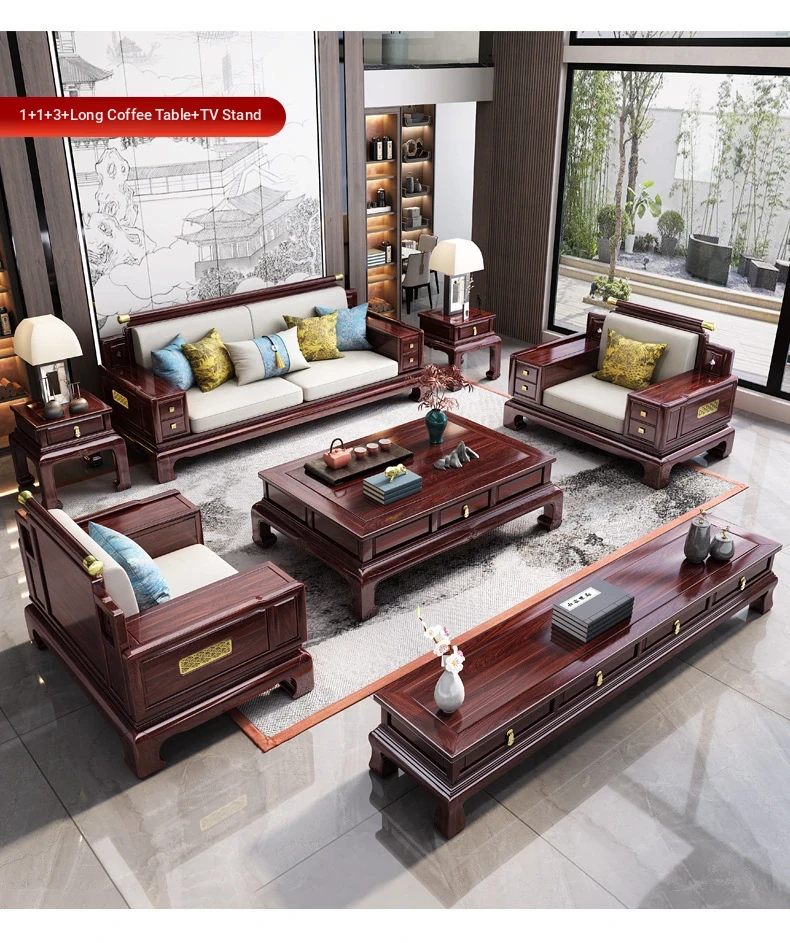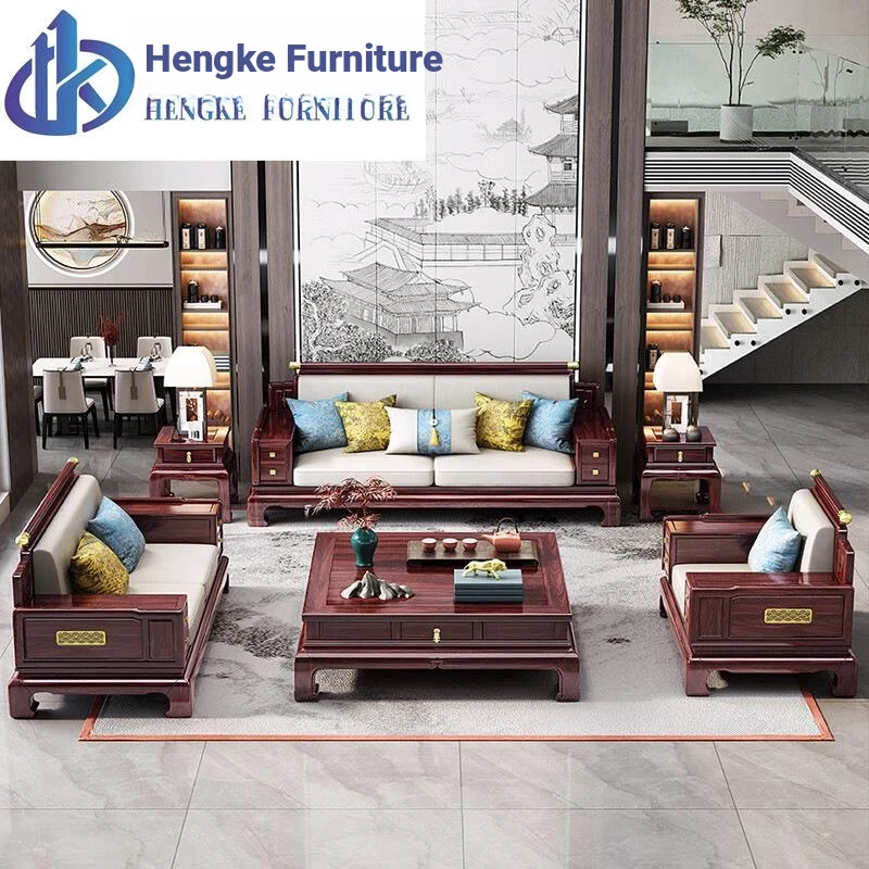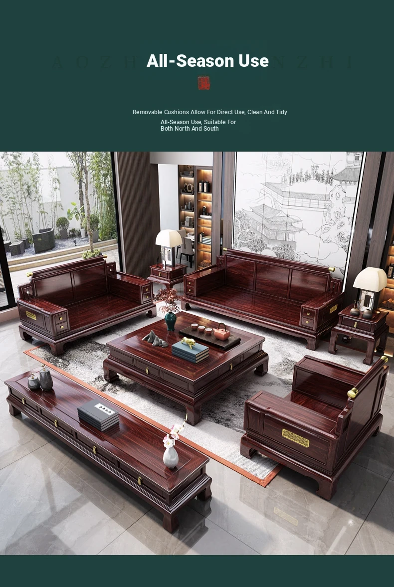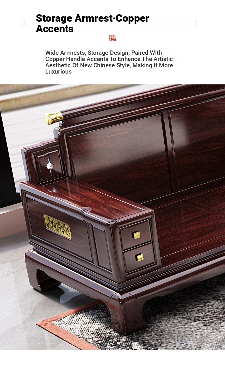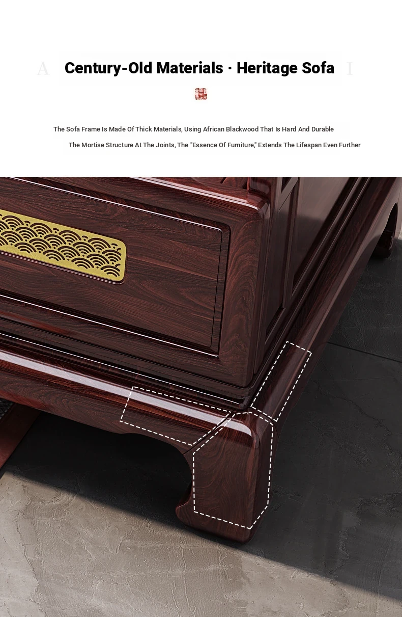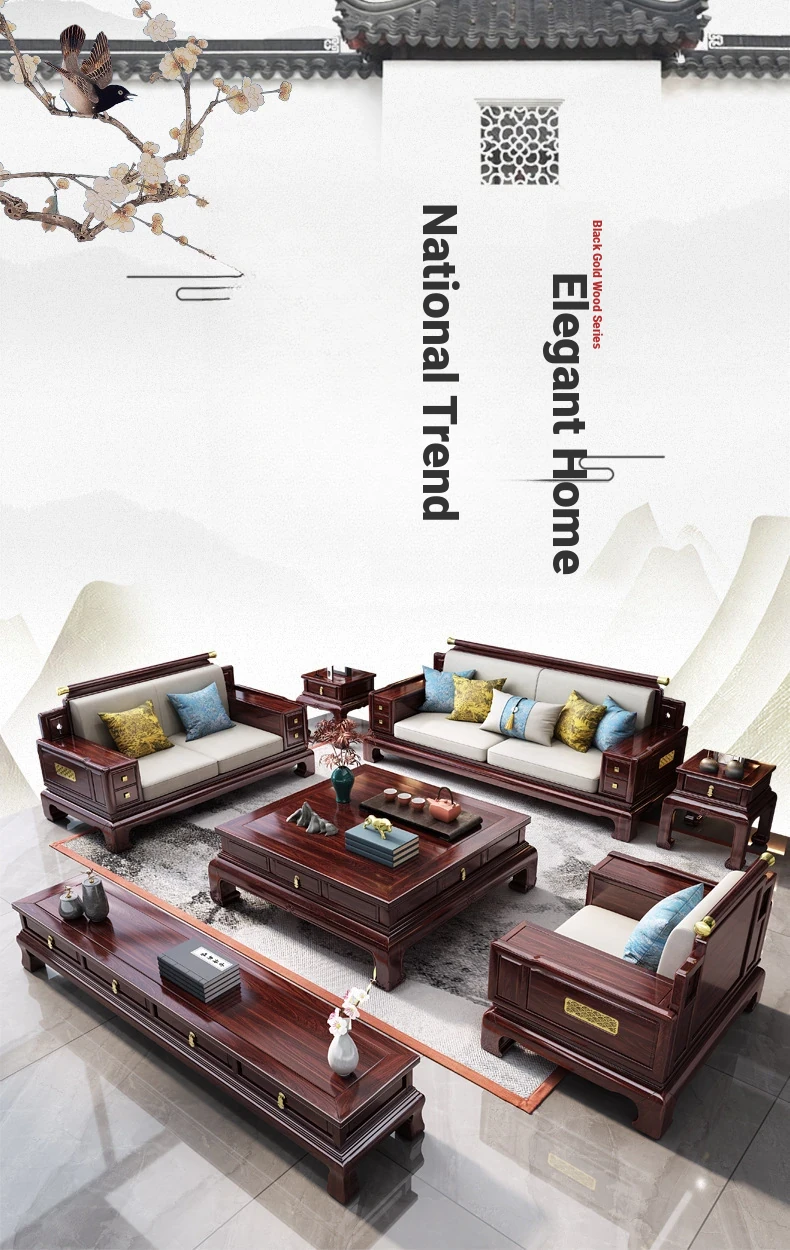 Modern Chinese Style Black Gold Wood Sofa - A Classic Touch for Spacious Villas and Living Rooms, Perfect for Year-Round Comfort with Dual-Season Usability.