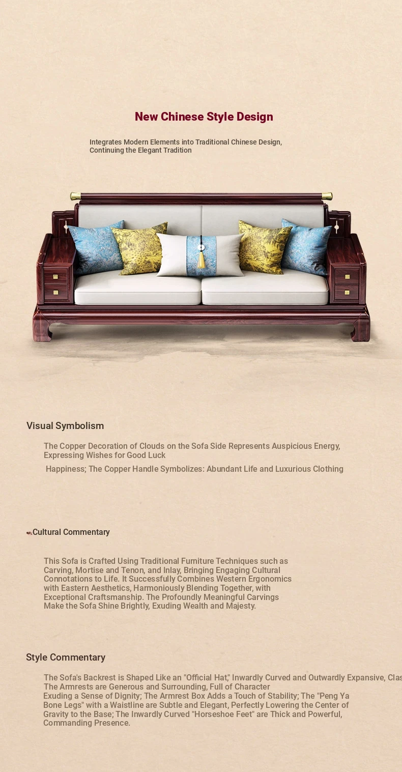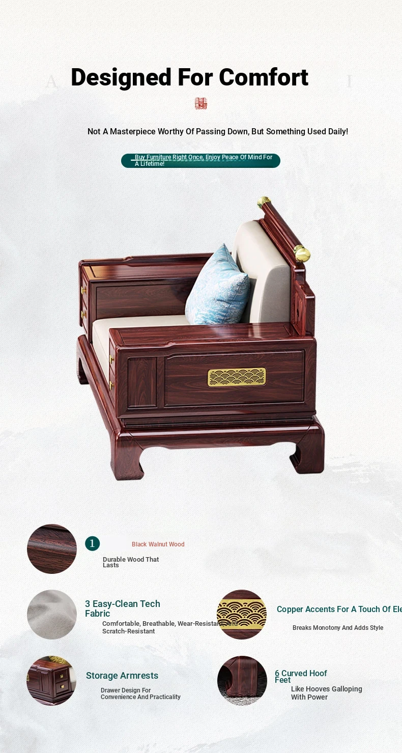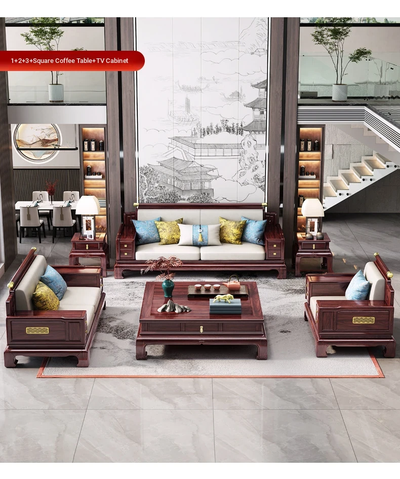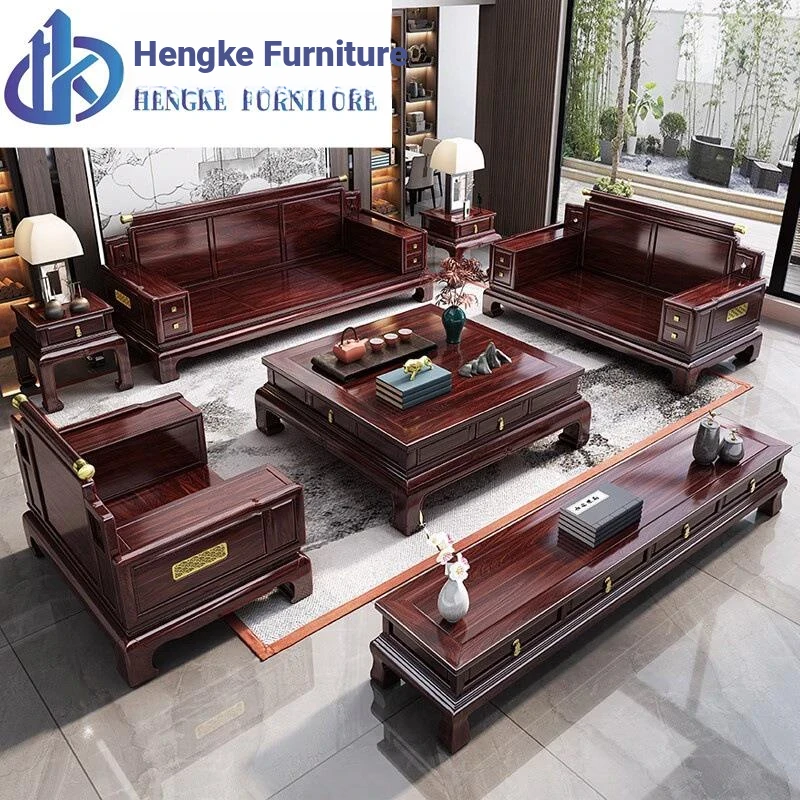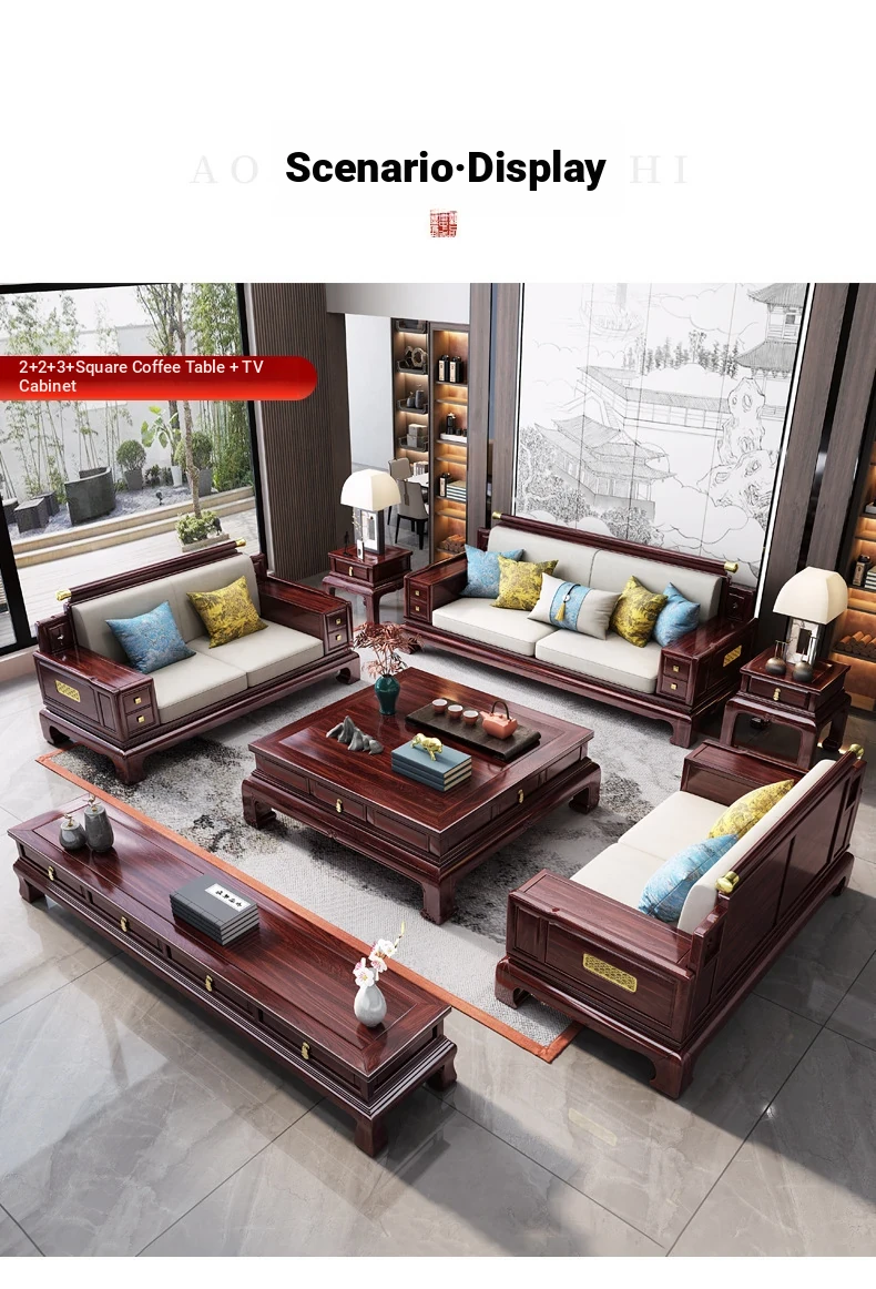 Modern Chinese Style Black Gold Wood Sofa - A Classic Touch for Spacious Villas and Living Rooms, Perfect for Year-Round Comfort with Dual-Season Usability.
