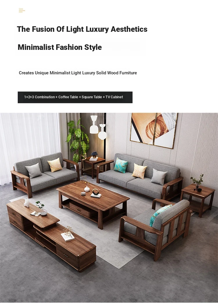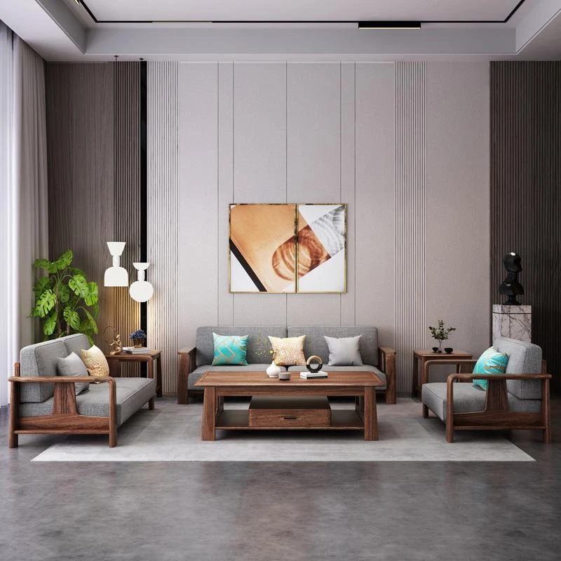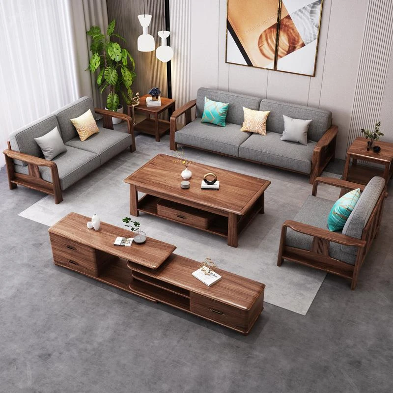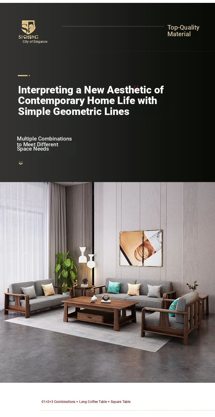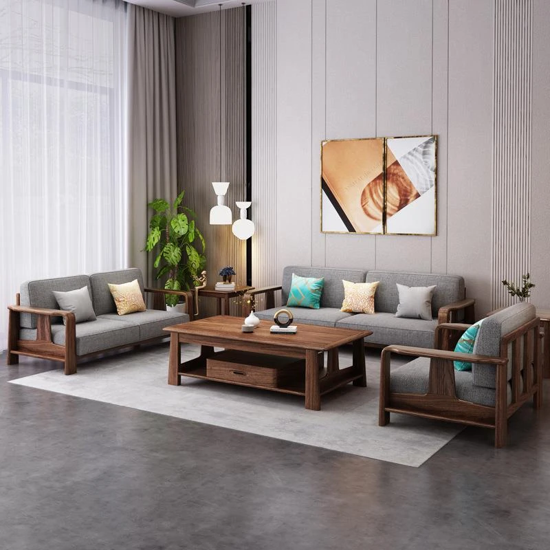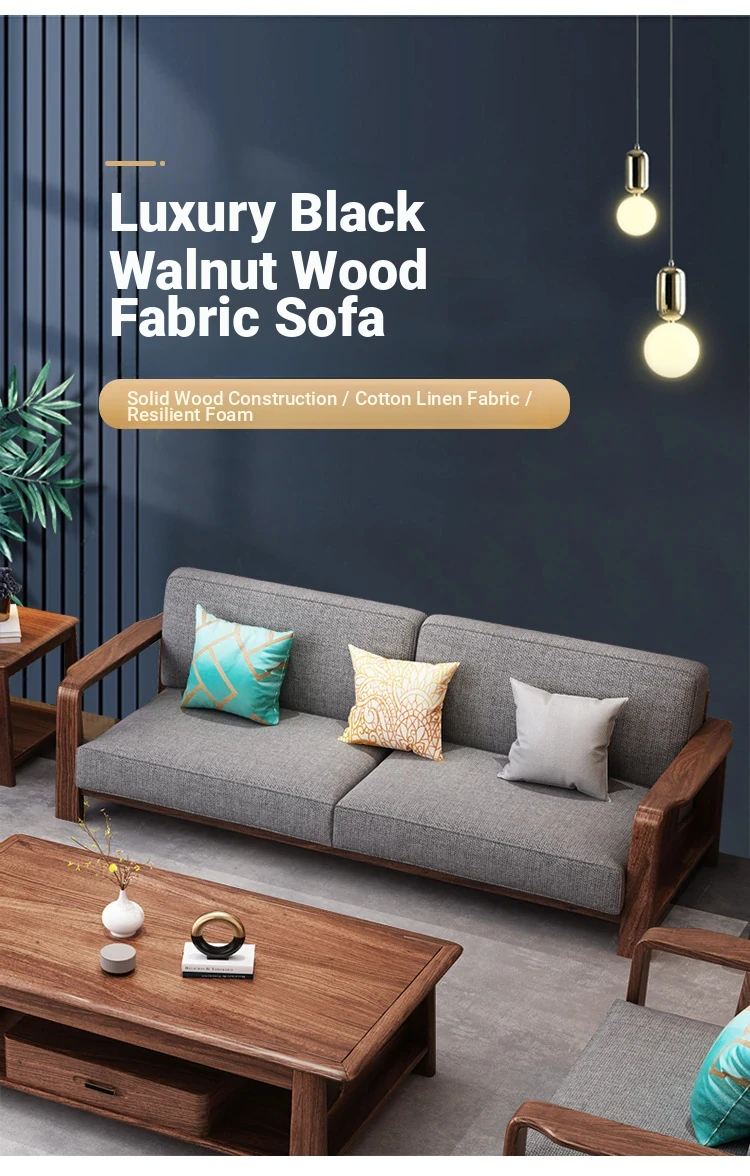 Modern Chinese-Style Solid Wood Sofa Set - 1+2+3 Combination with Luxurious Black Gold Wood, Elegant Fabric Upholstery, Perfect for Your Living Room Furniture.
