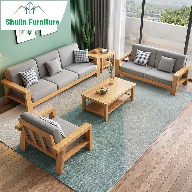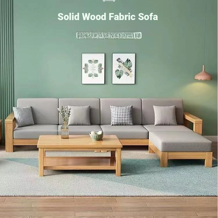 Scandinavian Solid Wood Sofa Set - Modern Minimalist Removable L-Shaped Fabric Sofa for Small Spaces - Stylish Natural Wood Living Room Furniture