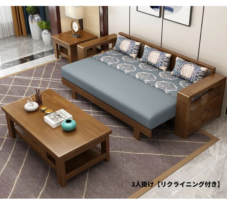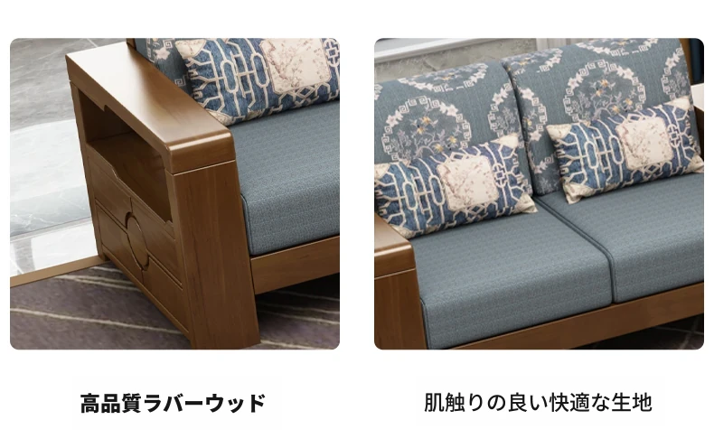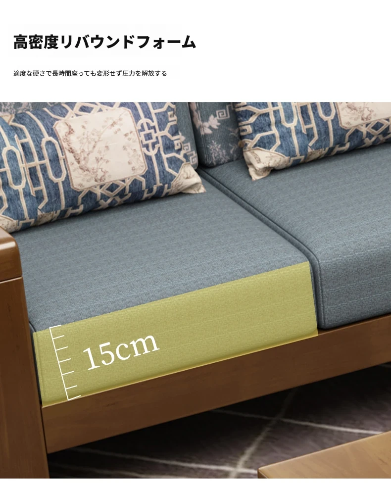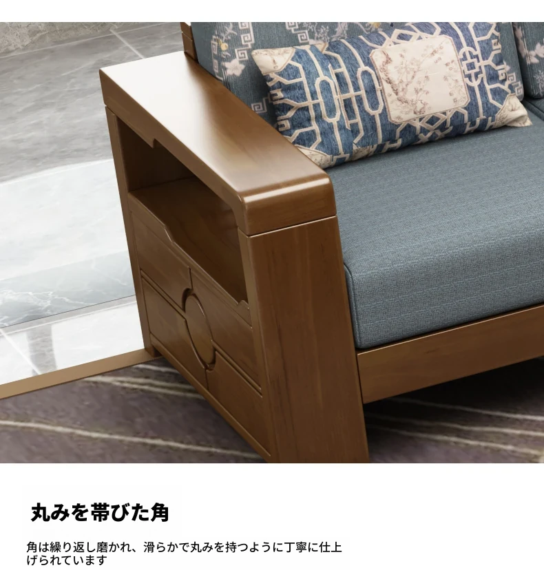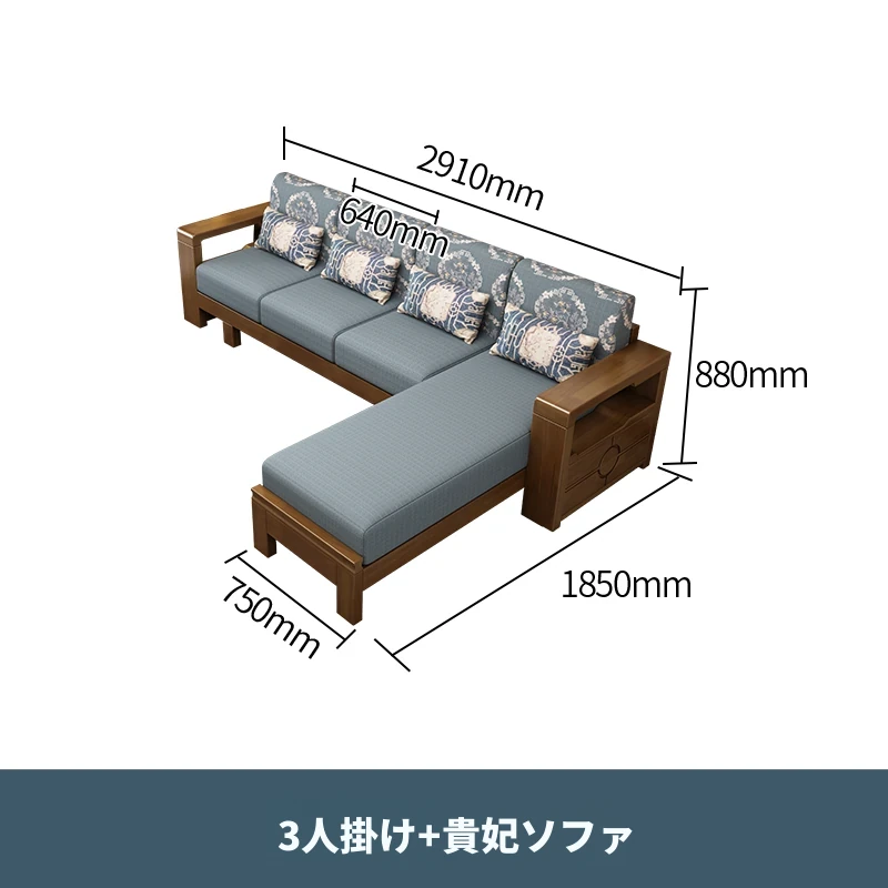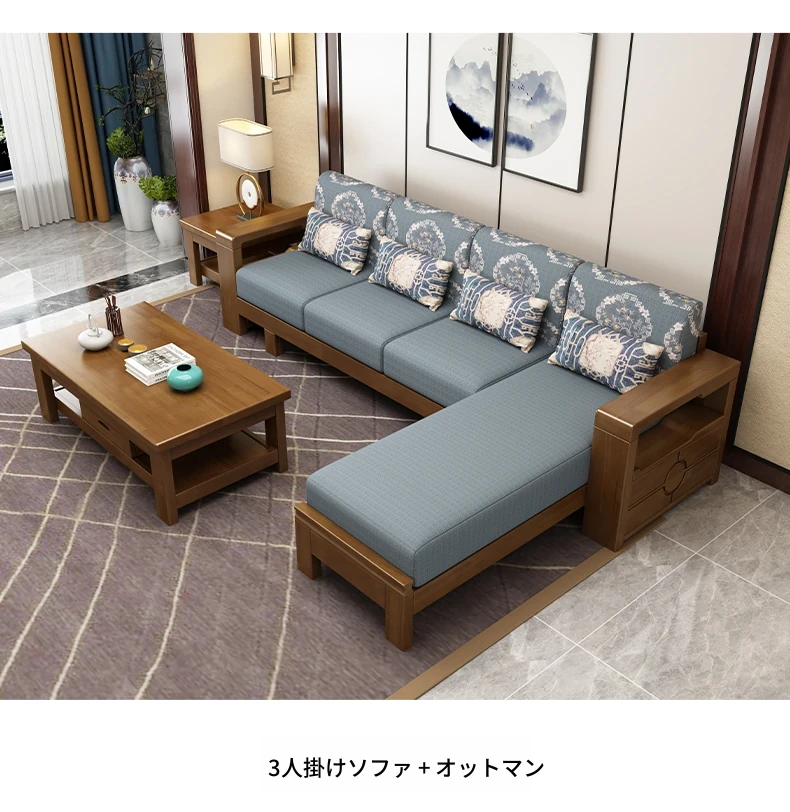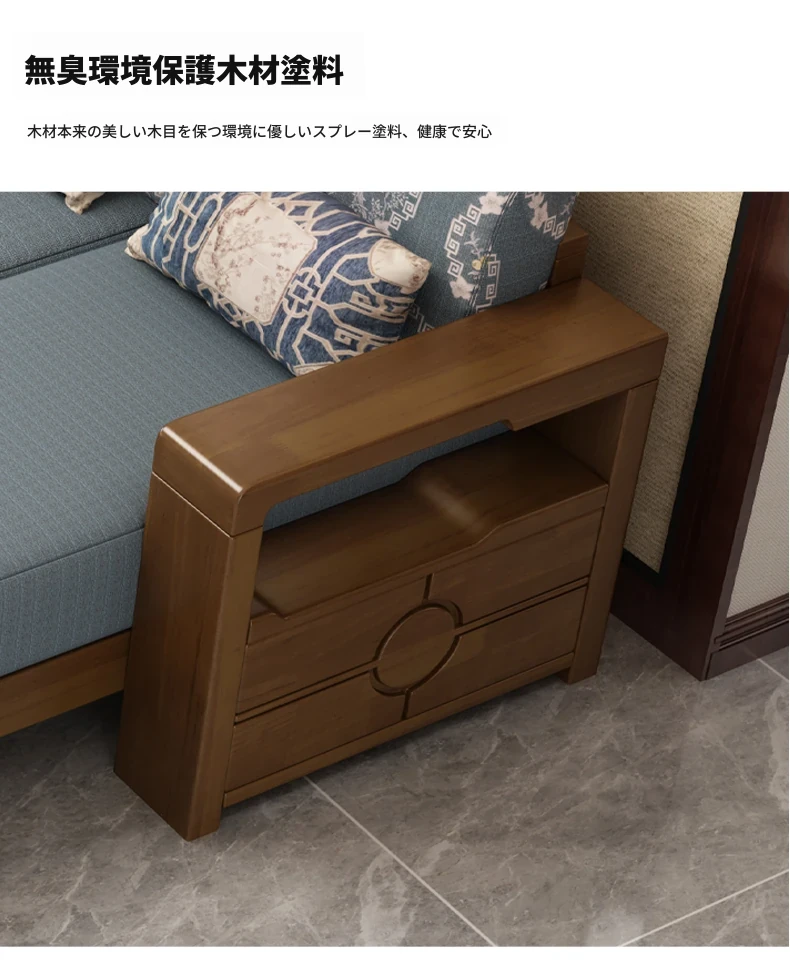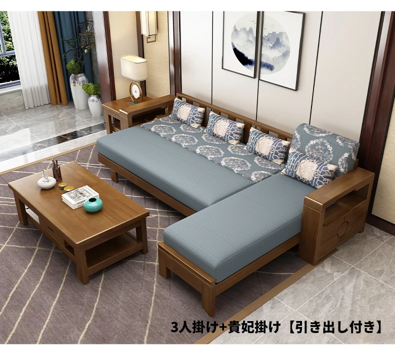 9W中式リビングルーム用原木ソファコーナーセット - ファブリック仕様の高級デイベッド付き3人掛けソファ、全実木製で高品質!