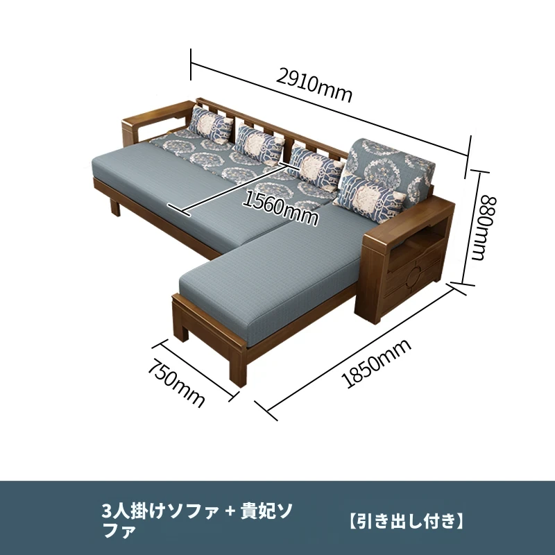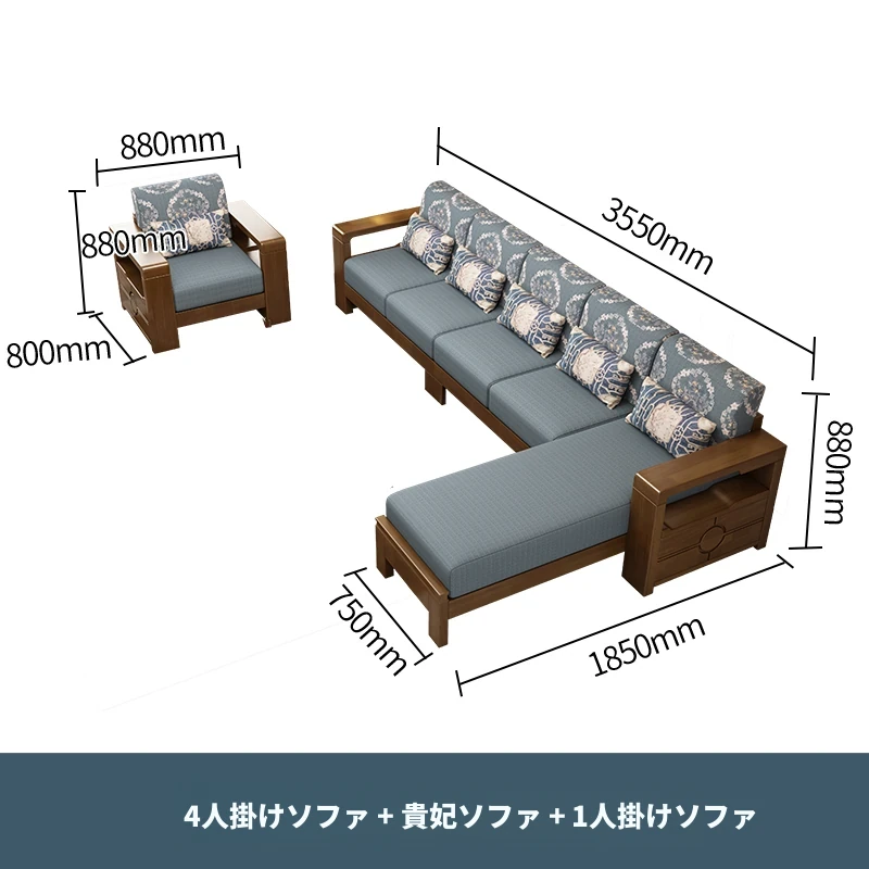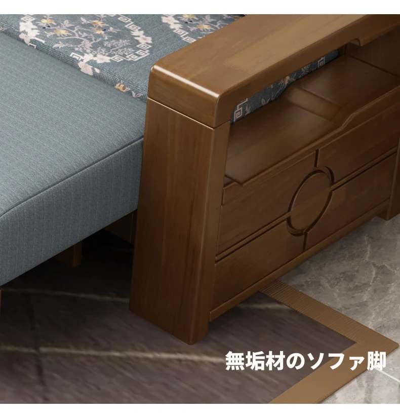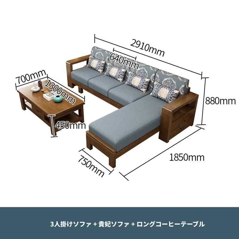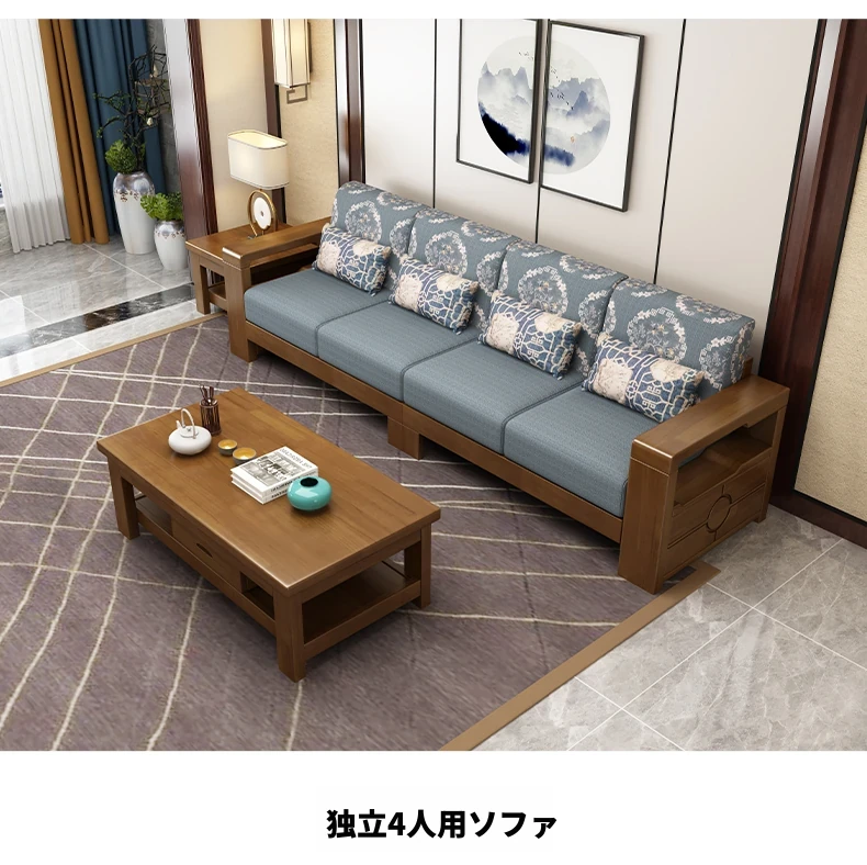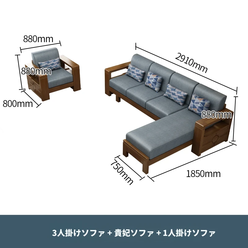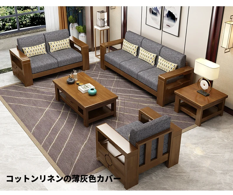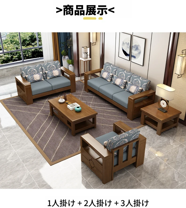 9W中式リビングルーム用原木ソファコーナーセット - ファブリック仕様の高級デイベッド付き3人掛けソファ、全実木製で高品質!