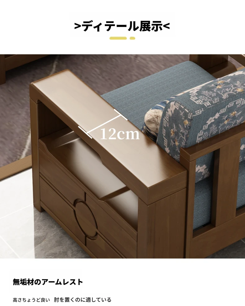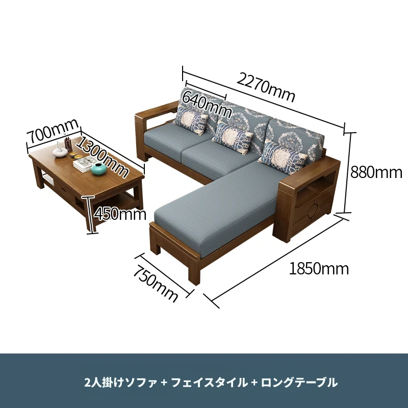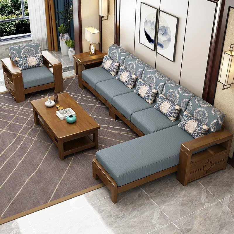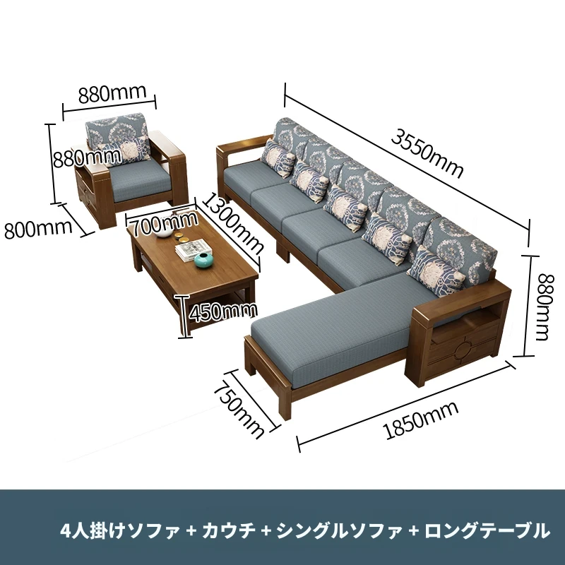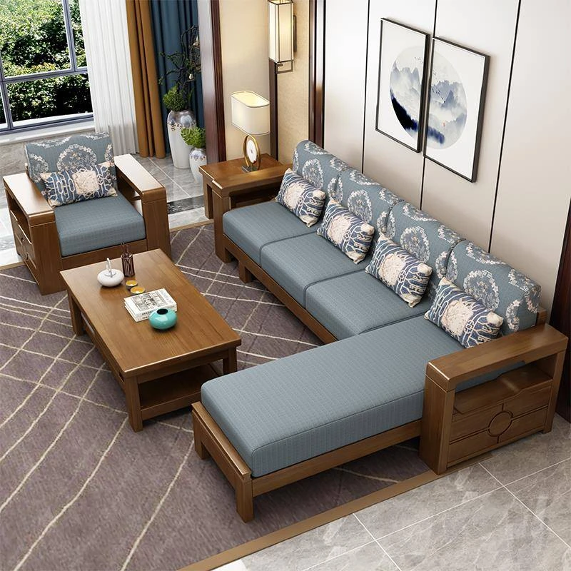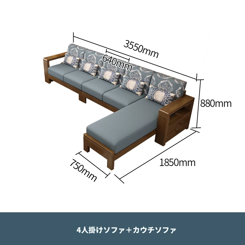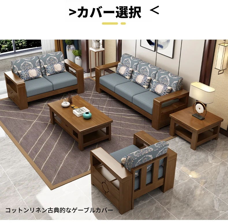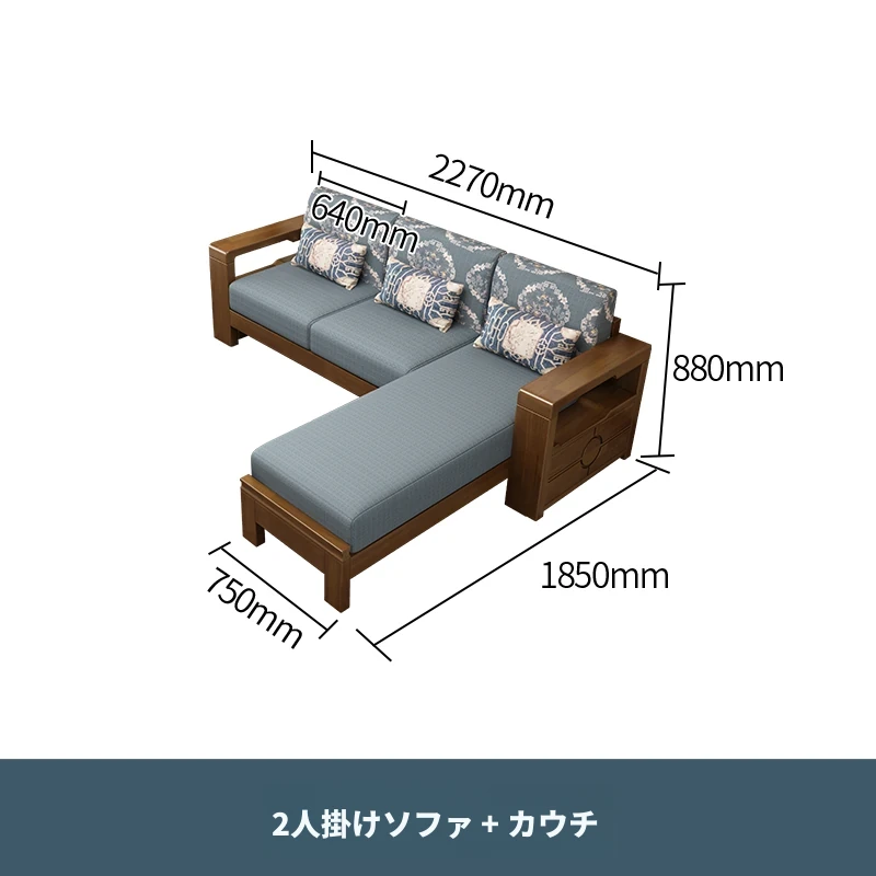 9W中式リビングルーム用原木ソファコーナーセット - ファブリック仕様の高級デイベッド付き3人掛けソファ、全実木製で高品質!