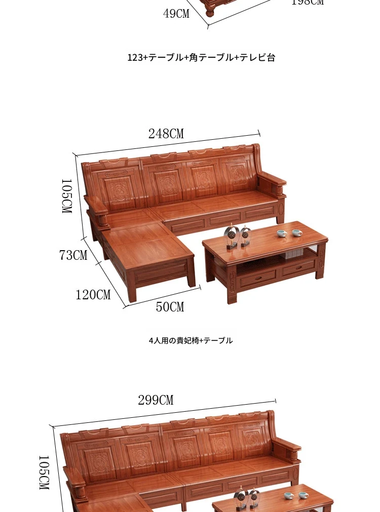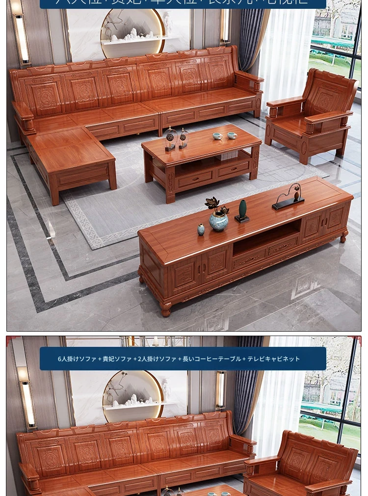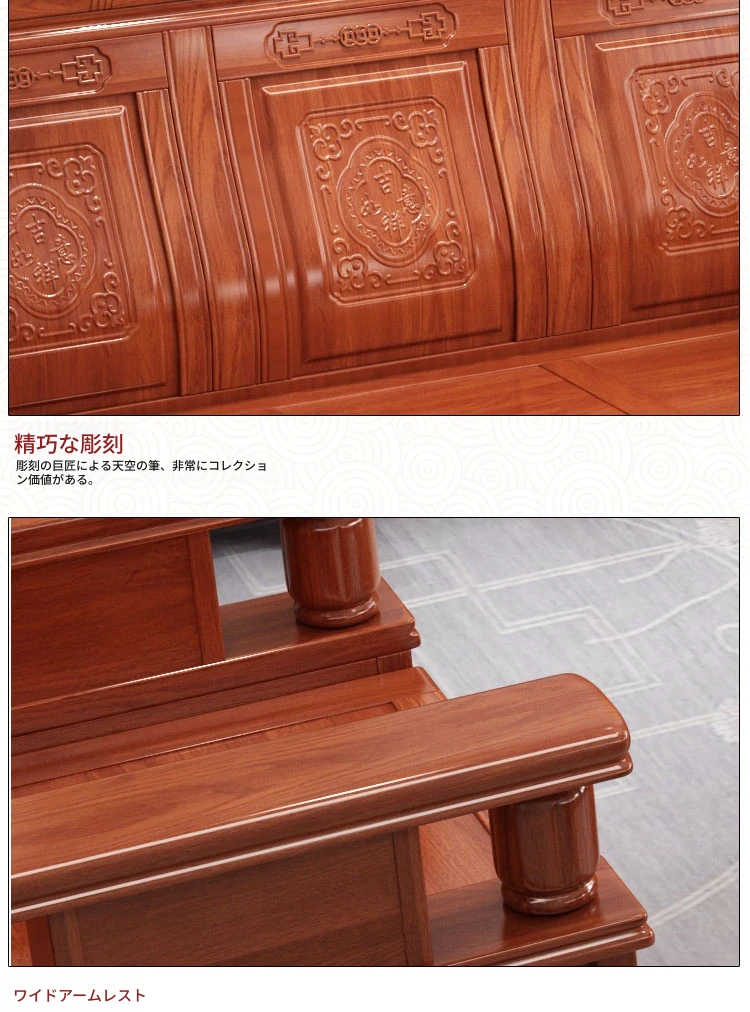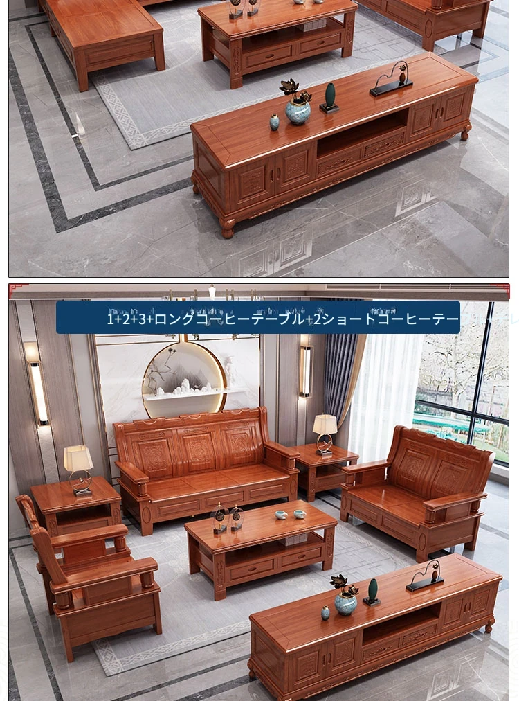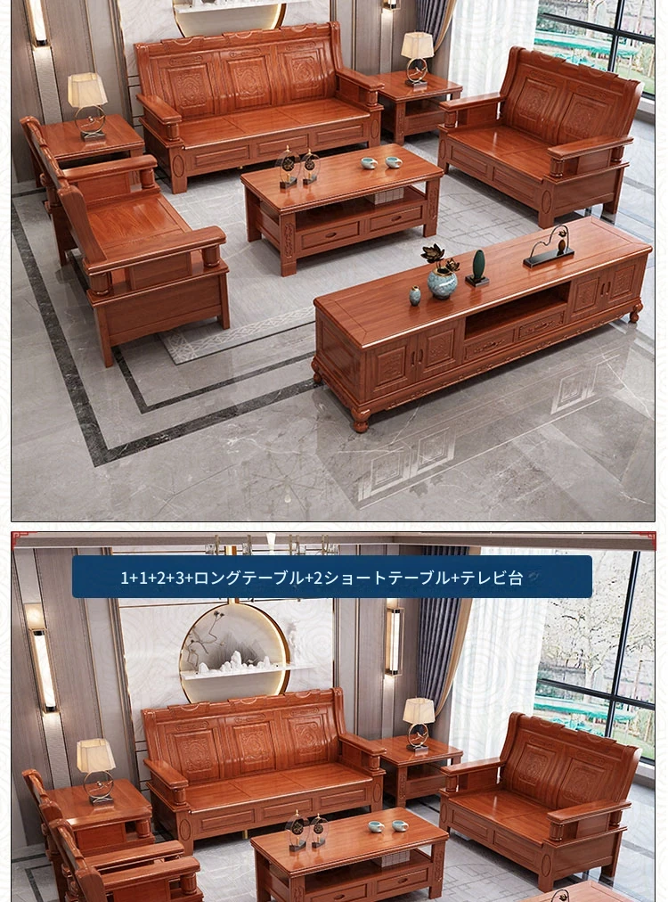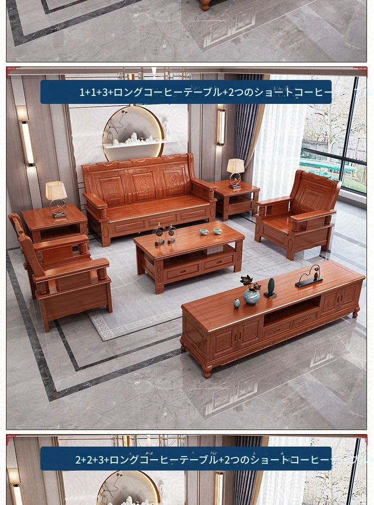 古風中式全実木ソファ「吉祥如意」—田舎のリビングにぴったりの質感木材使用、冬夏両用の3人掛けセット。温かみのあるデザインで、心安らぐ空間を演出します。