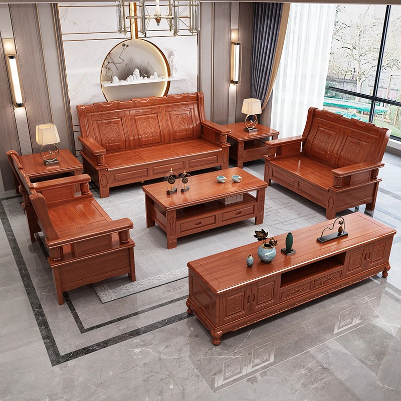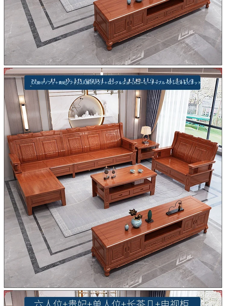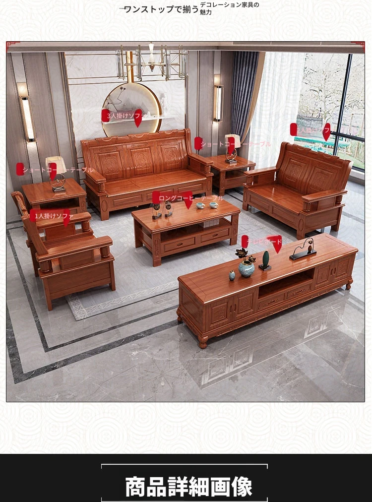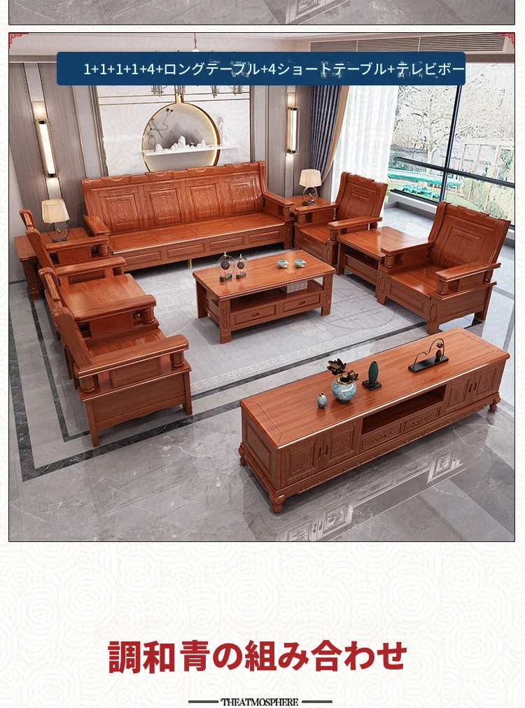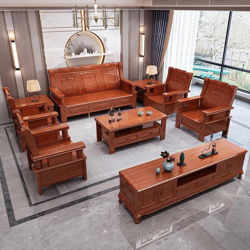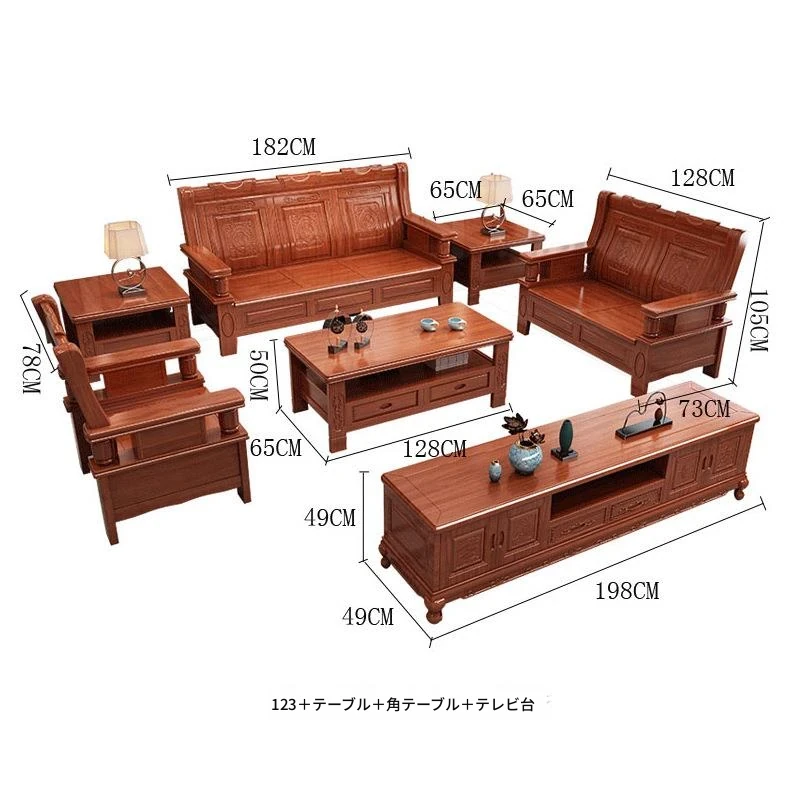 古風中式全実木ソファ「吉祥如意」—田舎のリビングにぴったりの質感木材使用、冬夏両用の3人掛けセット。温かみのあるデザインで、心安らぐ空間を演出します。