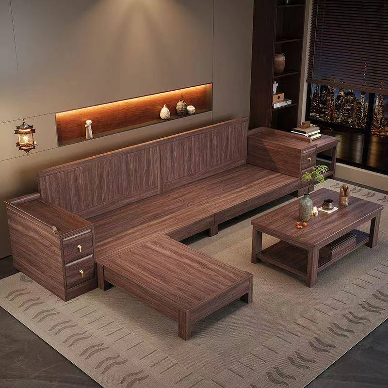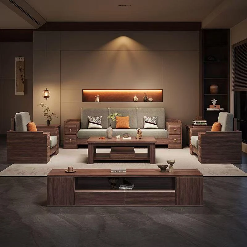 新中式ブラックウォルナット無垢材ソファセット|モダンでシンプルなデザイン|ファブリック収納付き|大小さまざまなお部屋に最適なリビング家具