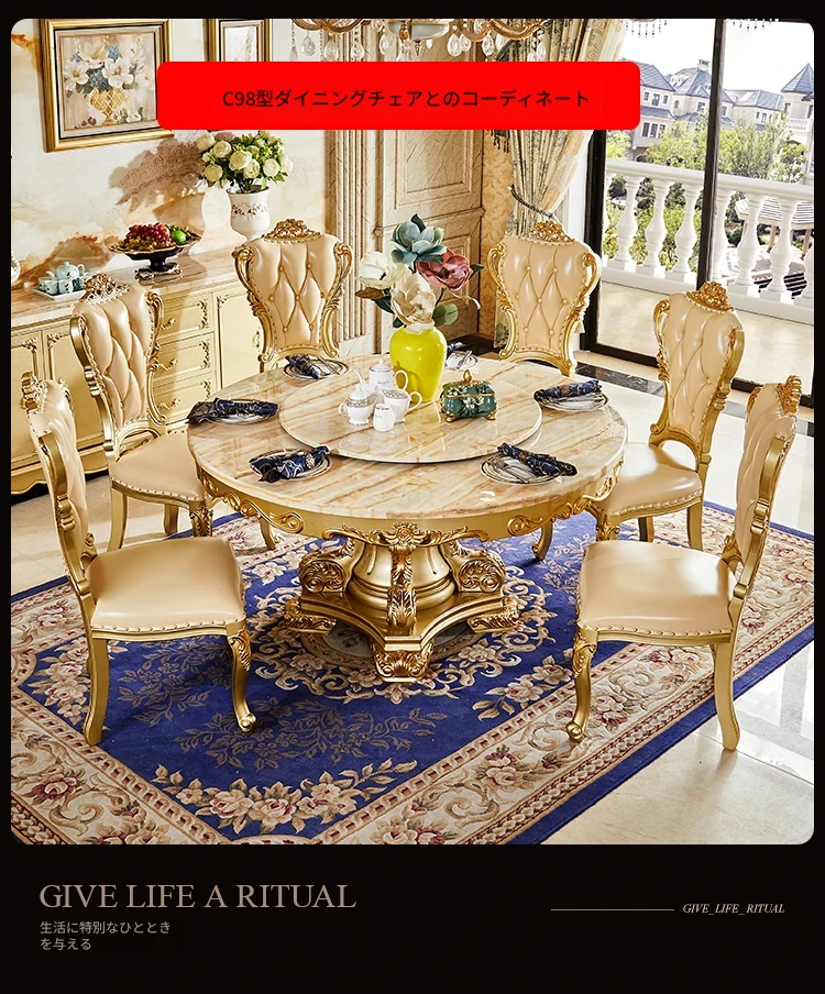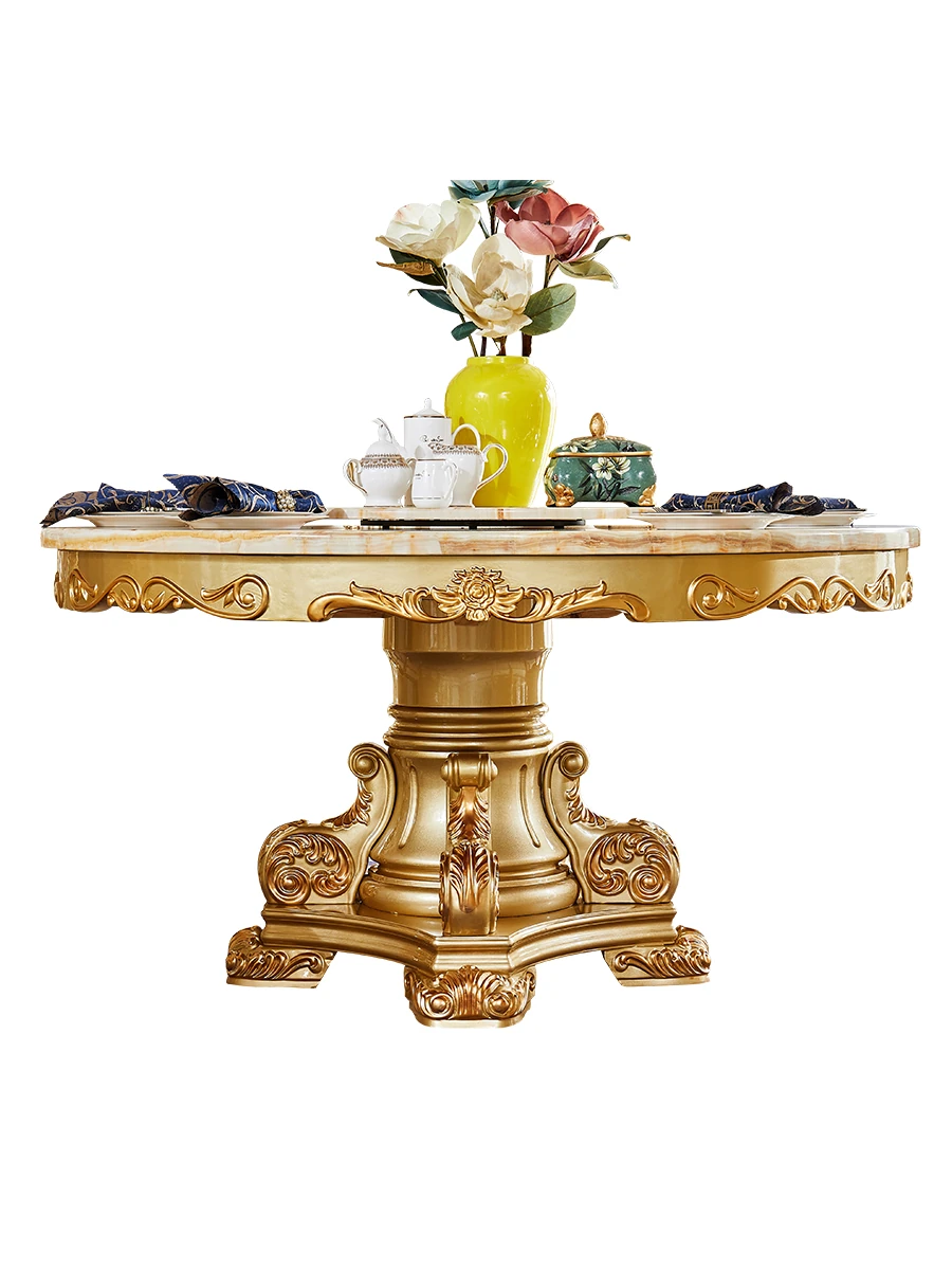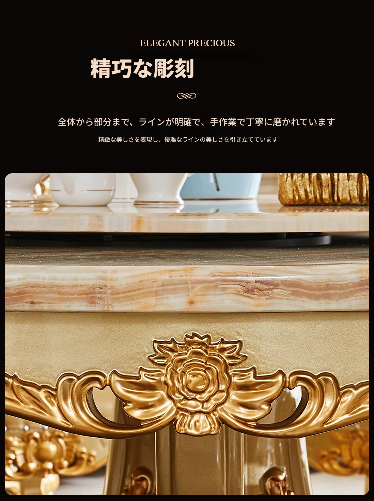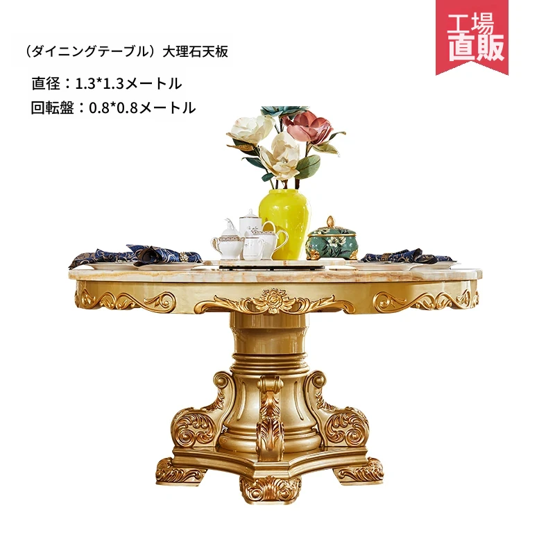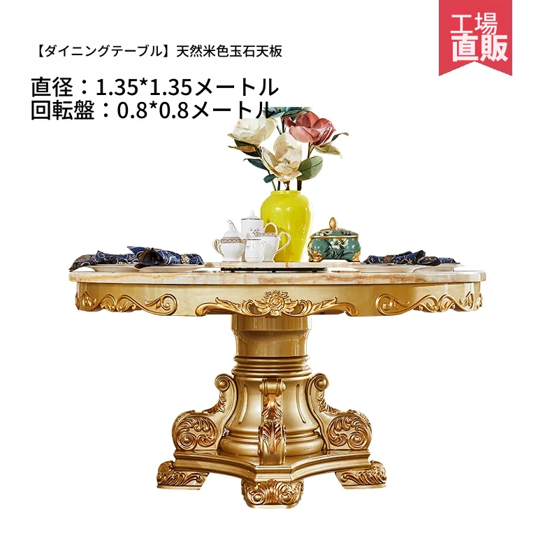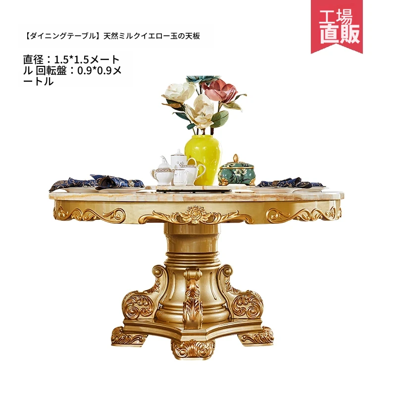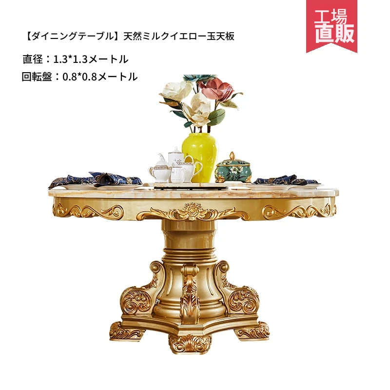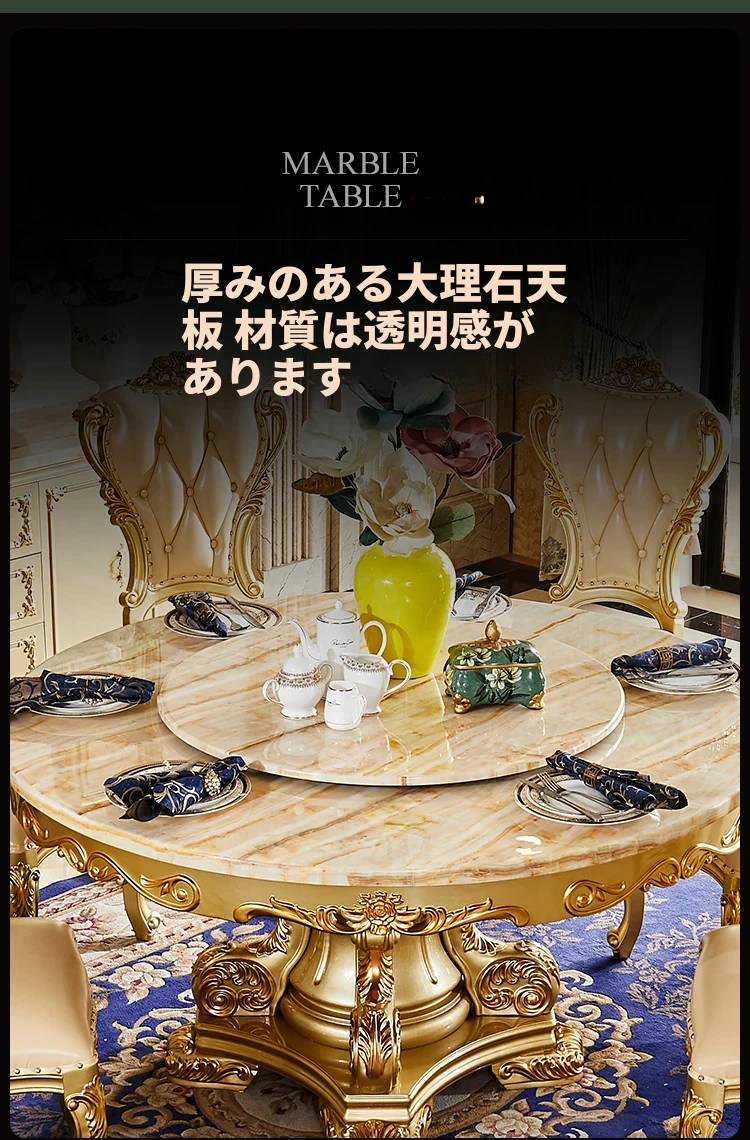 エレガントな欧式大理石ダイニングテーブル - ラウンドデザインの実木製、シャンパンカラー、回転式ターンテーブル付き。洗練された軽やかな雰囲気を演出し、家族や友人との特別な食卓を彩ります!