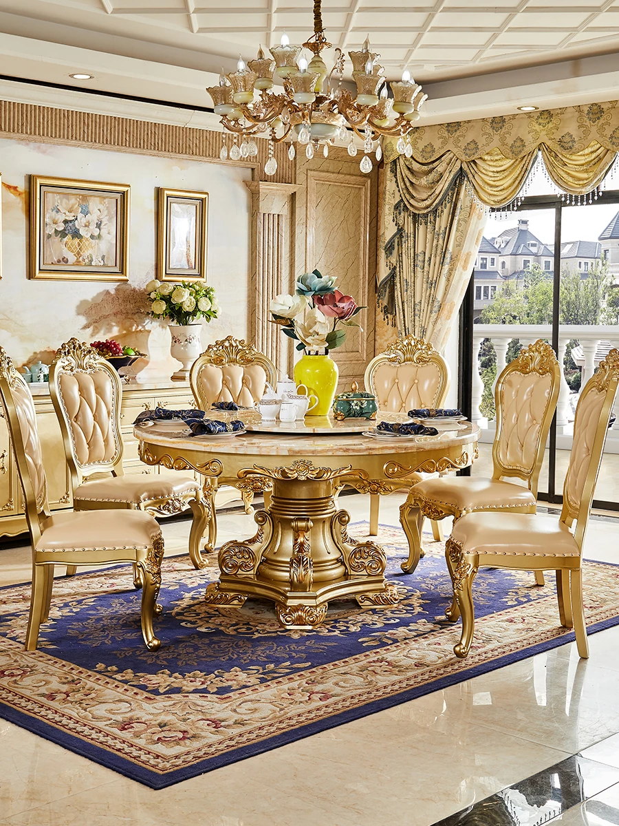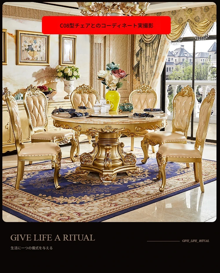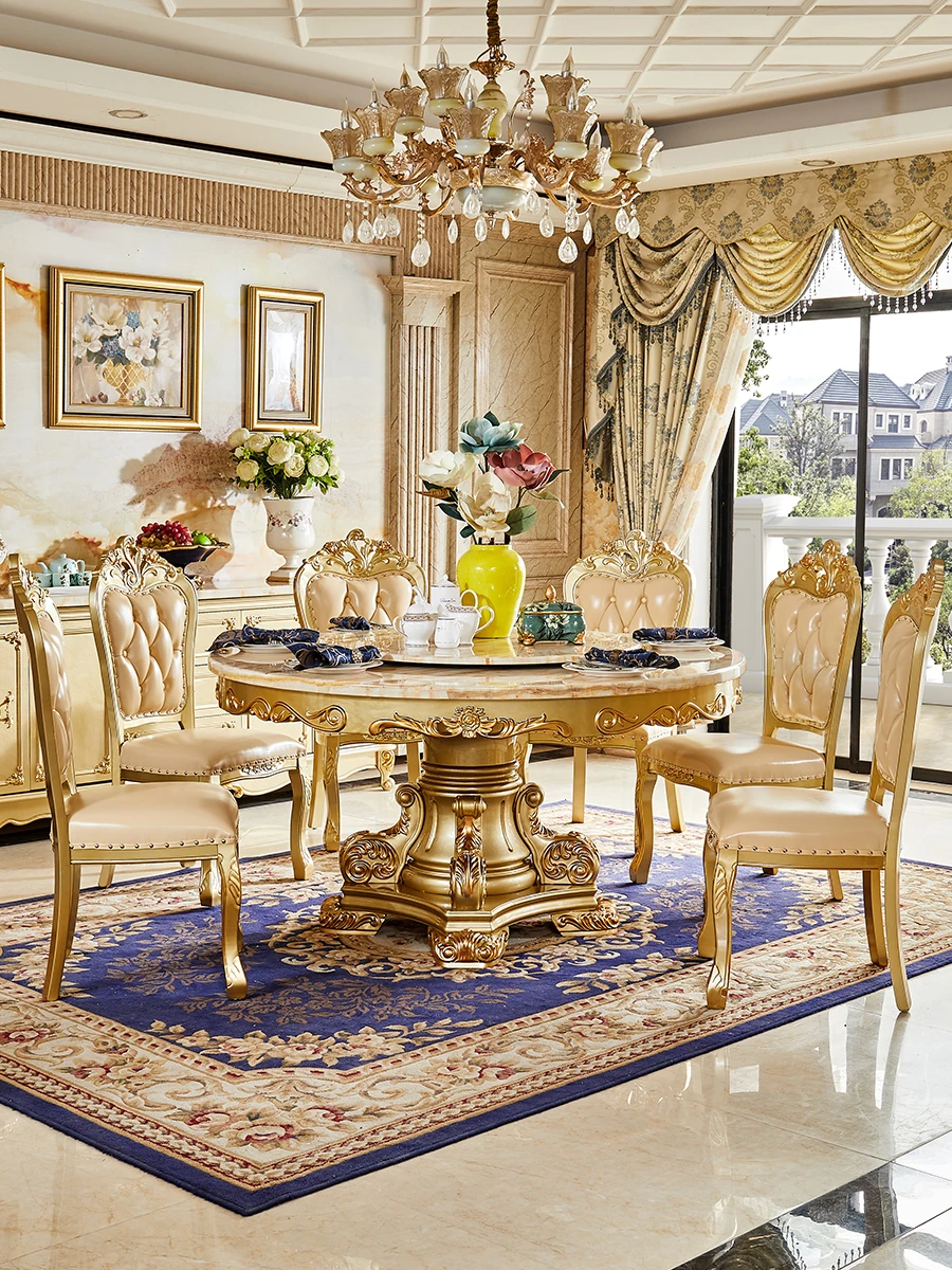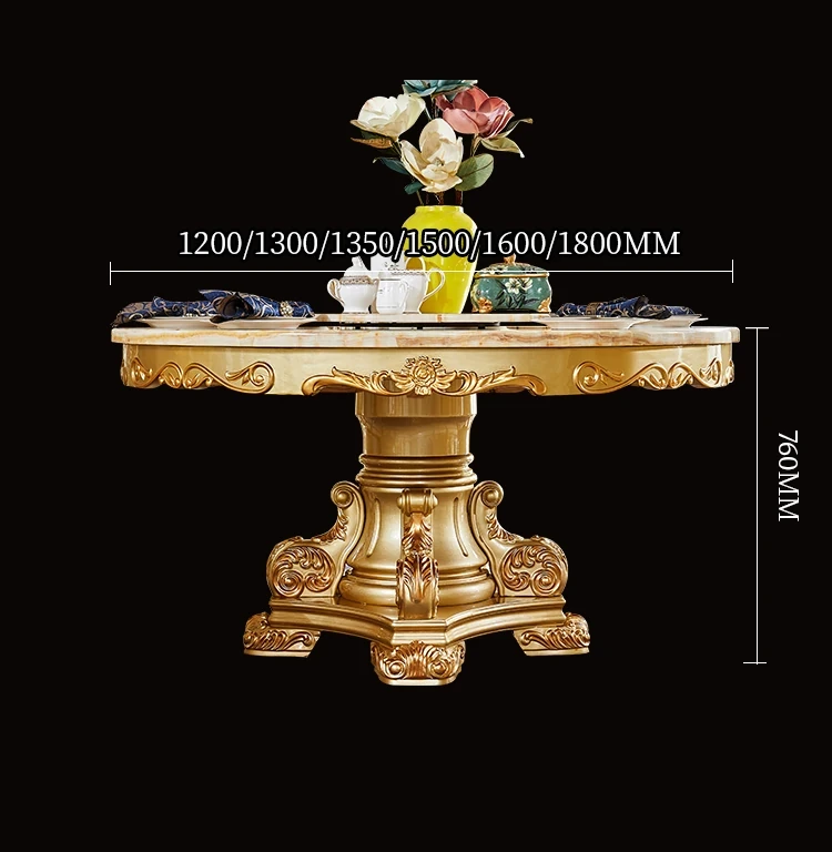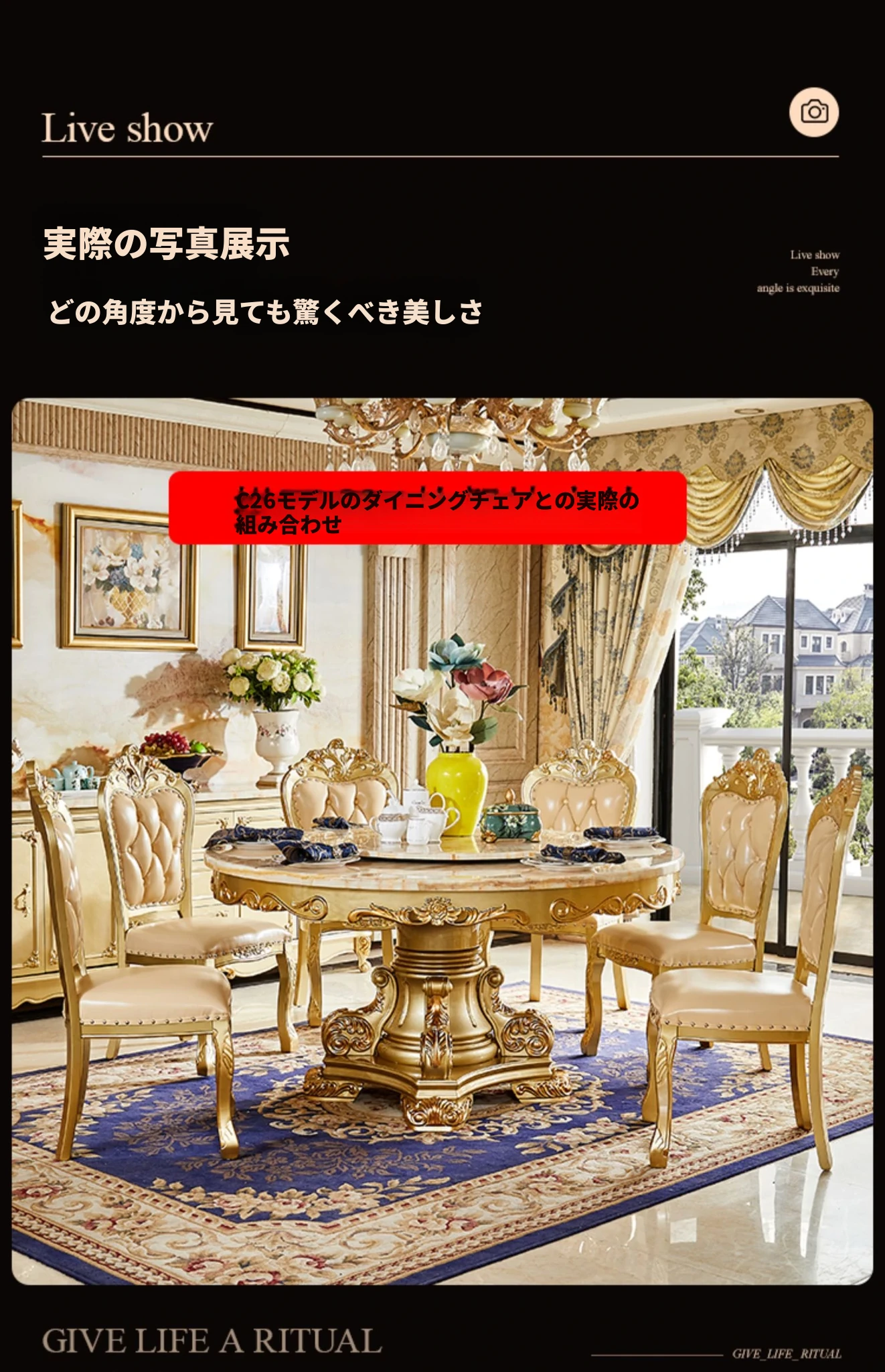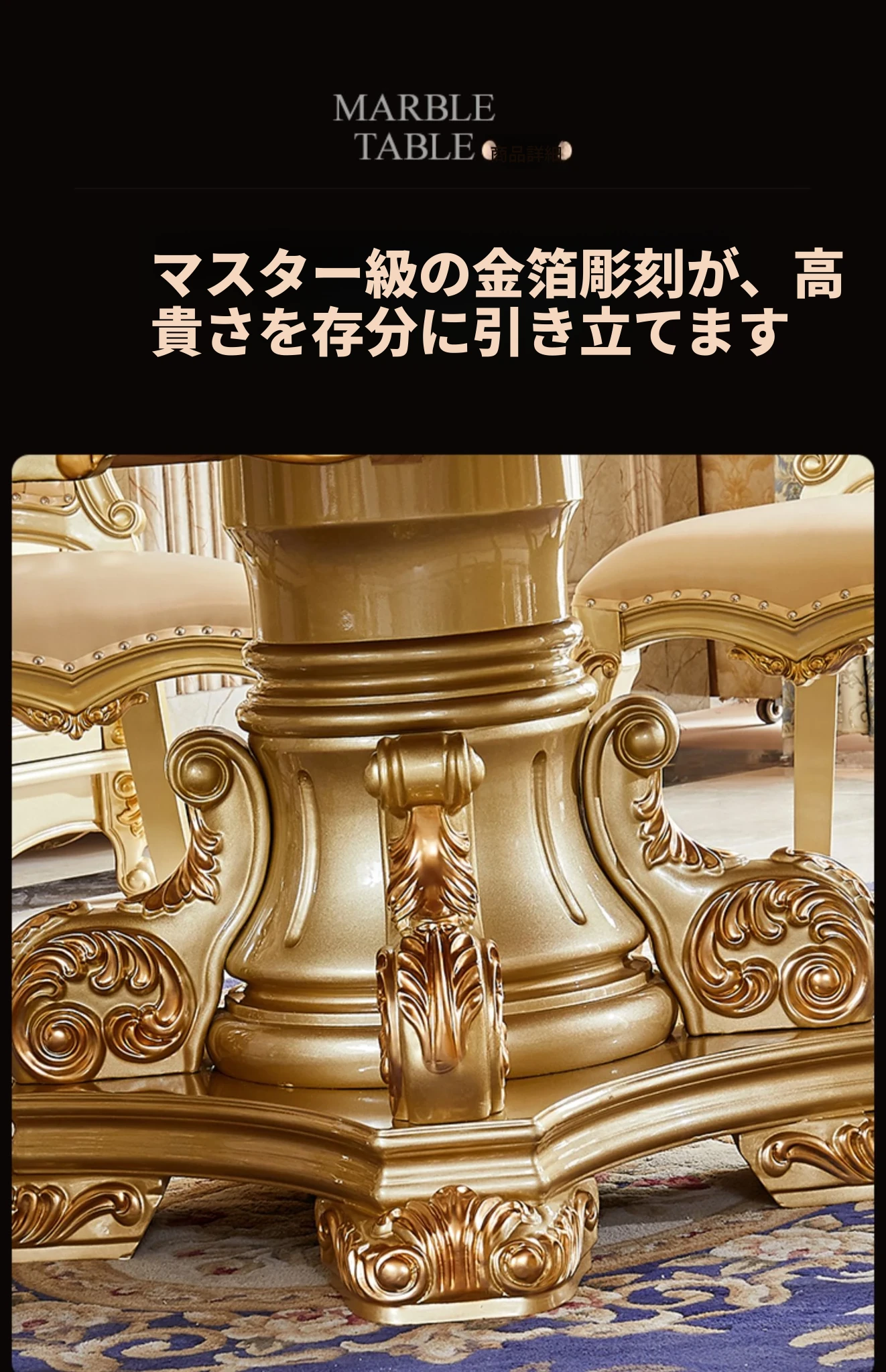 エレガントな欧式大理石ダイニングテーブル - ラウンドデザインの実木製、シャンパンカラー、回転式ターンテーブル付き。洗練された軽やかな雰囲気を演出し、家族や友人との特別な食卓を彩ります!