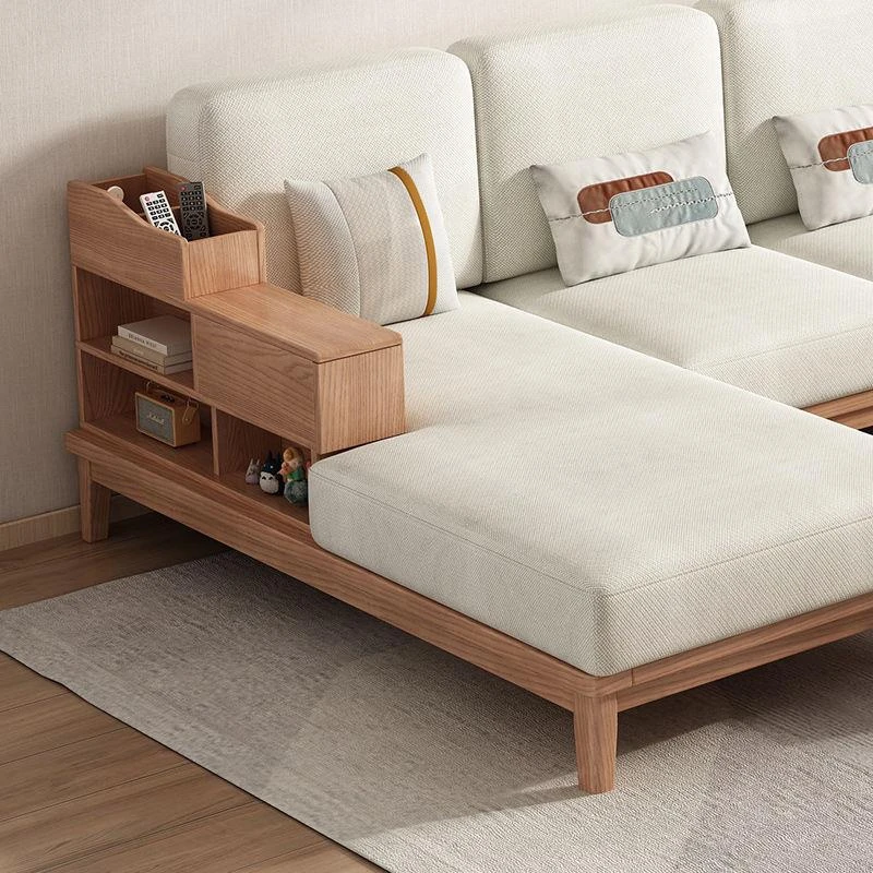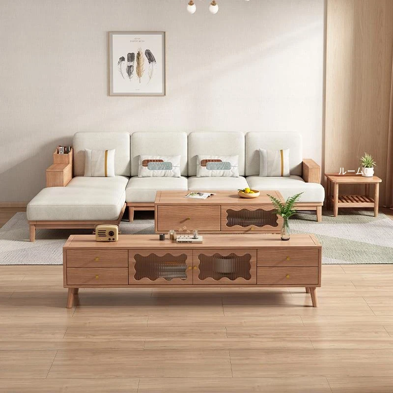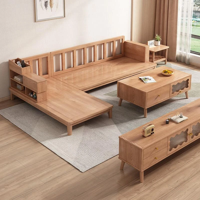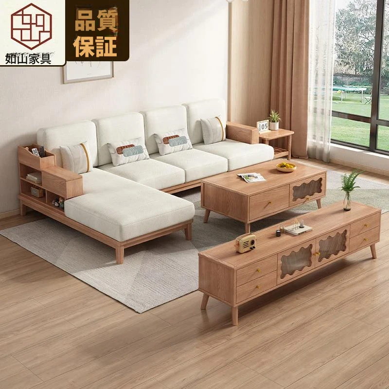 クリーム風ホワイトアッシュ木製ソファ&コーヒーテーブルセット - 家庭用リビングルームに最適!中小型住宅にもぴったりな実木収納家具。優れたデザインで、居心地の良い空間を演出します。