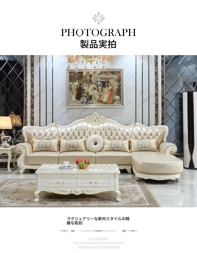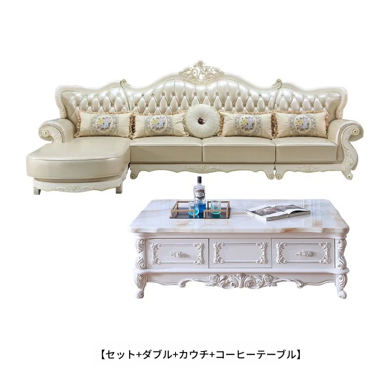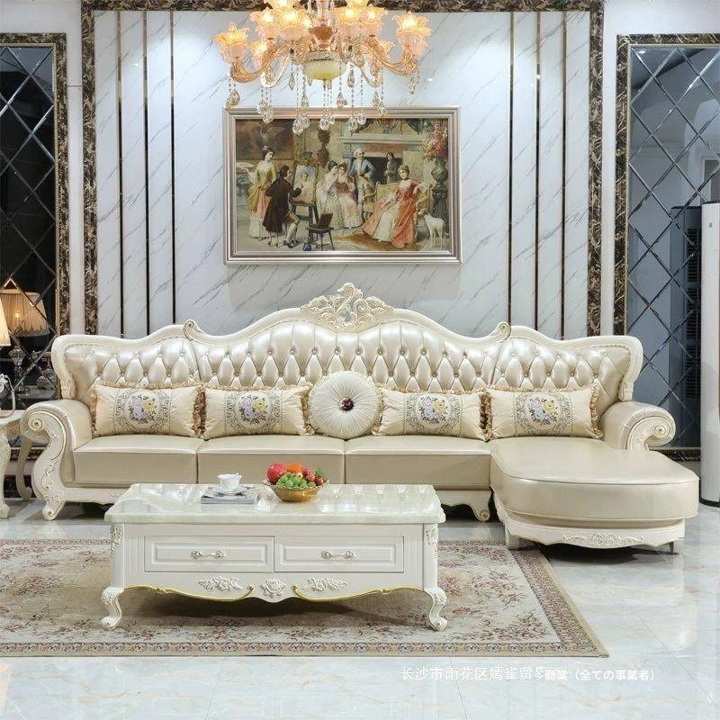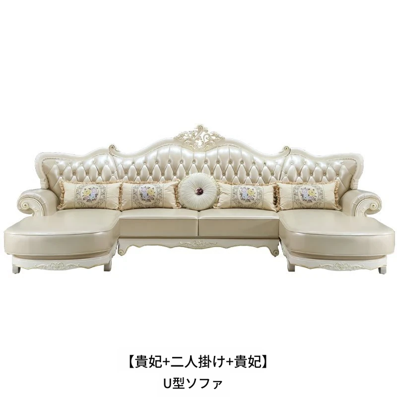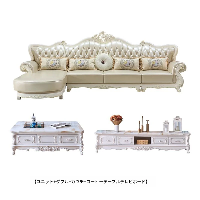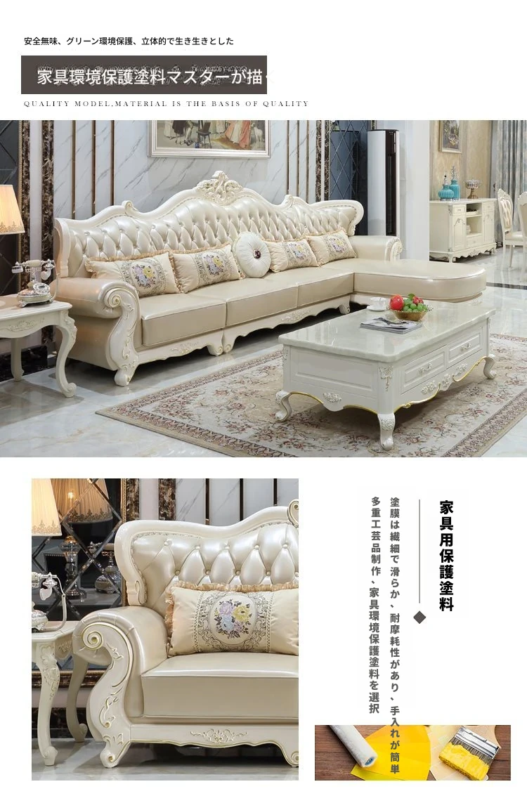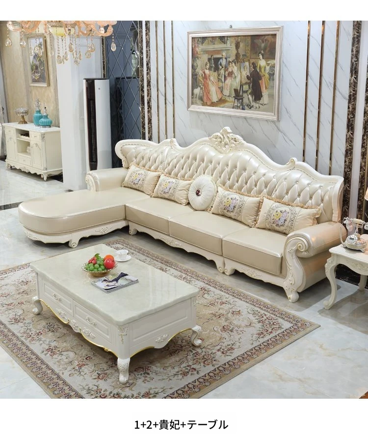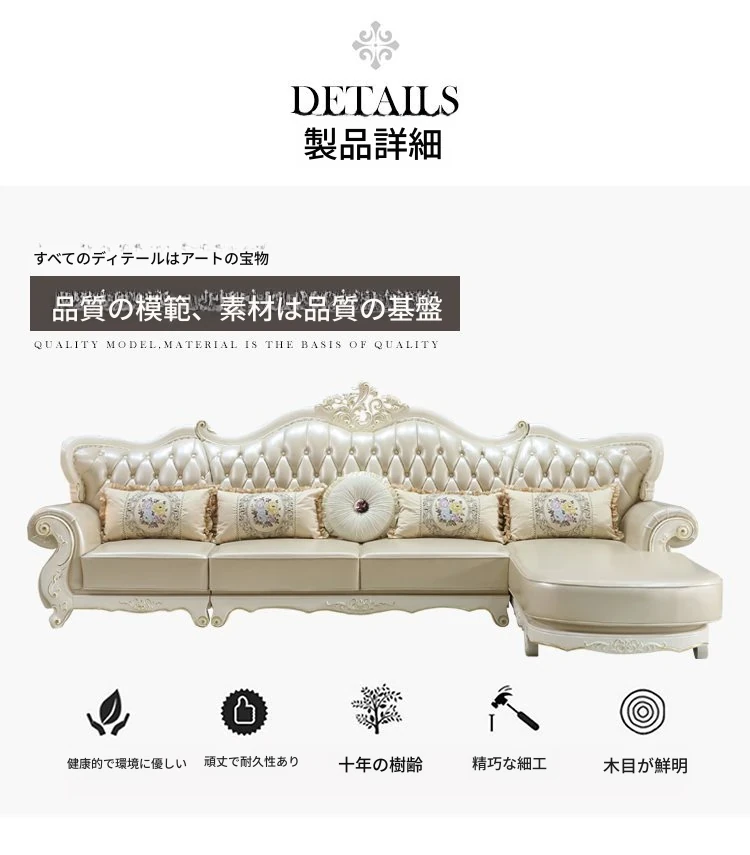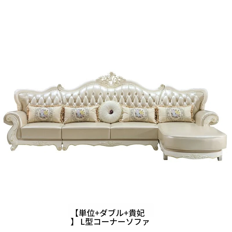 エレガントなヨーロピアンコーナーソファ0688 - 小型リビングに最適!フランス風デザインの4人掛け、全木製のL字型ソファ。スタイリッシュで快適、家族や友人との楽しいひとときを演出します。