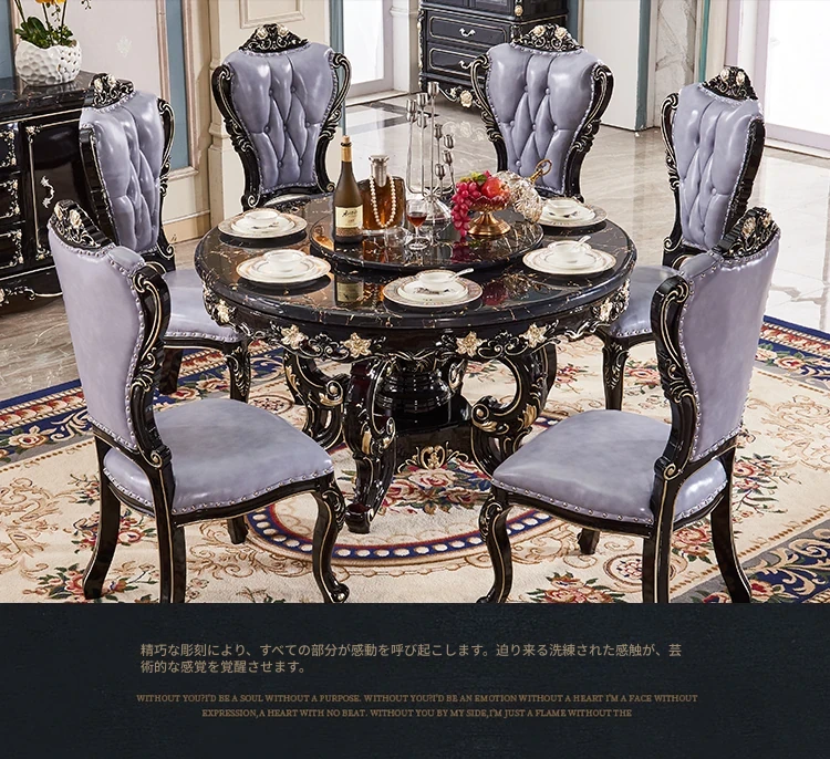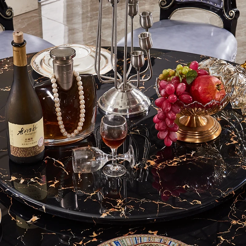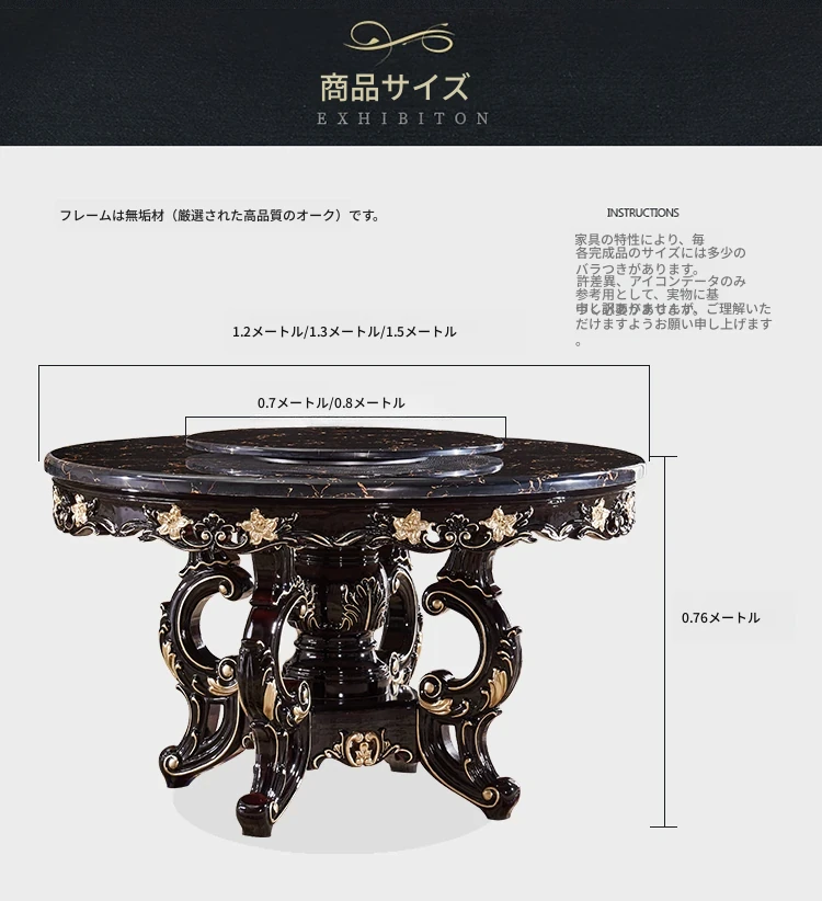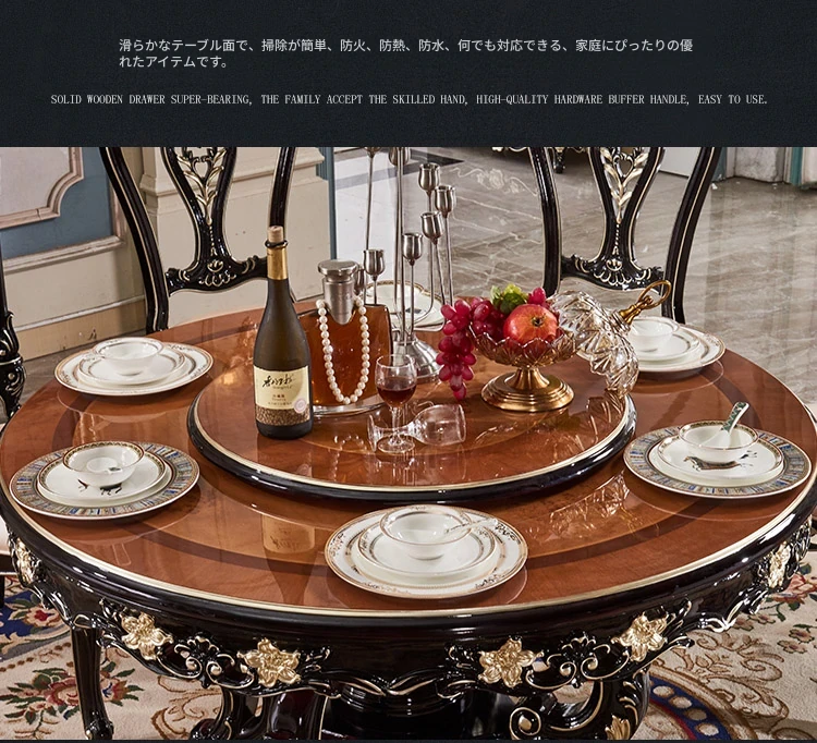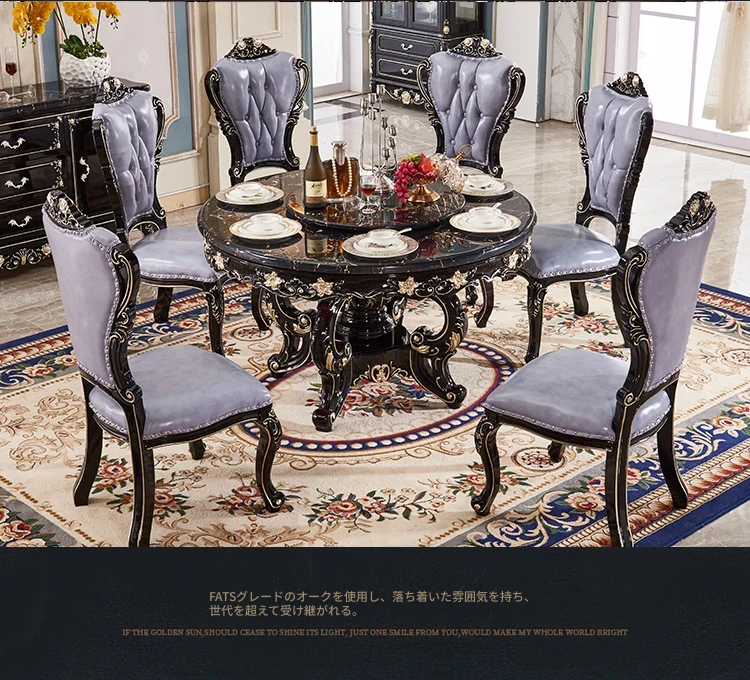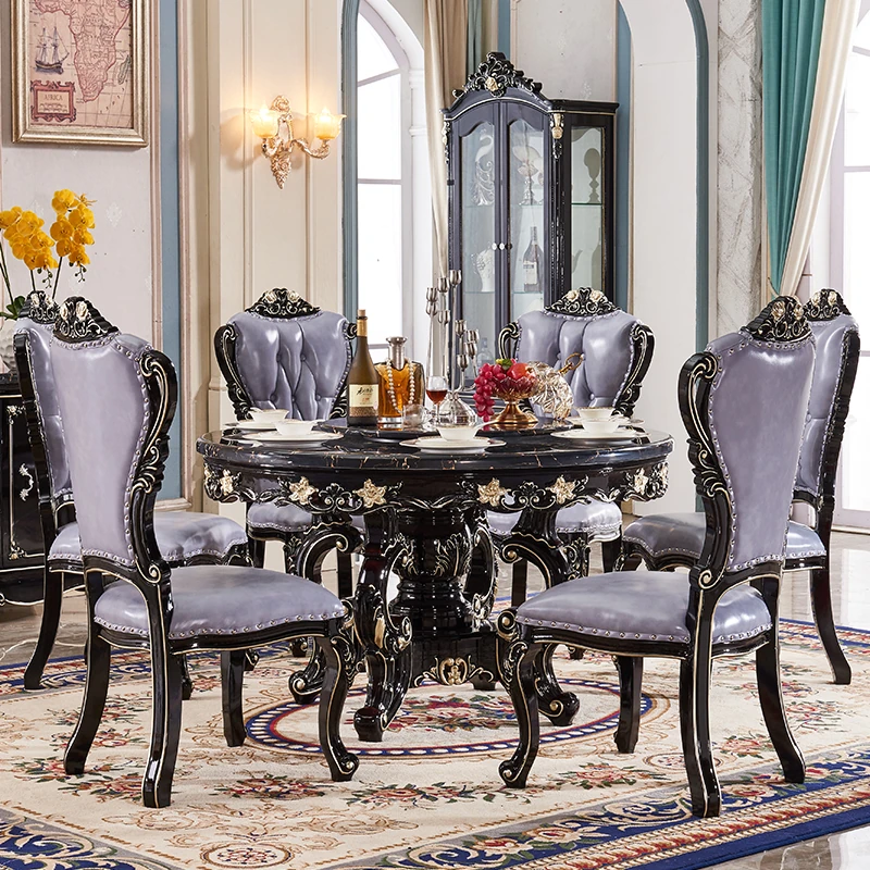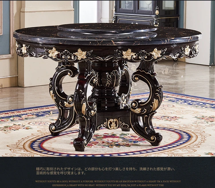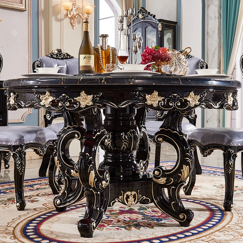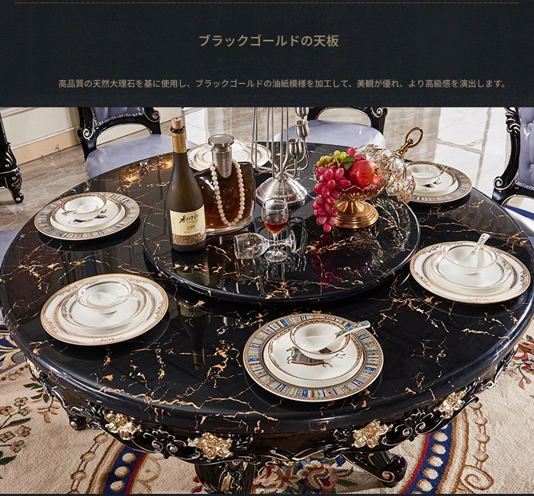 エレガントな欧風大理石ダイニングテーブルセット|アメリカンスタイルのラウンドテーブル|ブラックエボニー色|フレンチスタイルの無垢材製|小さなスペースにも最適な家庭用テーブルセット