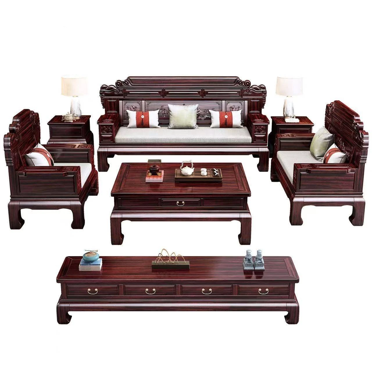 新中式ウッド製高級ソファセットYS-999 - 大小兼用、冬夏対応、古典的な彫刻デザインで、リビングルームに優雅さをプラス!