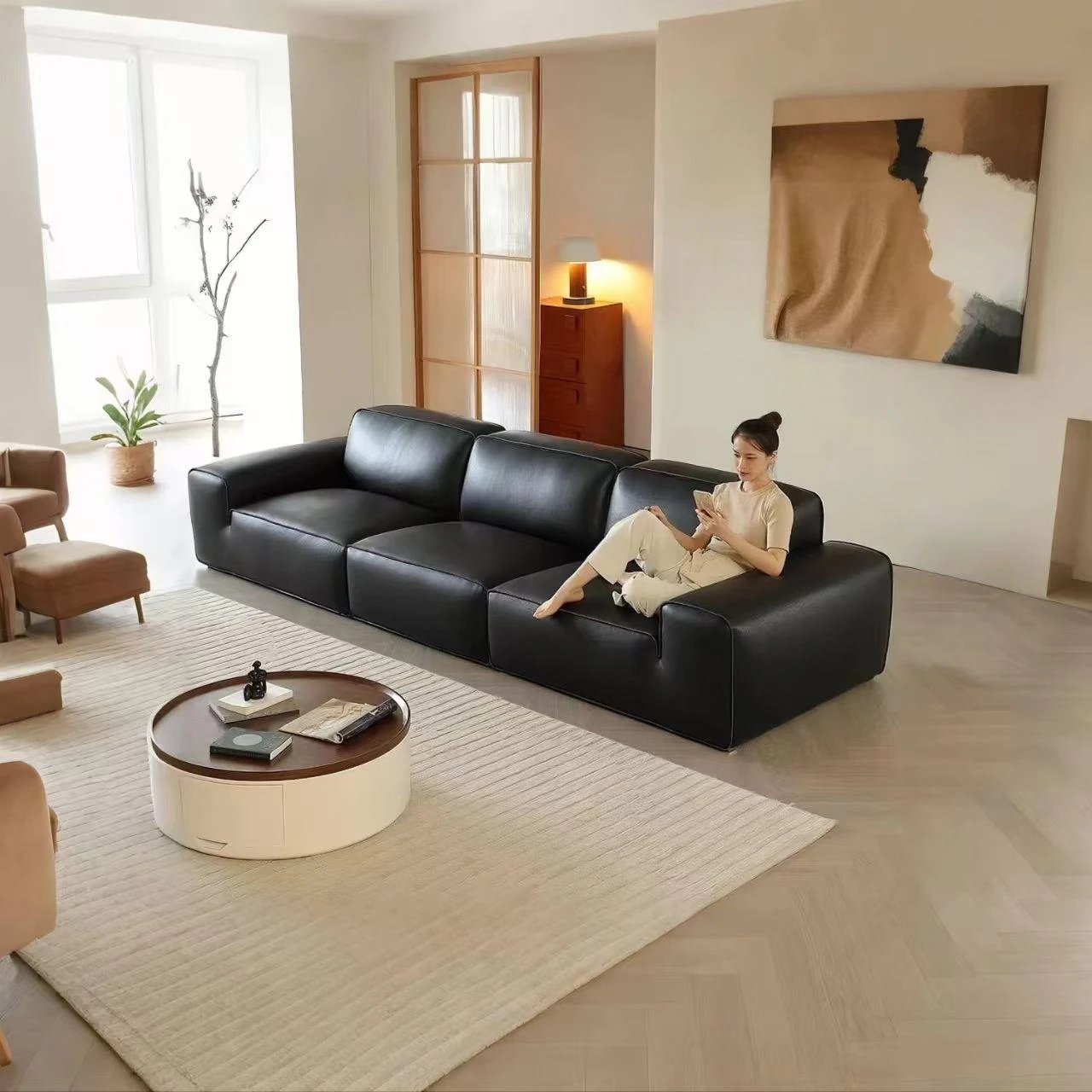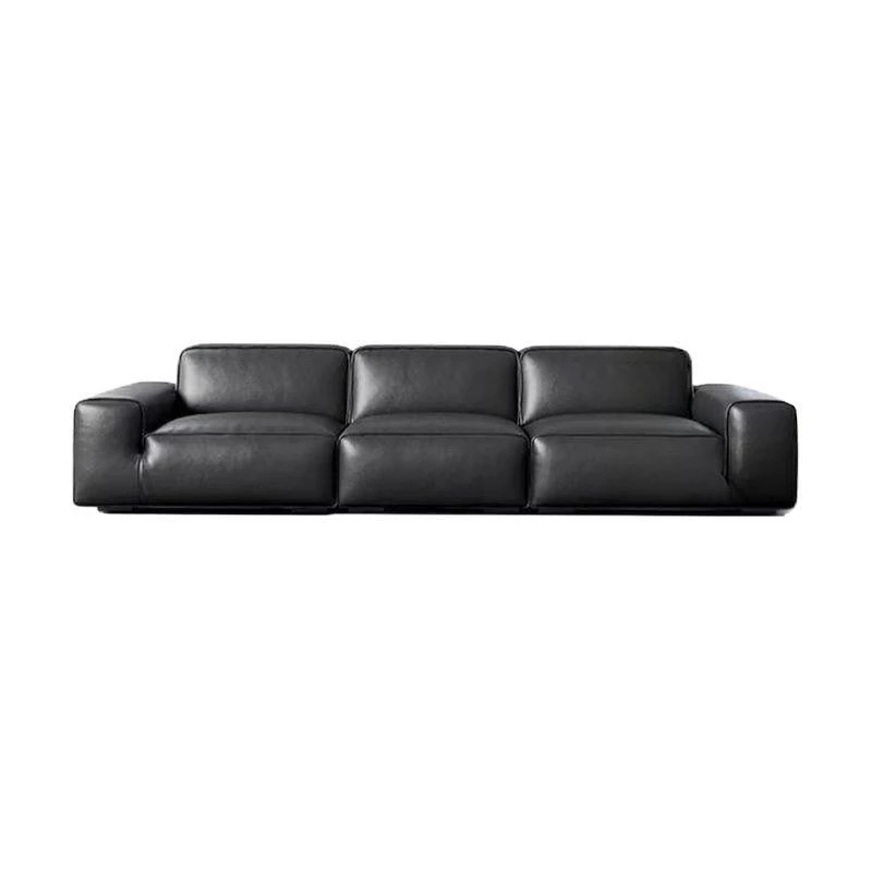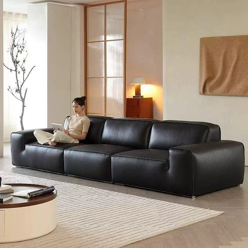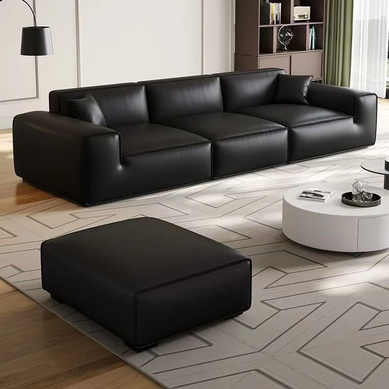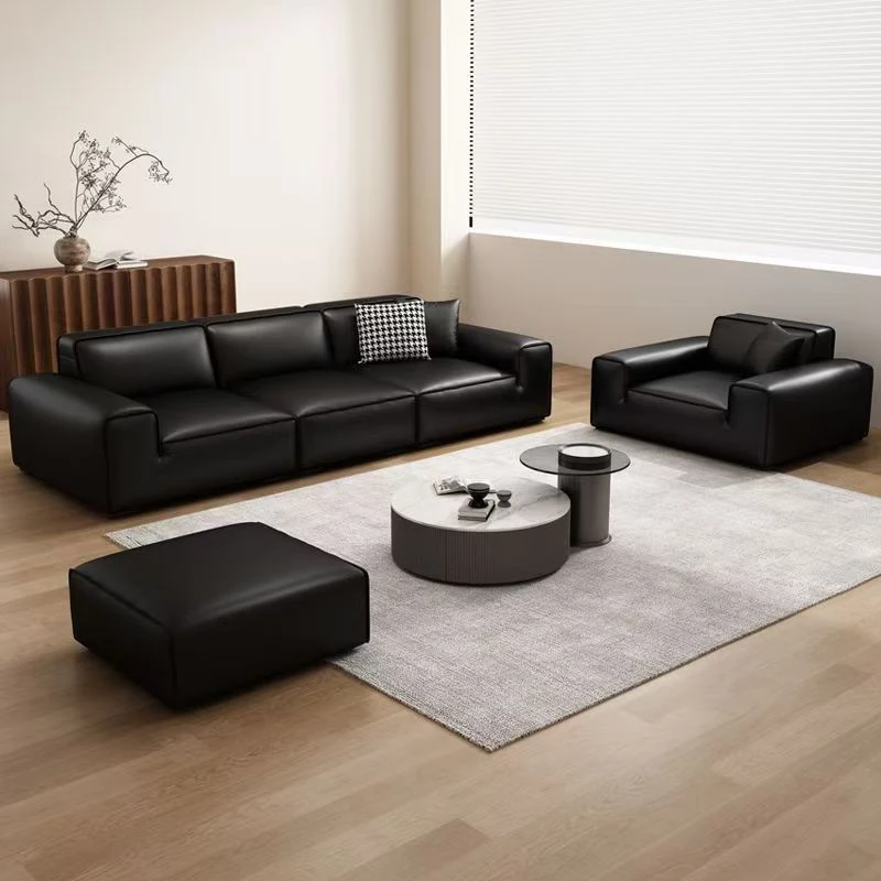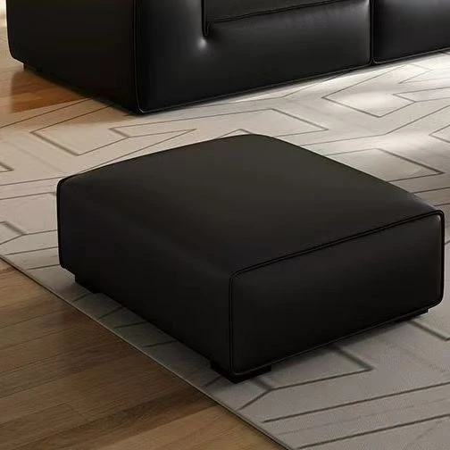 フランス風ミニマリストのブラックレザーソファ - 小型住宅に最適な直線的な豆腐ブロックデザイン。軽やかなラグジュアリーとレトロ感を兼ね備えたイタリアンヴィラスタイル。あなたの空間をスタイリッシュに演出します!
