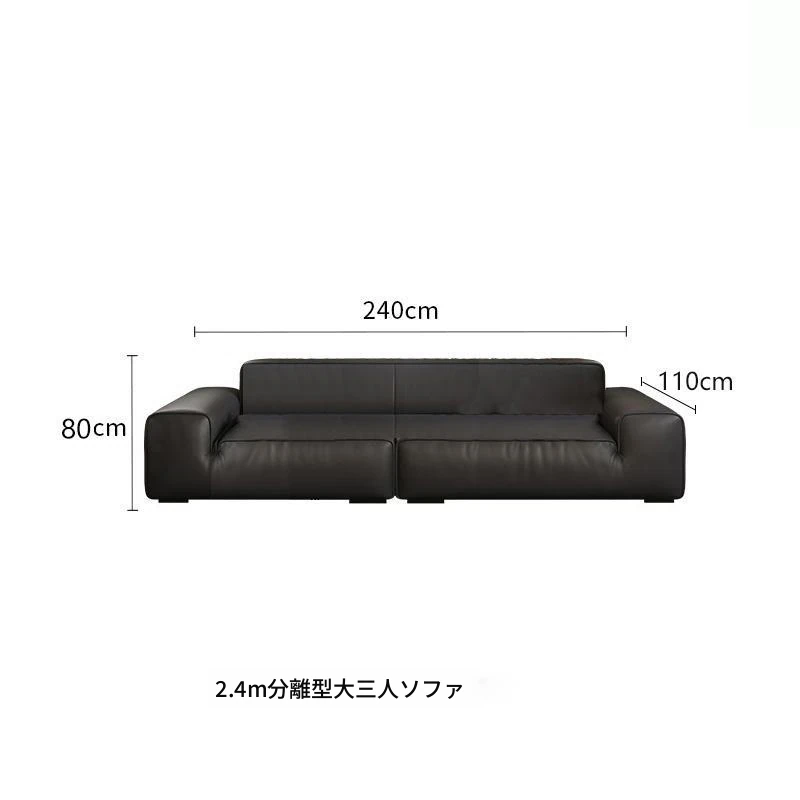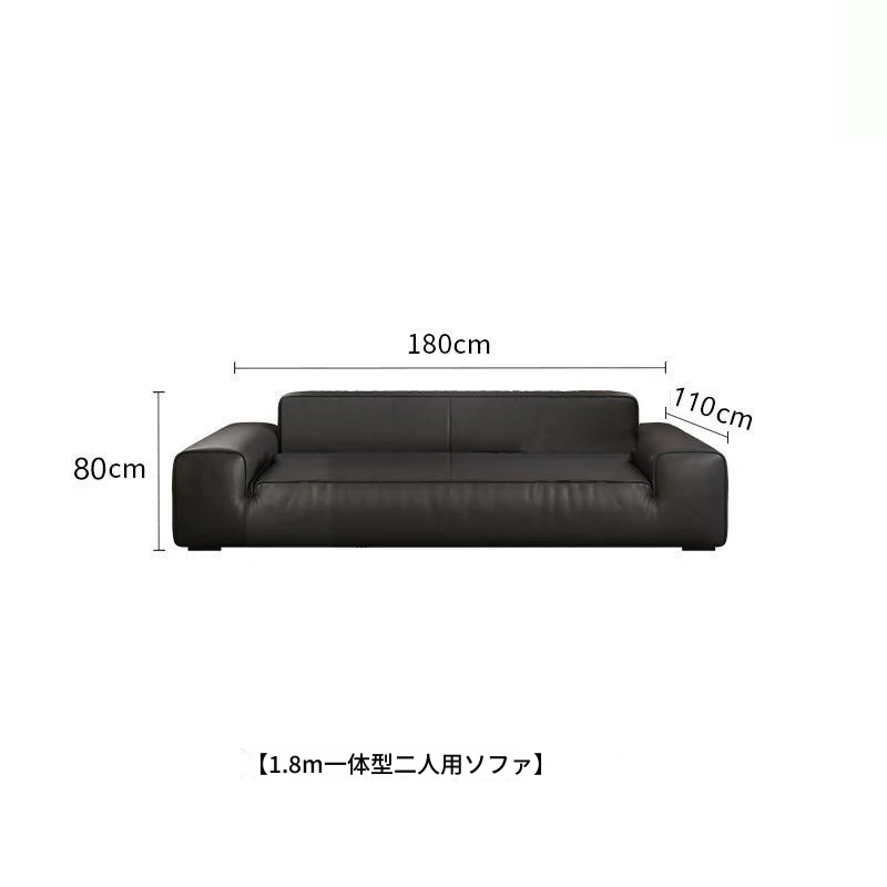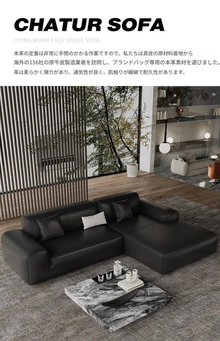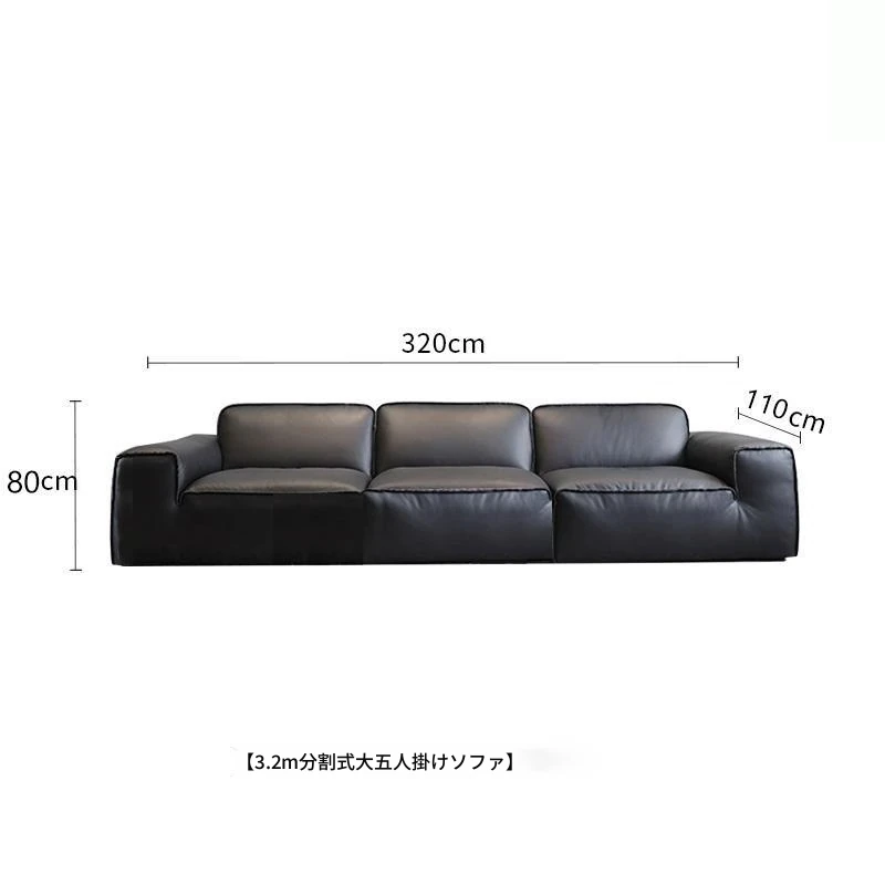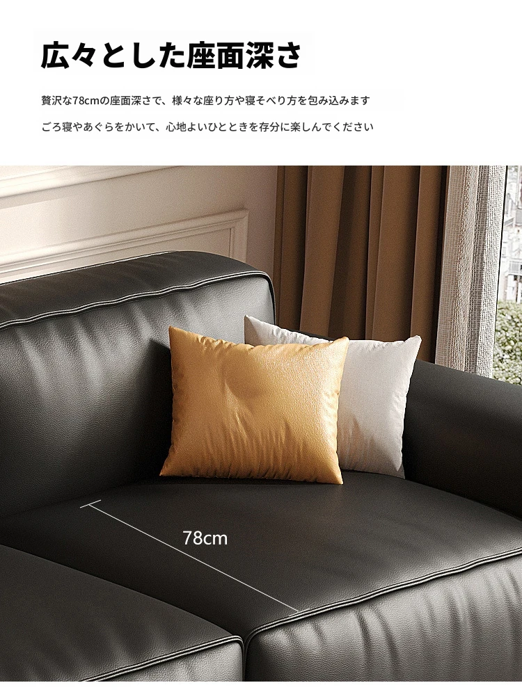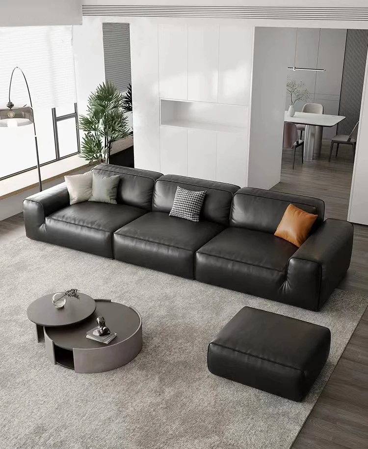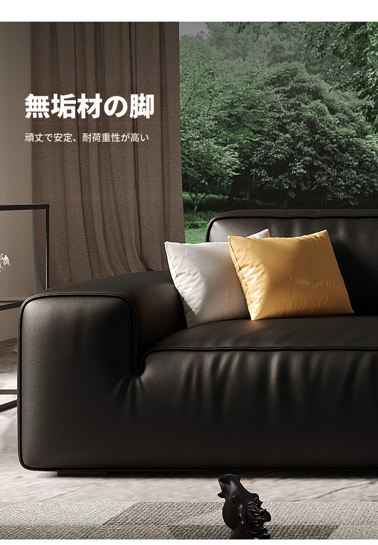 イタリアンミニマリズムの高級感漂うブラックレザーソファ|本革使用の贅沢なリビング用ソファセット|シンプルで洗練されたデザインの直線的なスタイル