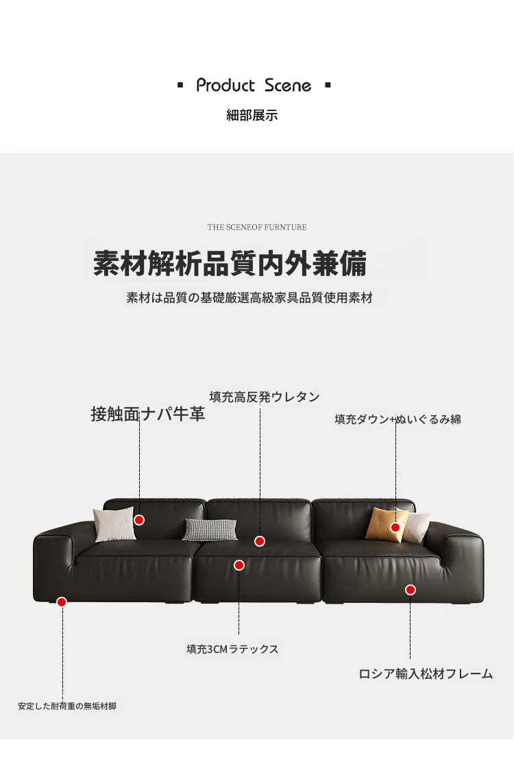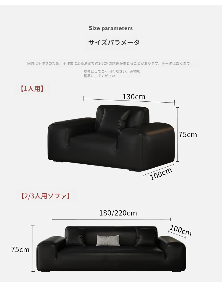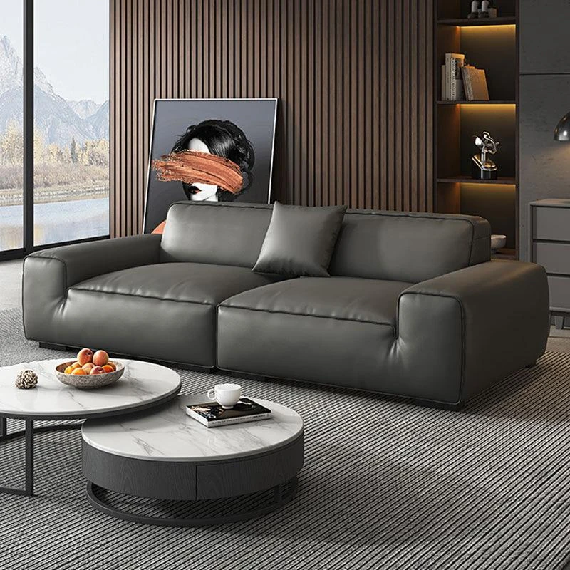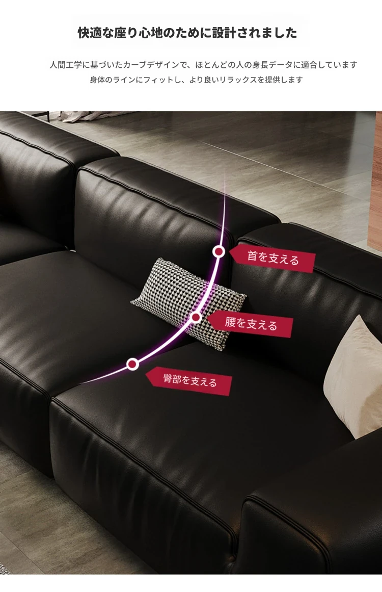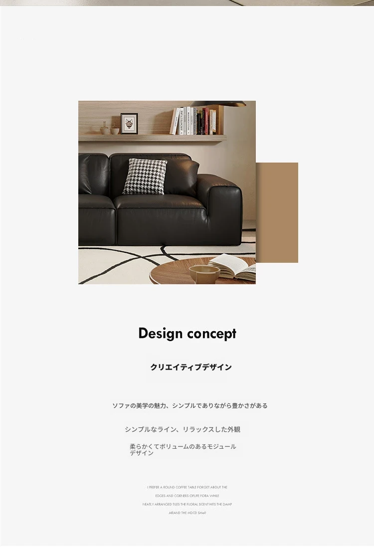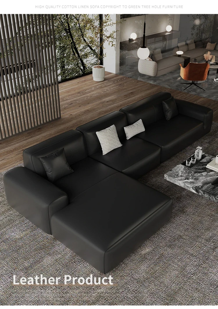 イタリアンミニマリズムの高級感漂うブラックレザーソファ|本革使用の贅沢なリビング用ソファセット|シンプルで洗練されたデザインの直線的なスタイル