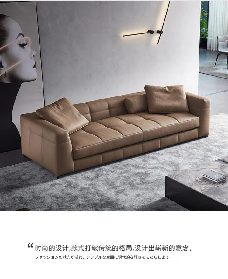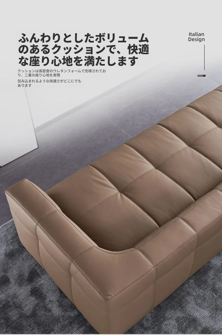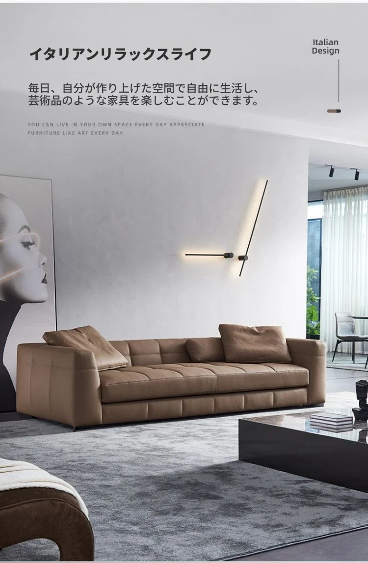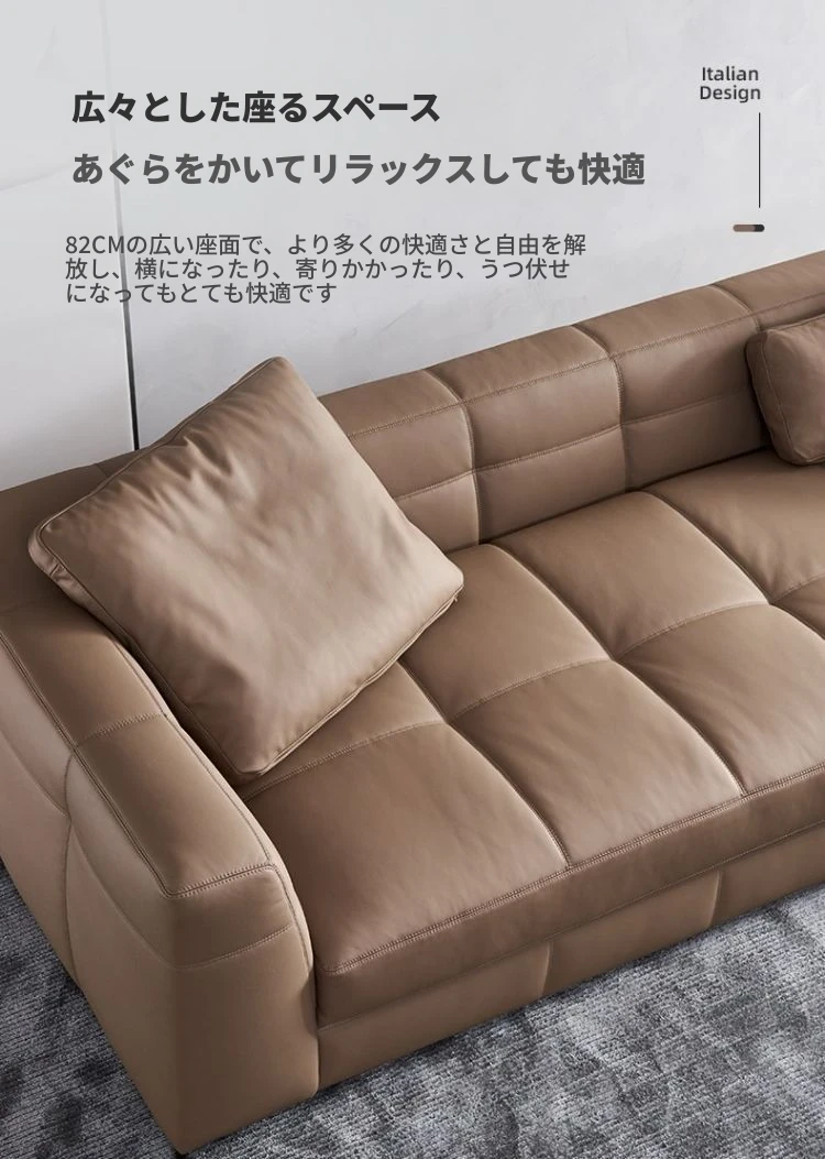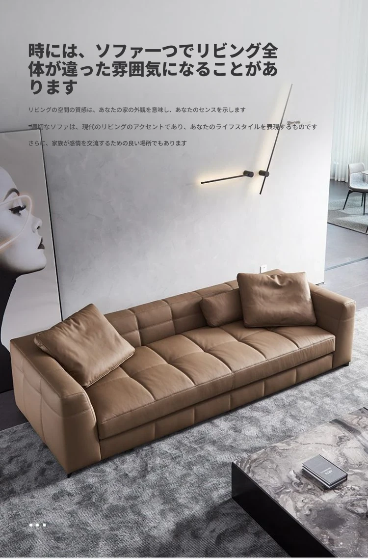 イタリアンミニマリストデザインの本革ブレザーソファ - モダンでシンプルなリビングルームに最適なトップグレイン牛革の直線デザインソファ。洗練されたスタイルで、贅沢な座り心地を提供します。