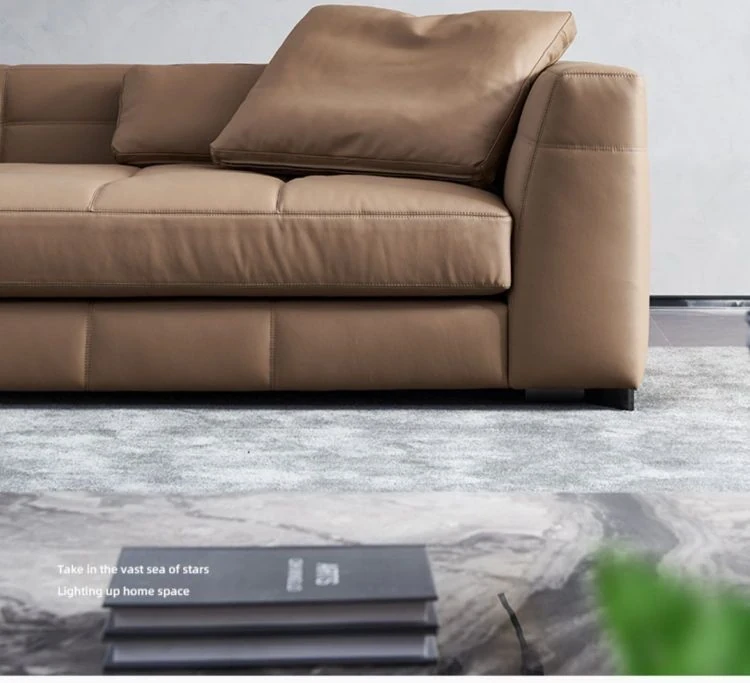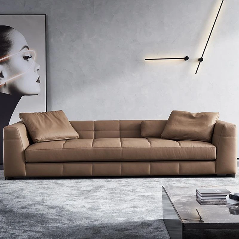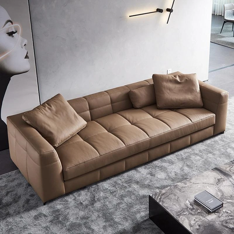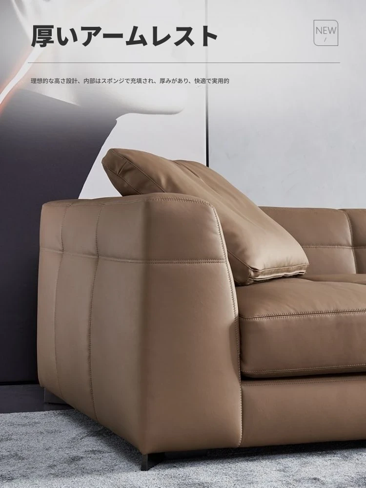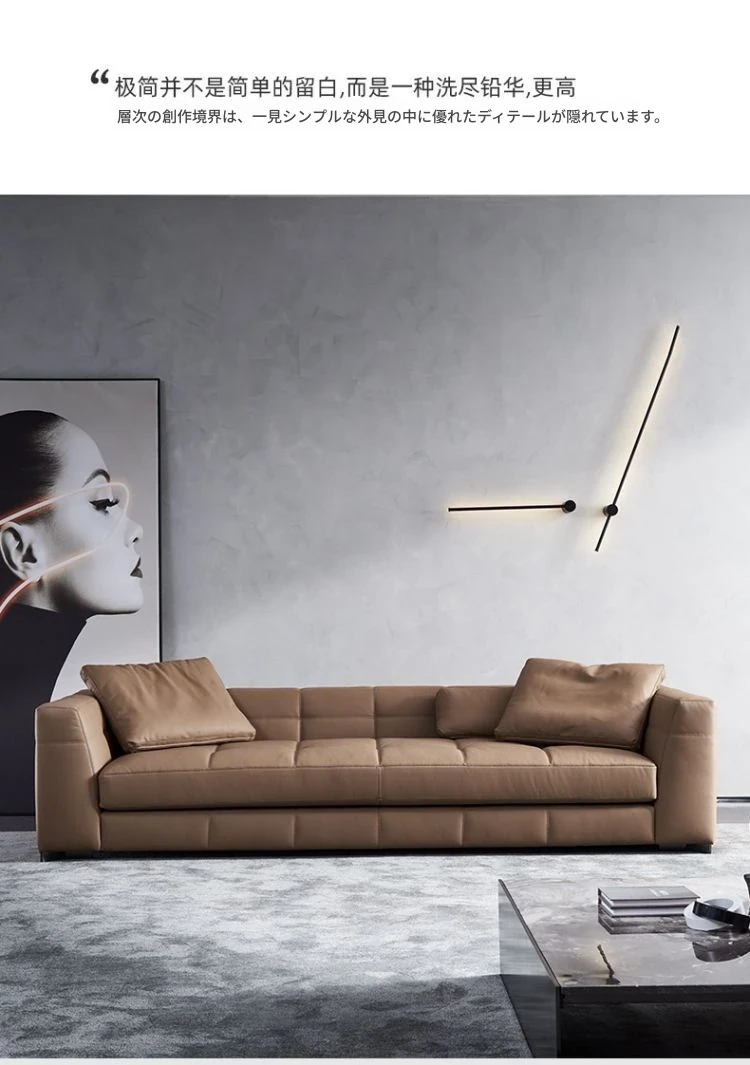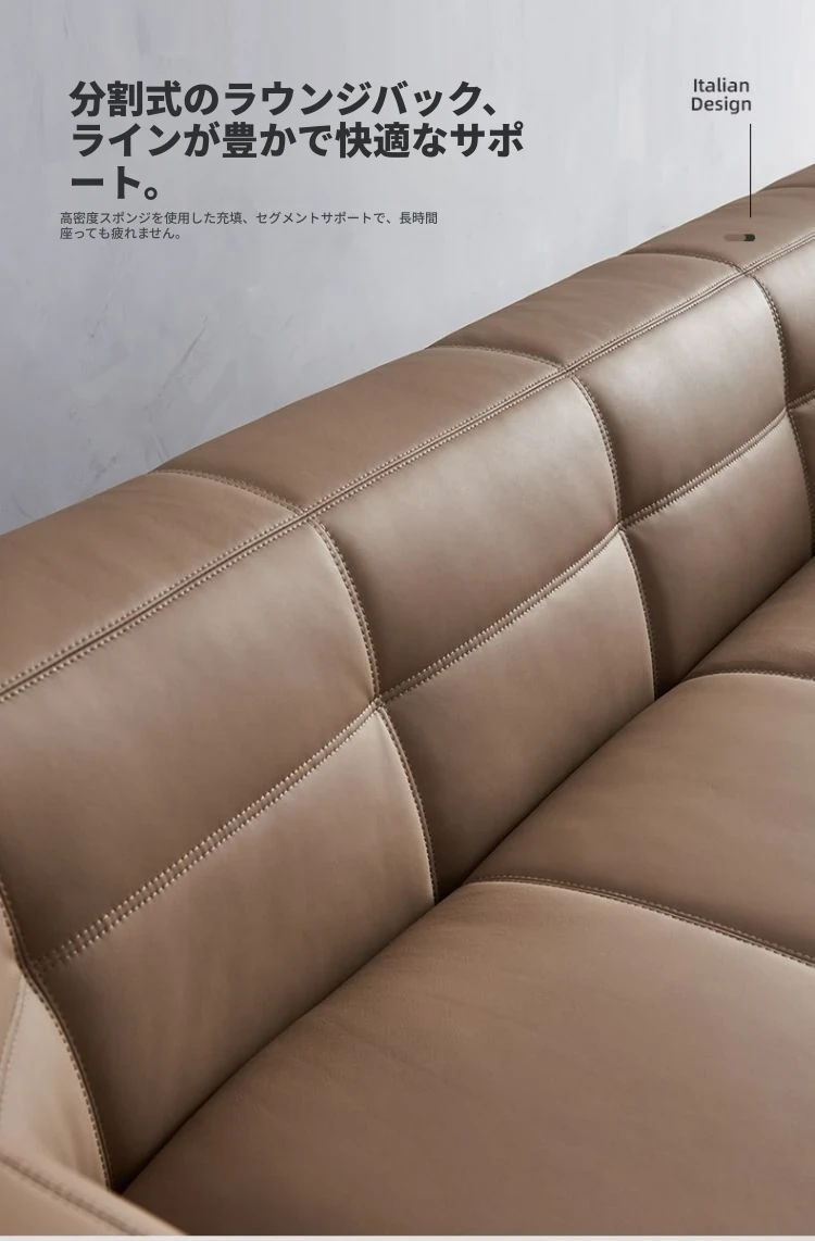イタリアンミニマリストデザインの本革ブレザーソファ - モダンでシンプルなリビングルームに最適なトップグレイン牛革の直線デザインソファ。洗練されたスタイルで、贅沢な座り心地を提供します。