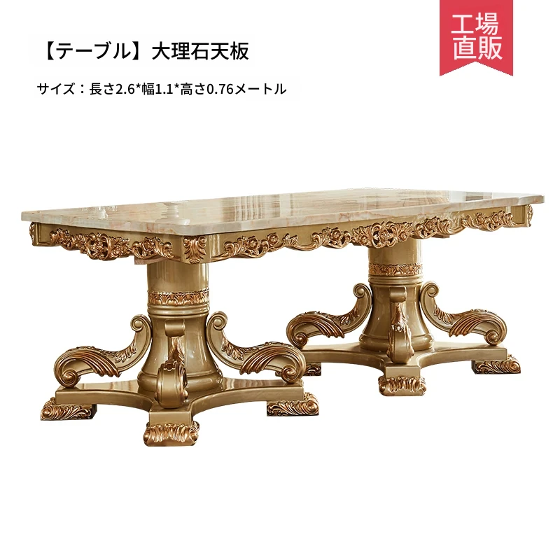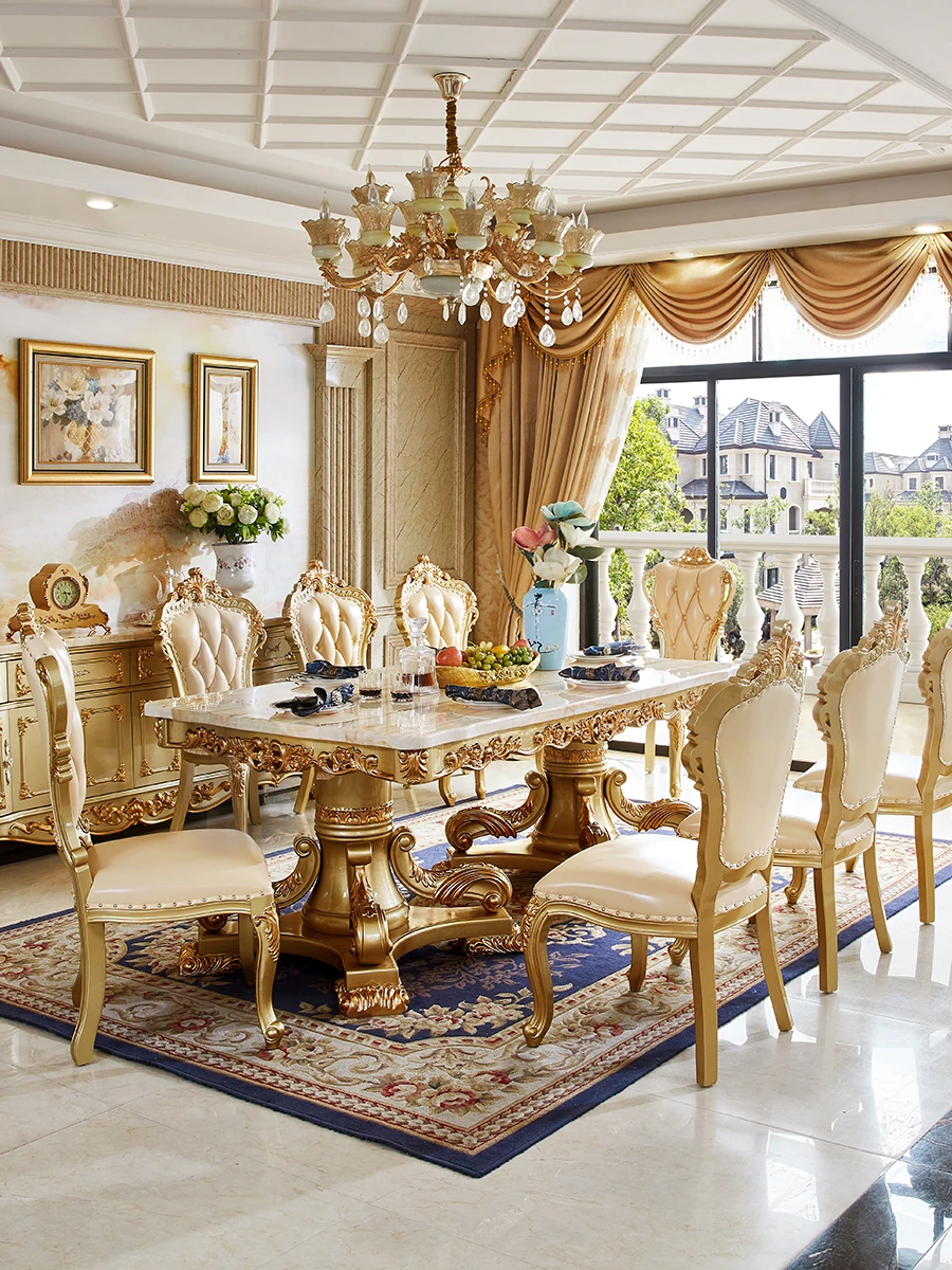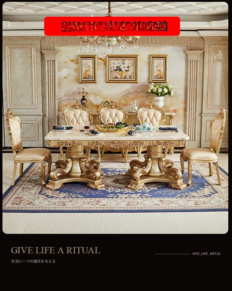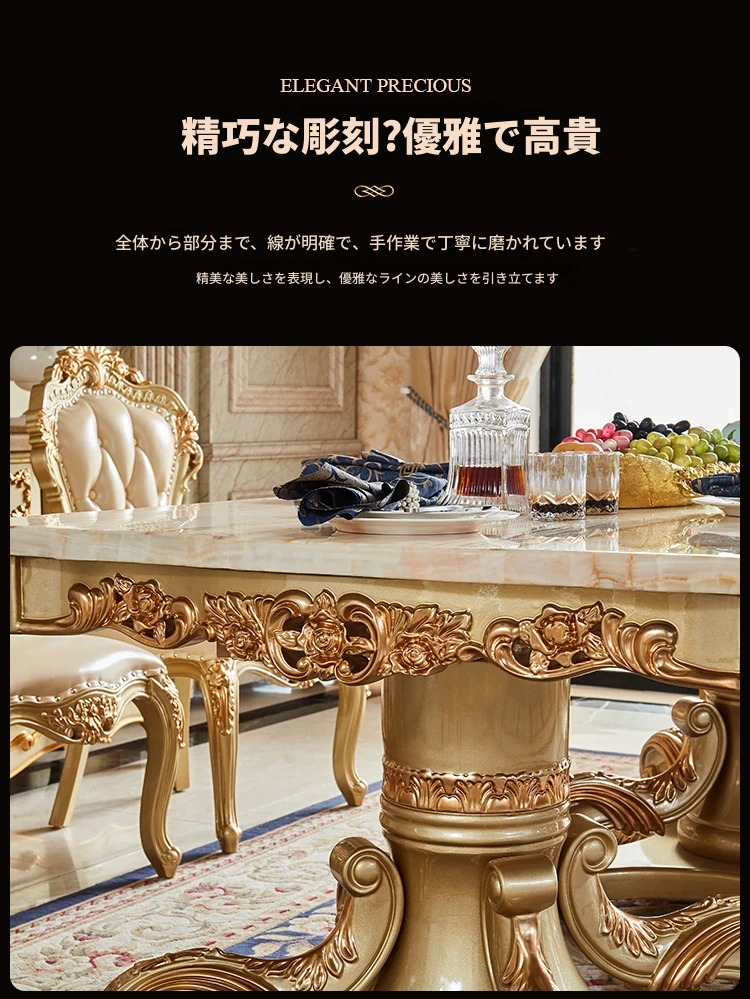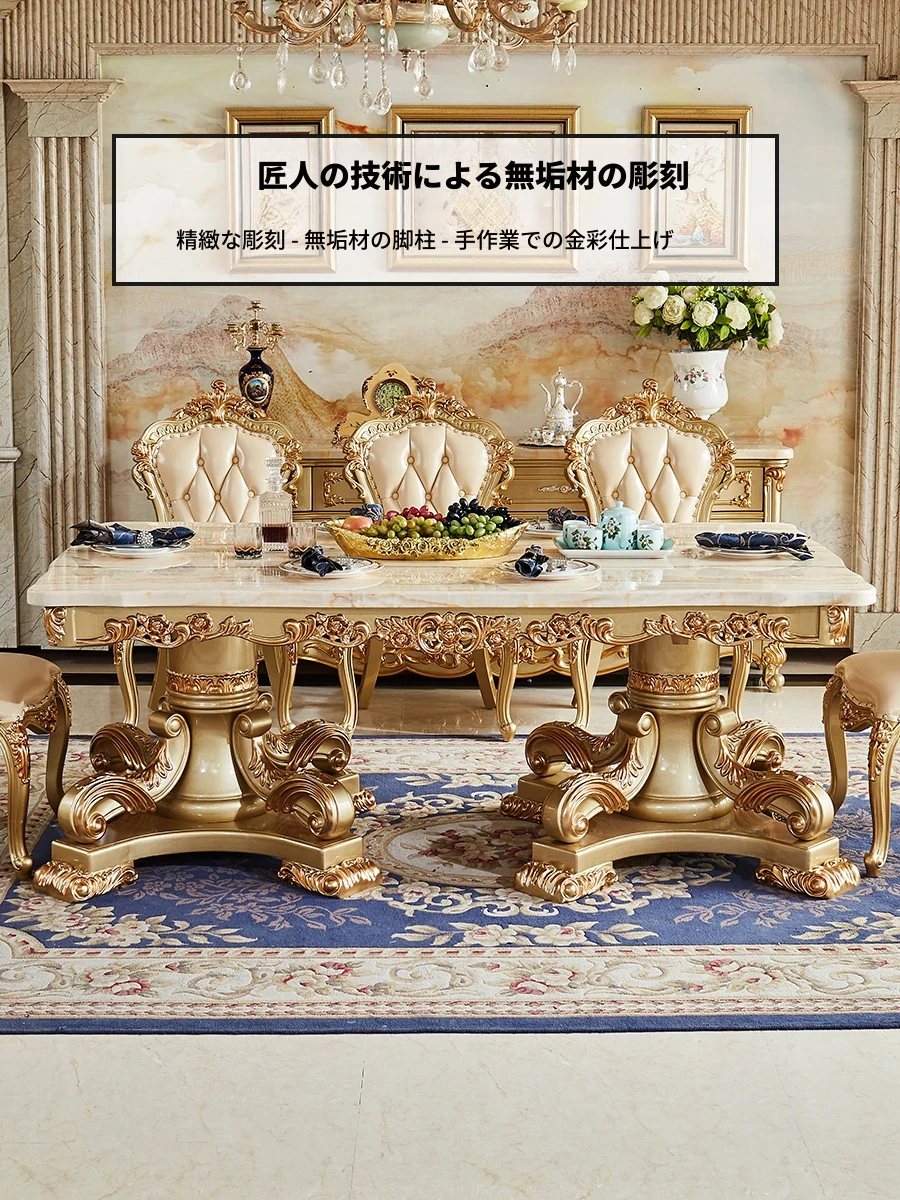 豪華な欧風大理石長方形ダイニングテーブルセット|高級別荘スタイル|全実木彫刻家具|優雅な空間を演出する贅沢なダイニング体験をお楽しみください!
