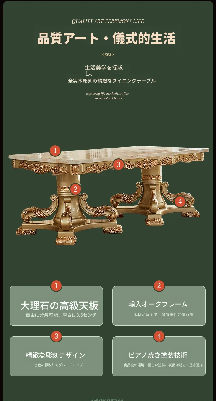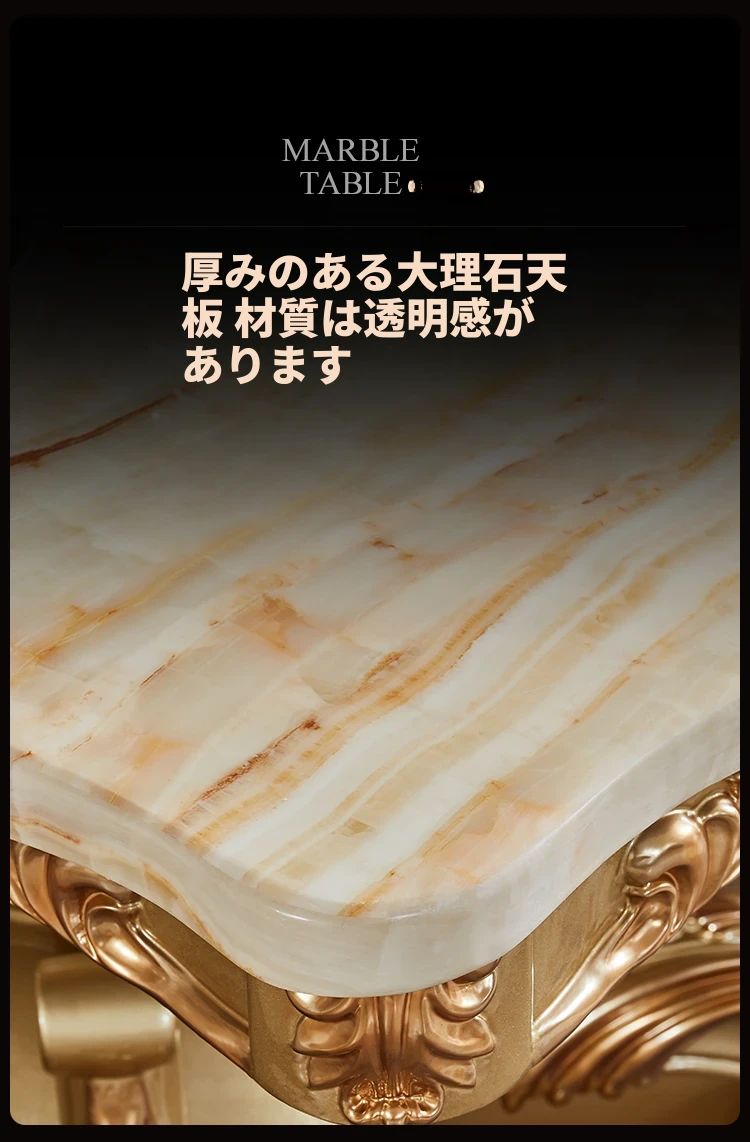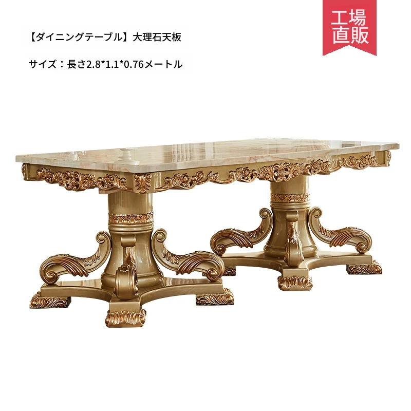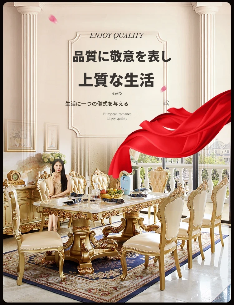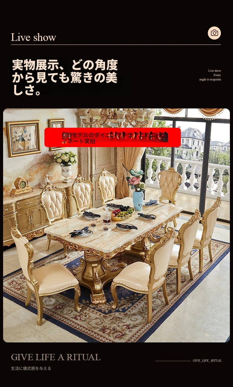 豪華な欧風大理石長方形ダイニングテーブルセット|高級別荘スタイル|全実木彫刻家具|優雅な空間を演出する贅沢なダイニング体験をお楽しみください!