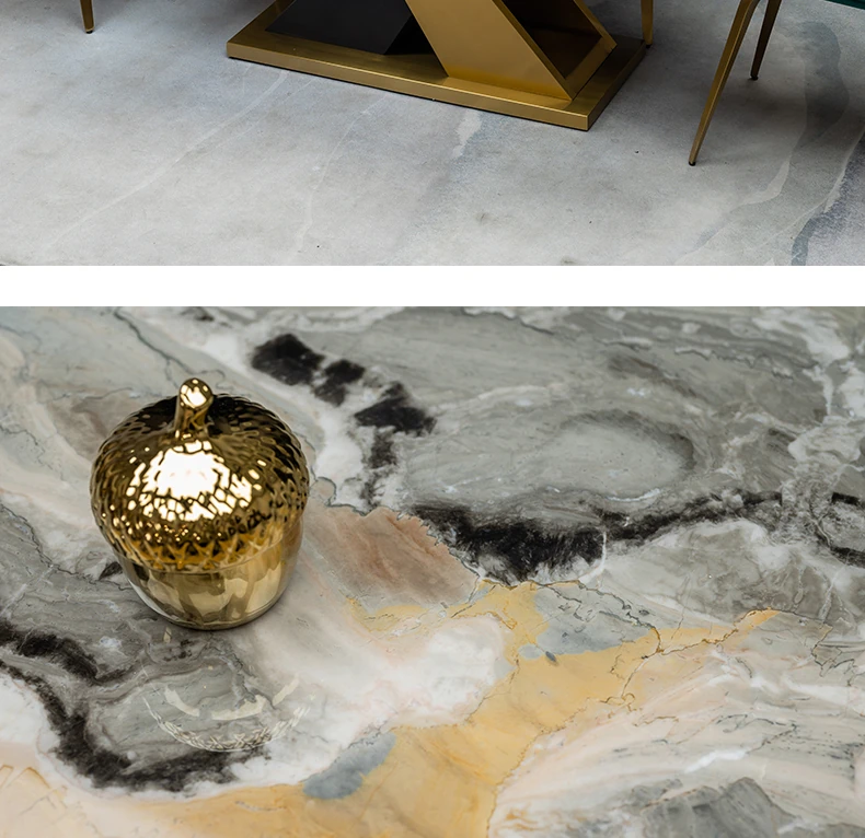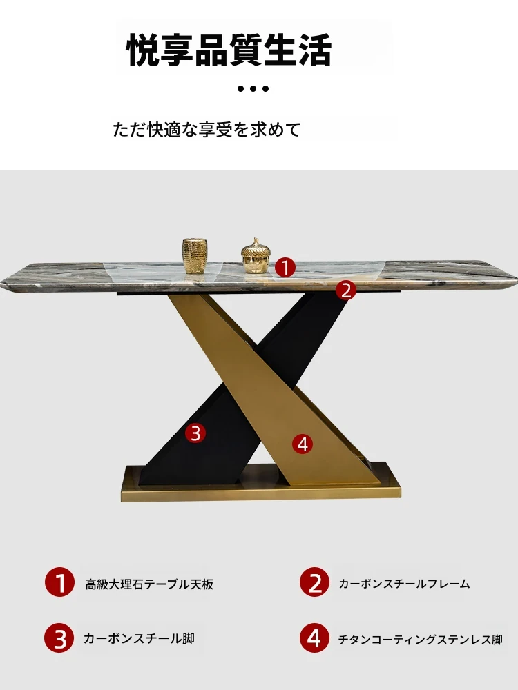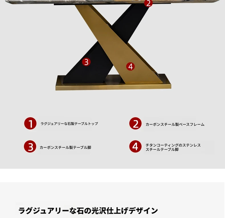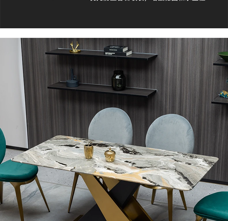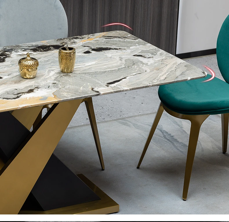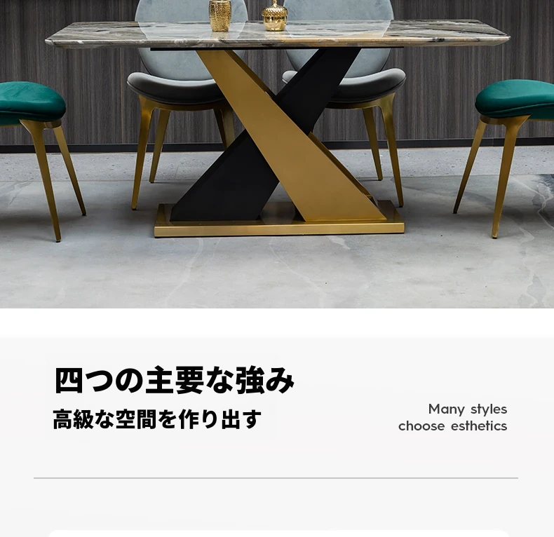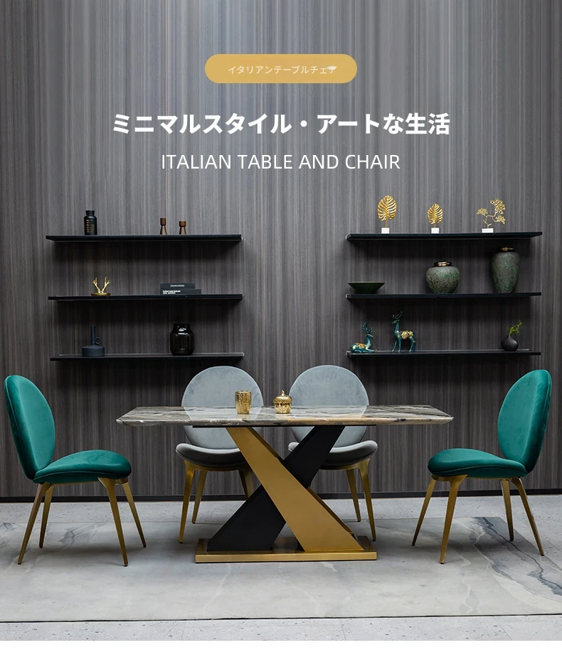 ラグジュアリーな石製ダイニングテーブルセット - イタリアンスタイルの長方形ミクロクリスタル石テーブルと椅子の組み合わせ。高級ホテルやヴィラのモデルルームに最適な大理石デザインで、洗練された空間を演出します。