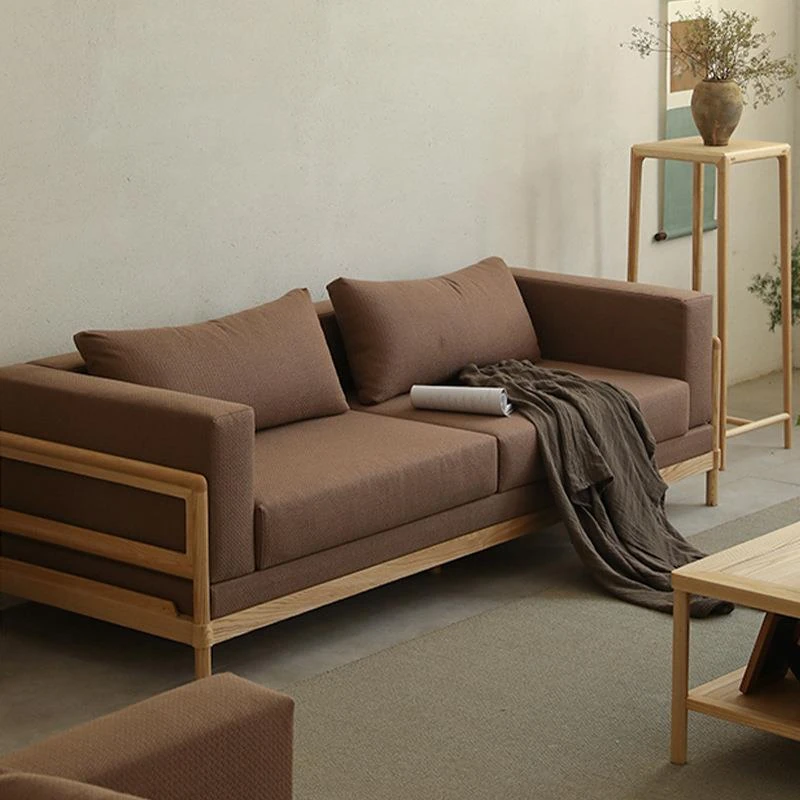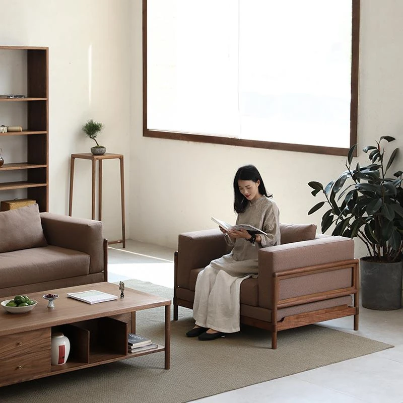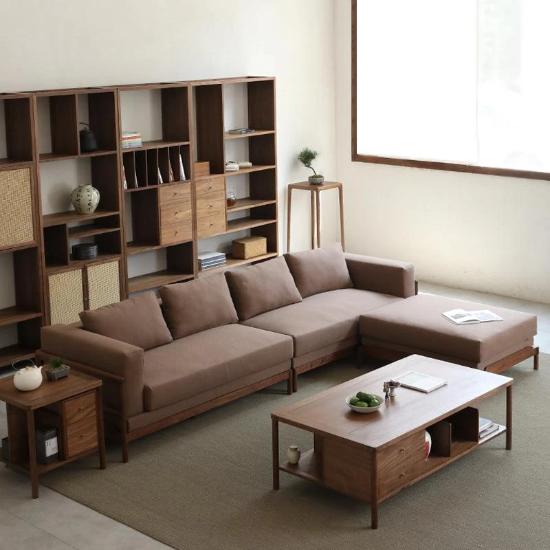 新中式全実木ソファー|ブラックウォールナット製|家庭用リビング向け|布製コーナー&貴妃スタイルコンビネーションソファ|天然木家具で上質な空間を演出!