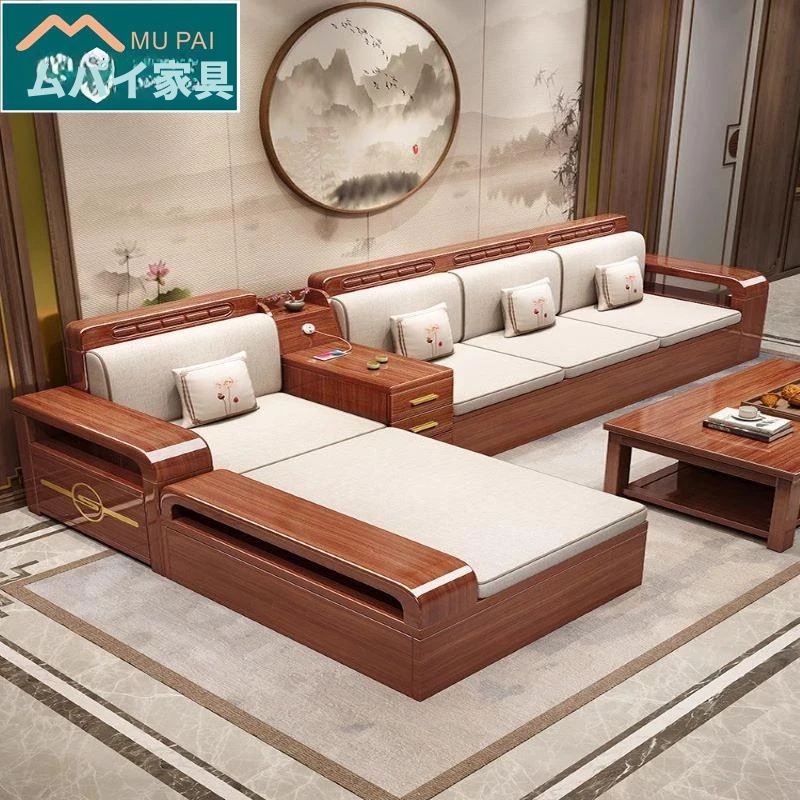 中華風ウォールナット無垢材リビングソファ|冬夏兼用・大小サイズ対応の現代的シンプルデザイン|収納付き家具でお部屋をスッキリ整理!