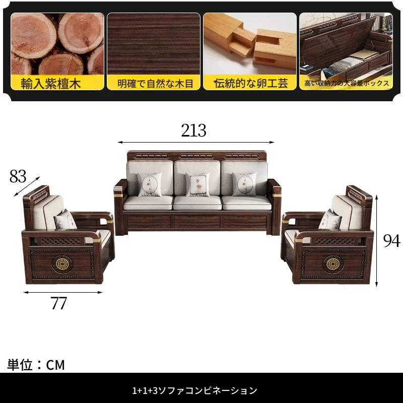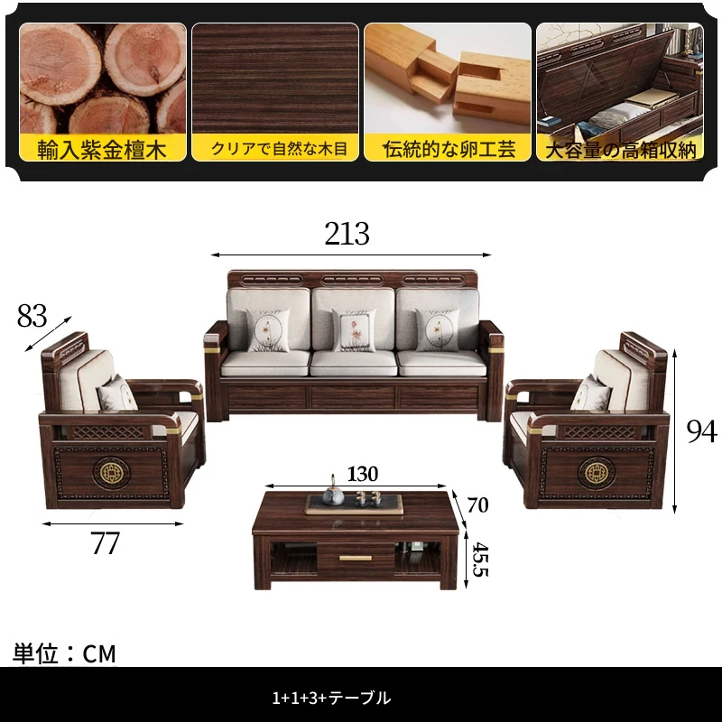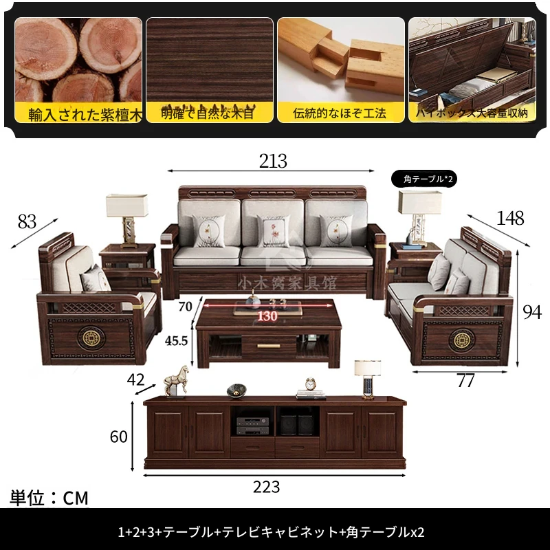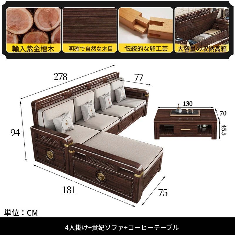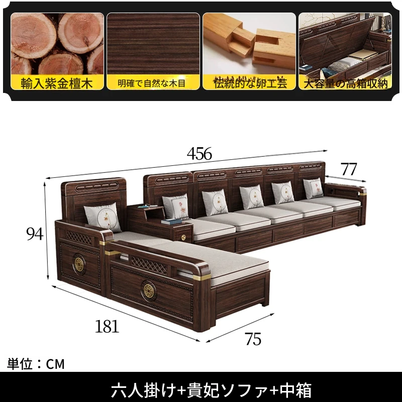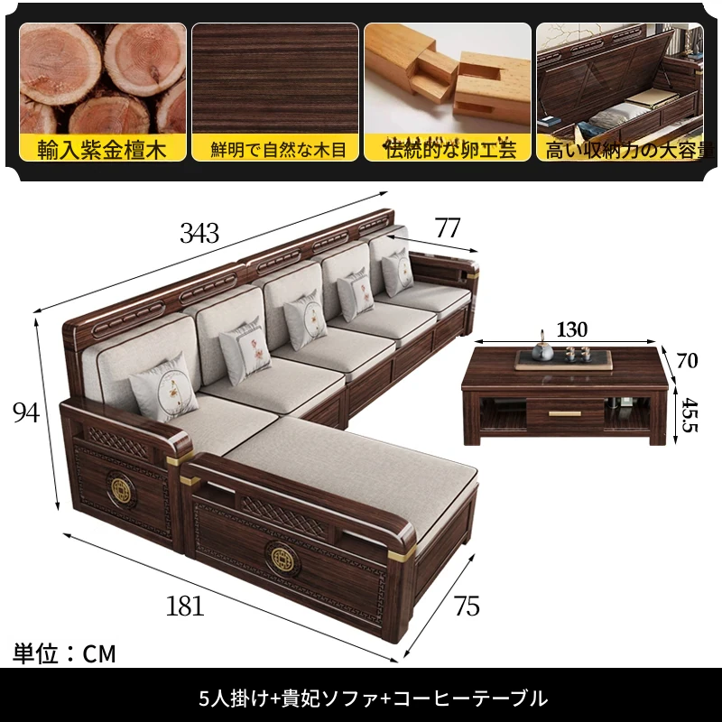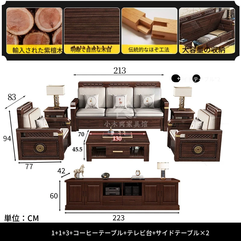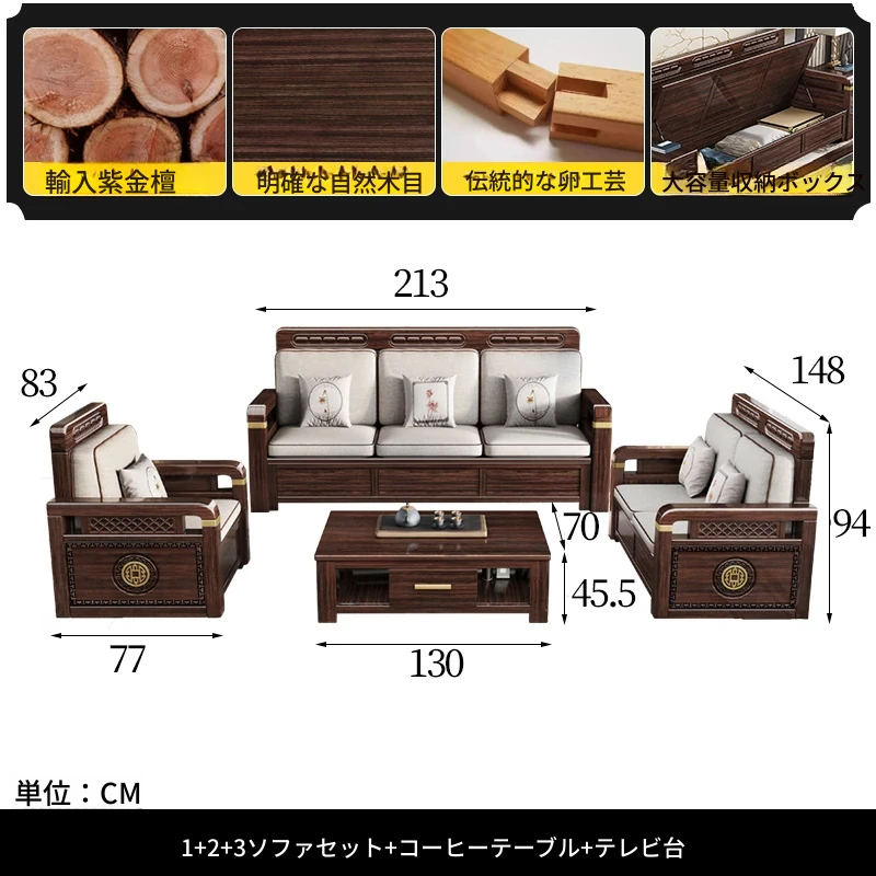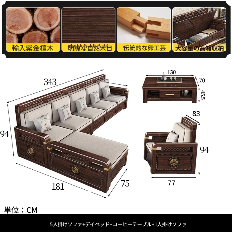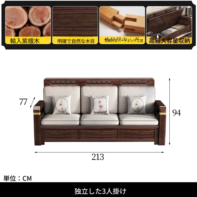 新中式デザインの冬夏兼用、実木製の収納ソファ!シンプルでモダンな小型リビング向けのフルセット家具。おしゃれで機能的な空間を演出し、快適なひとときを提供します。