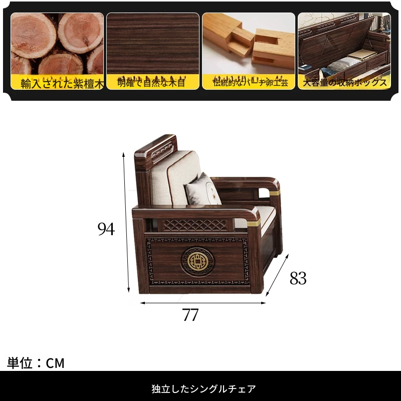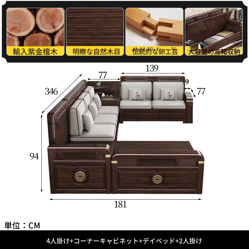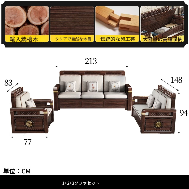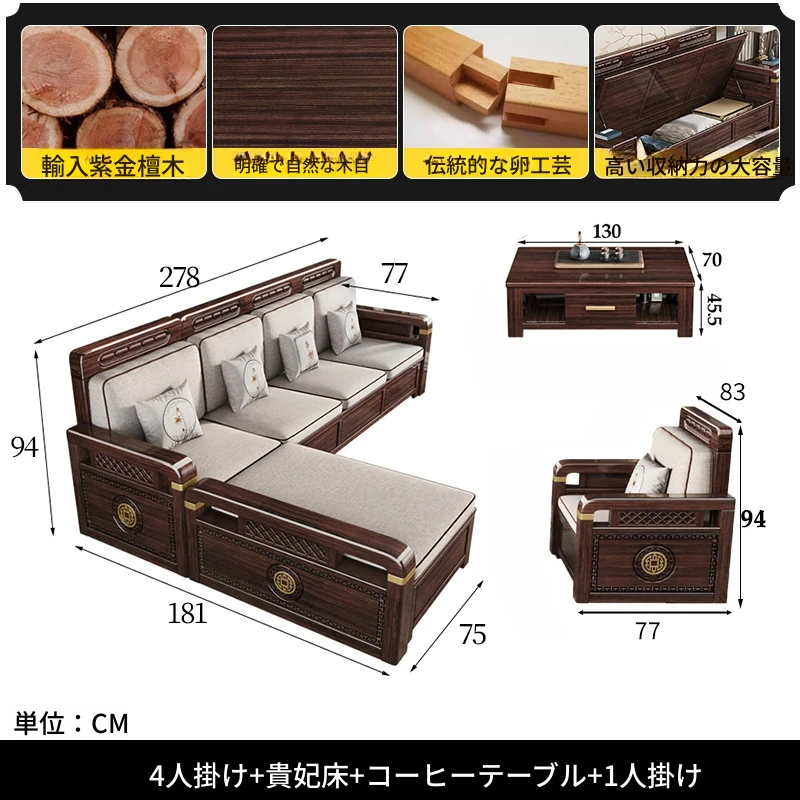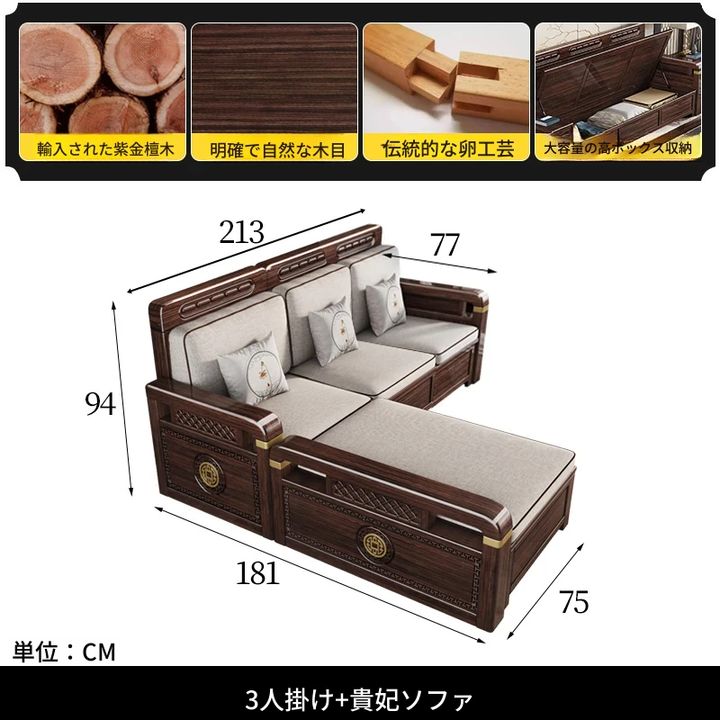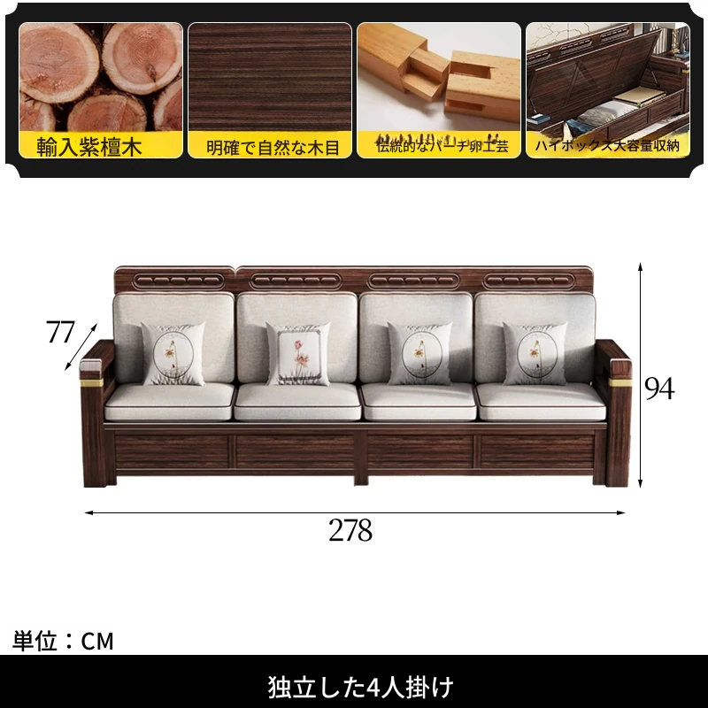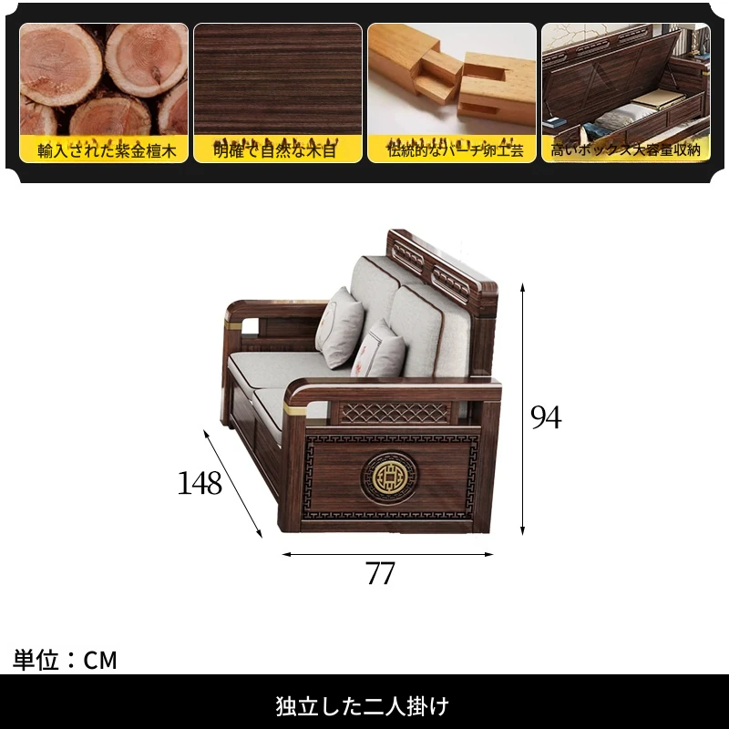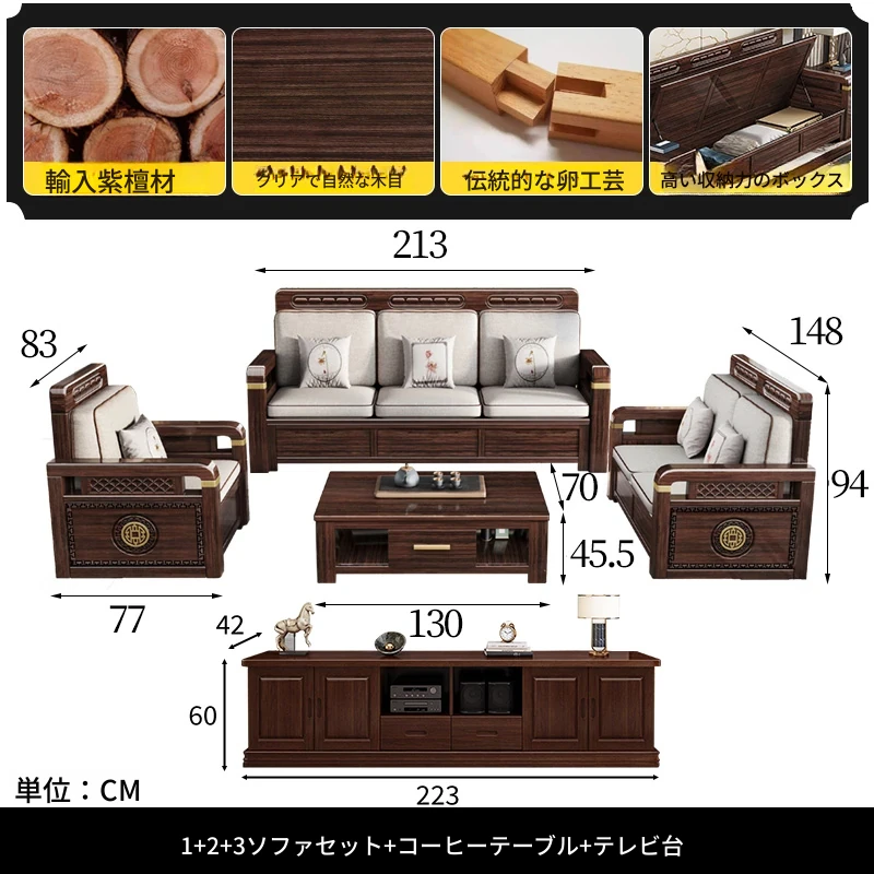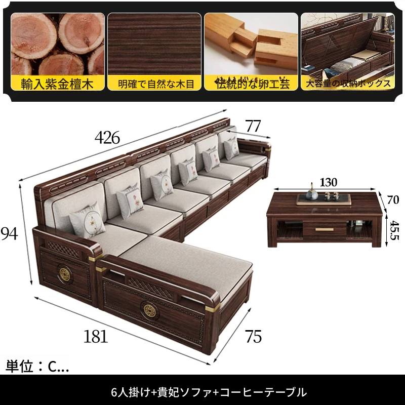 新中式デザインの冬夏兼用、実木製の収納ソファ!シンプルでモダンな小型リビング向けのフルセット家具。おしゃれで機能的な空間を演出し、快適なひとときを提供します。
