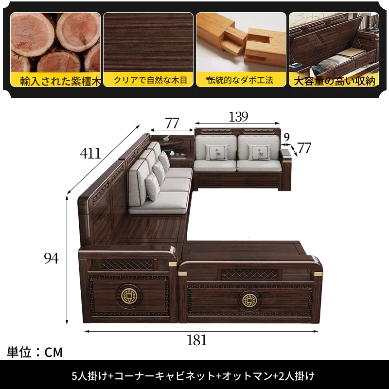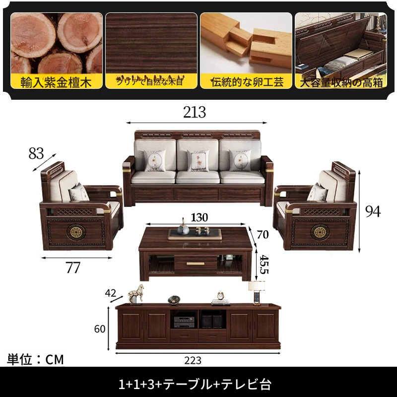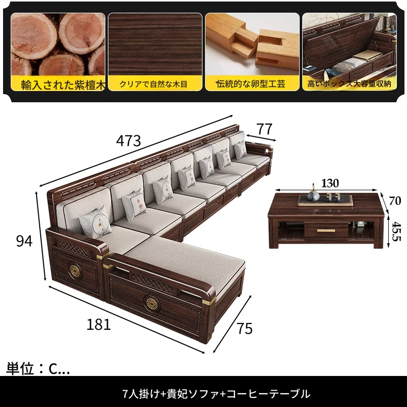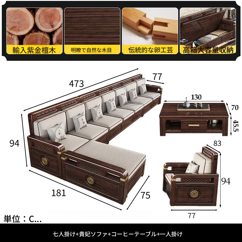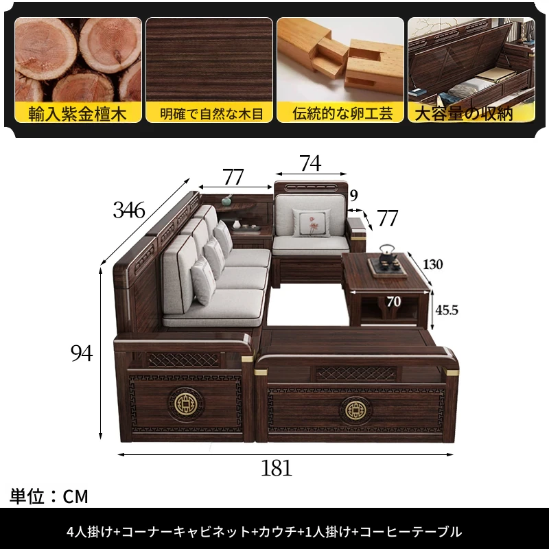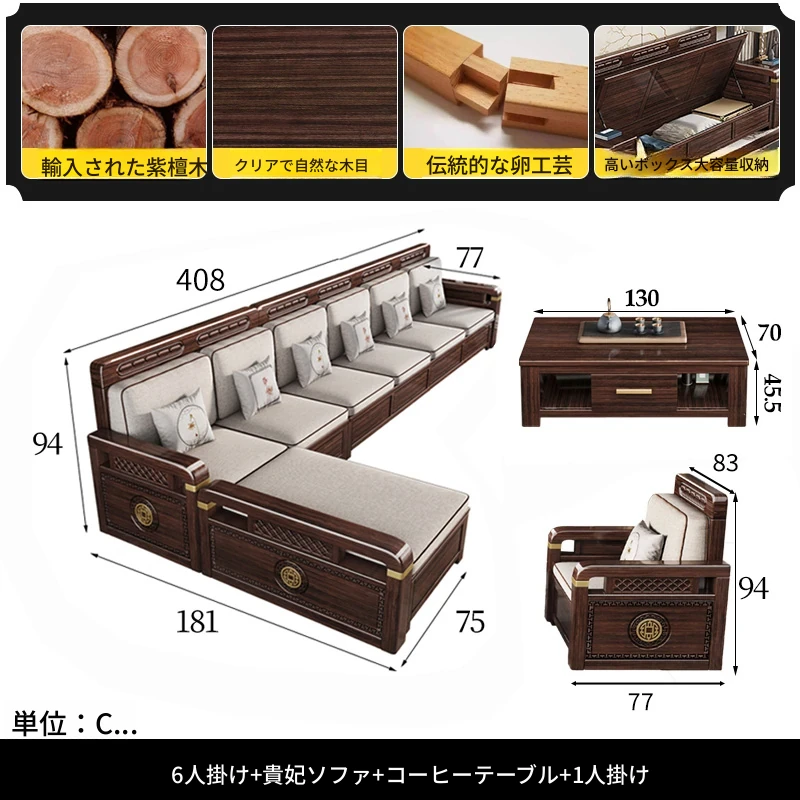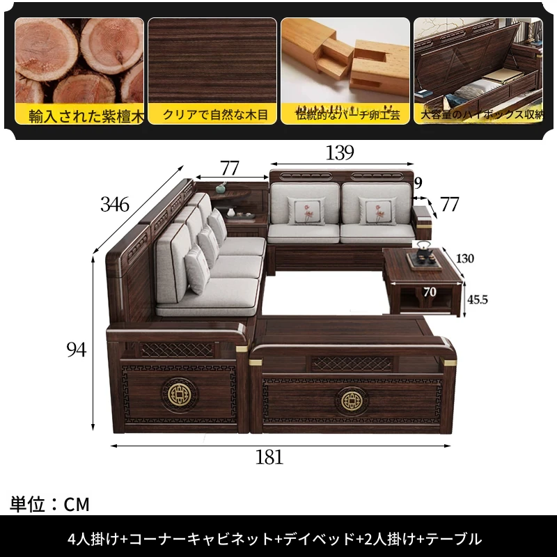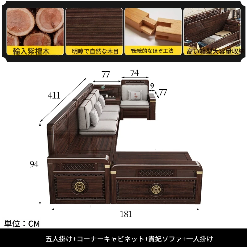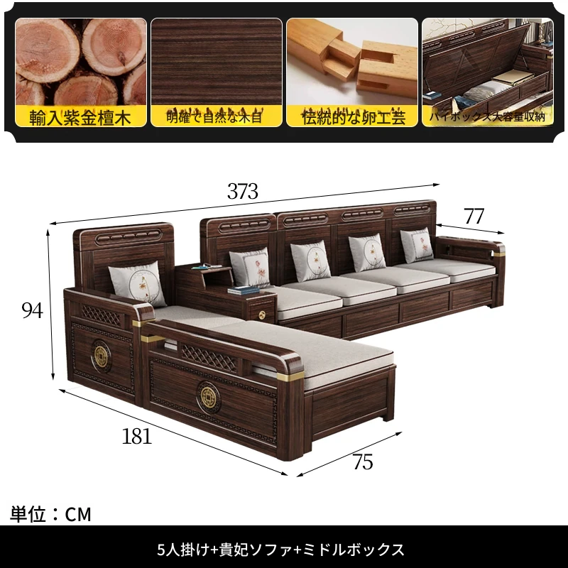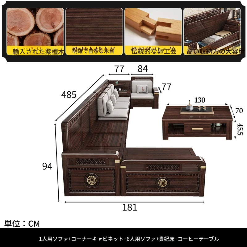 新中式デザインの冬夏兼用、実木製の収納ソファ!シンプルでモダンな小型リビング向けのフルセット家具。おしゃれで機能的な空間を演出し、快適なひとときを提供します。