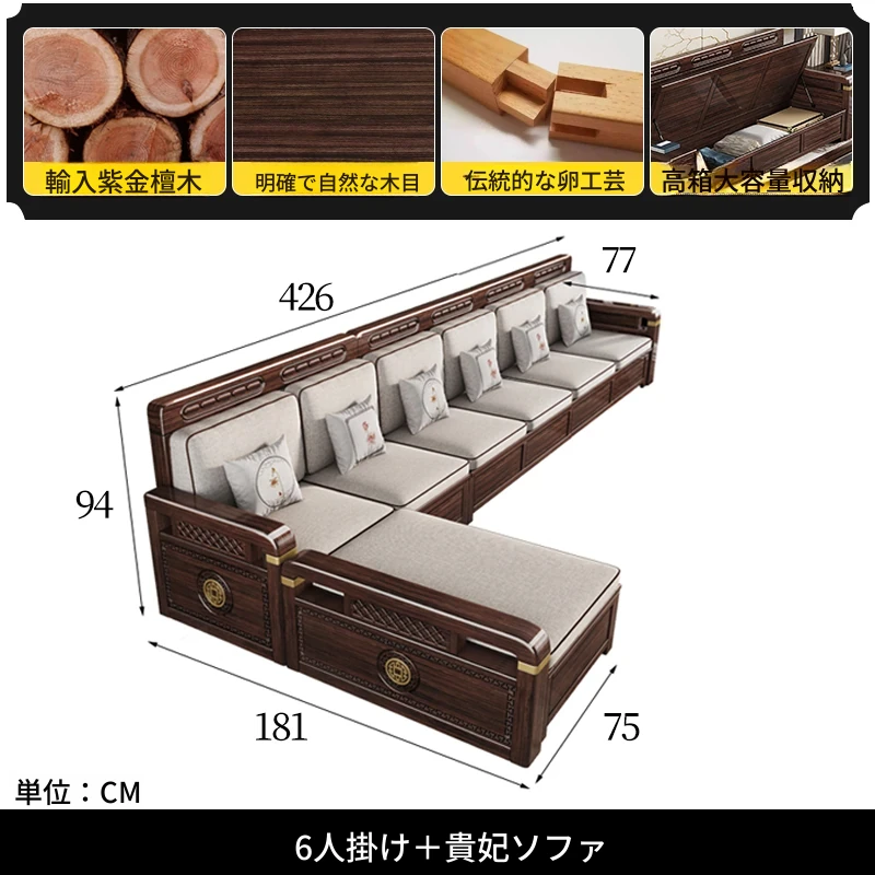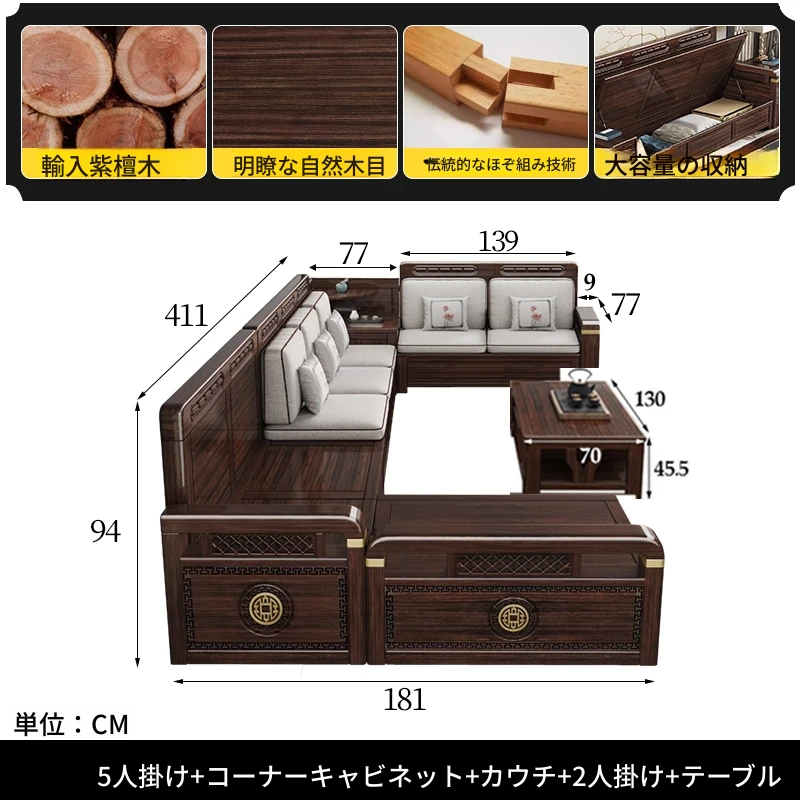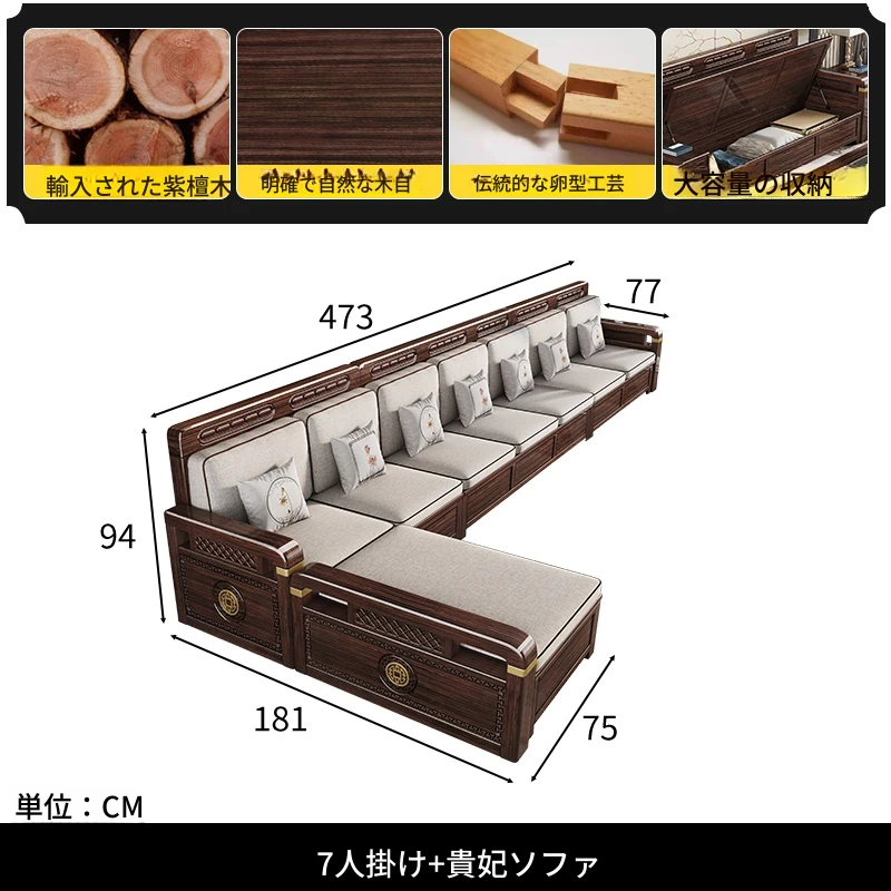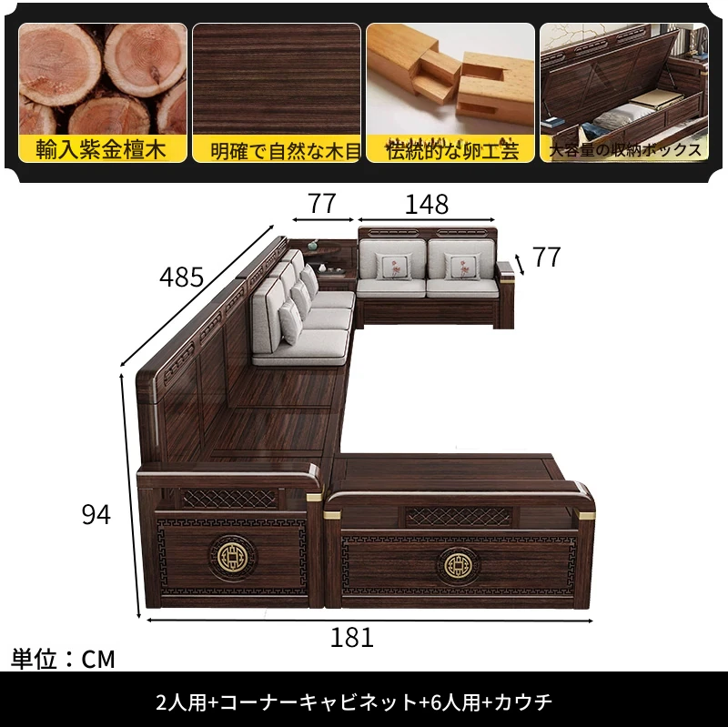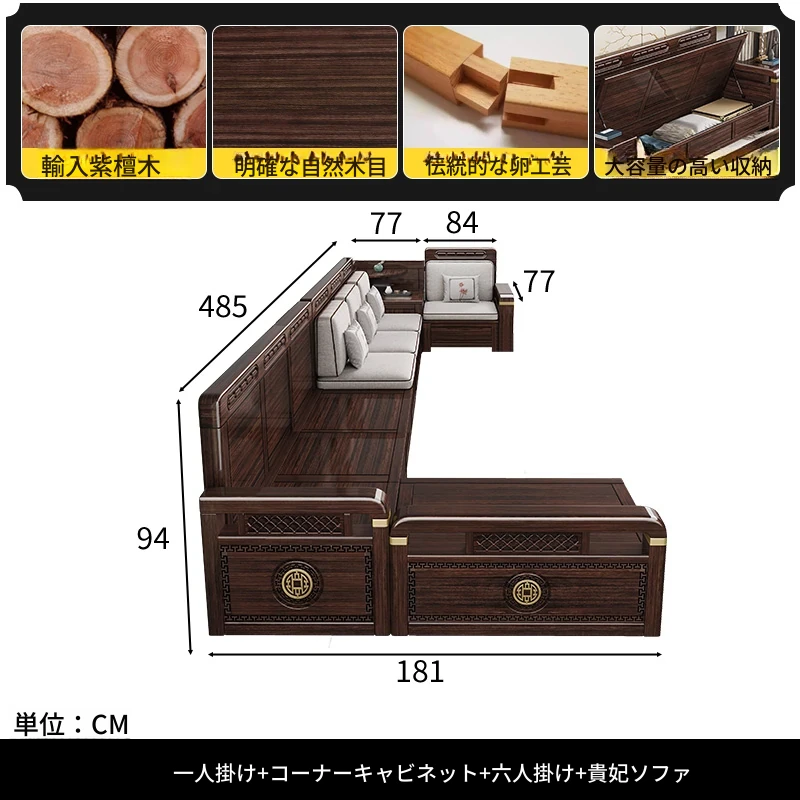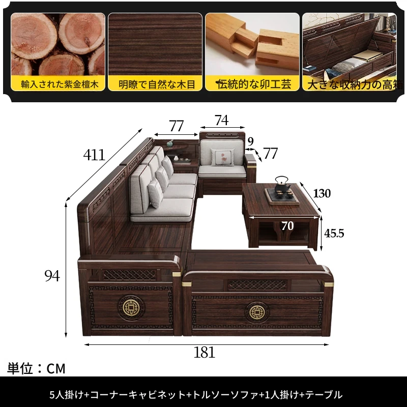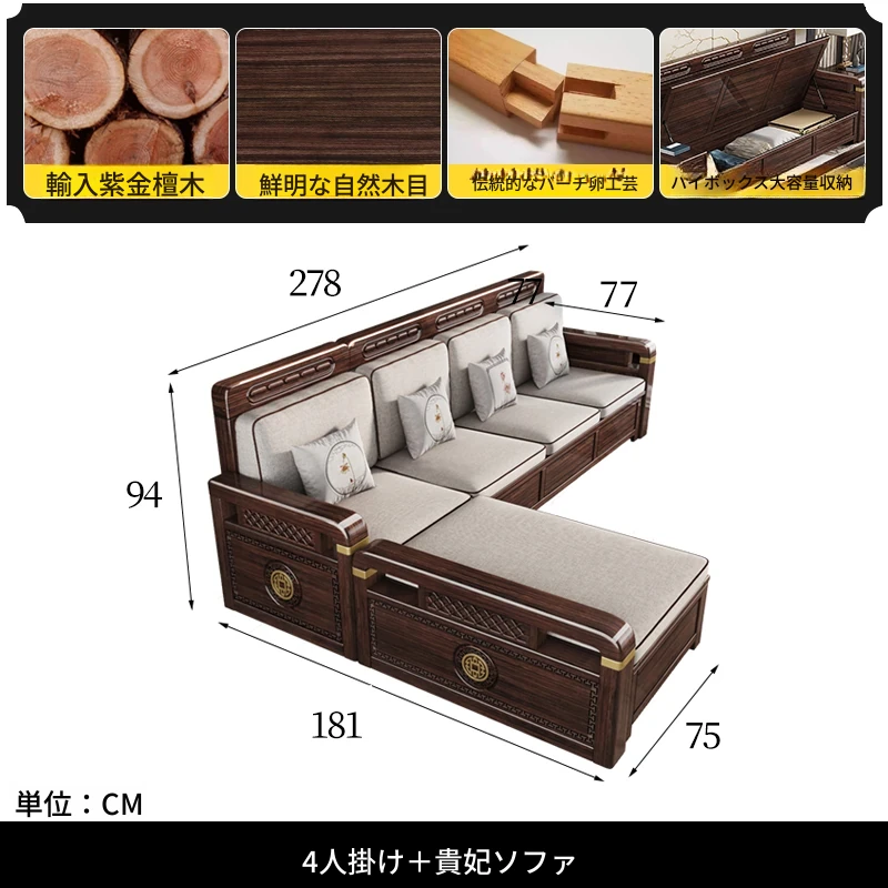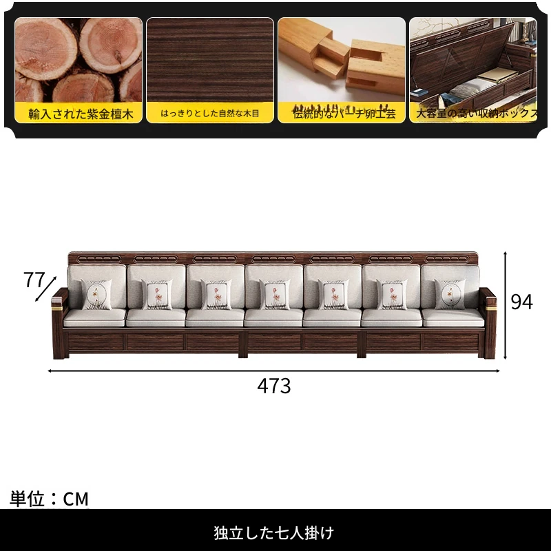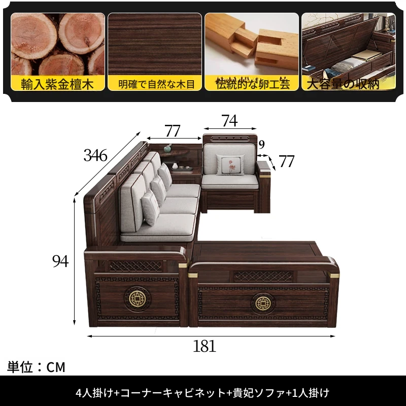 新中式デザインの冬夏兼用、実木製の収納ソファ!シンプルでモダンな小型リビング向けのフルセット家具。おしゃれで機能的な空間を演出し、快適なひとときを提供します。