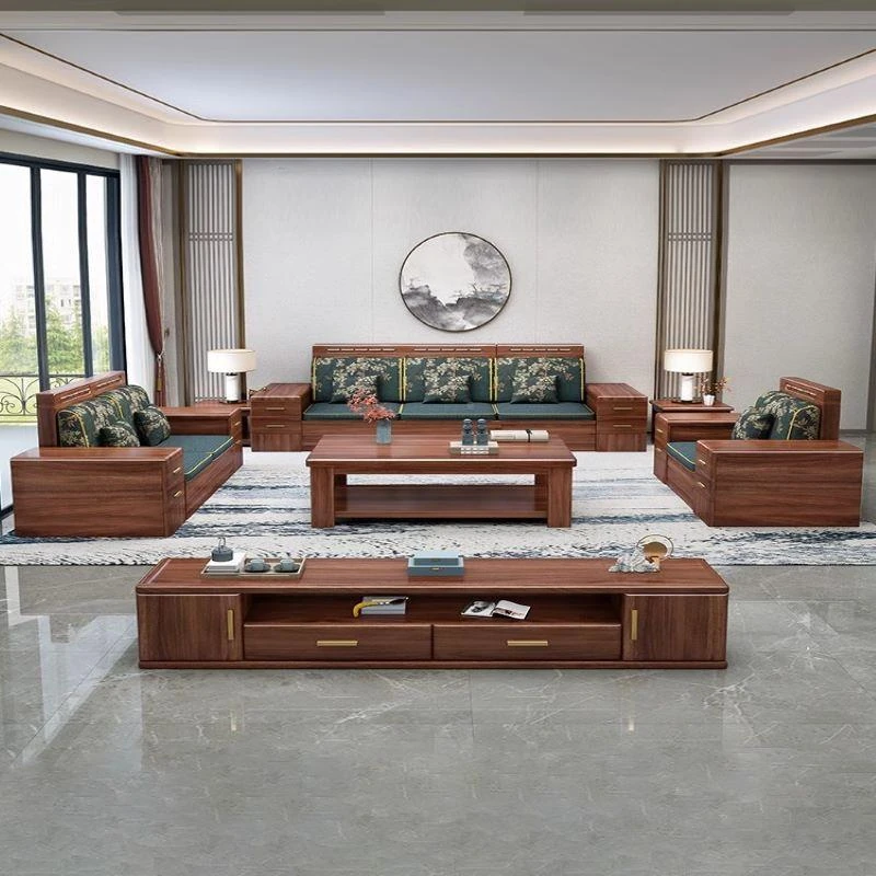 新中式クルミの無垢材ソファセット - モダンでシンプルな軽奢スタイルのリビング家具、上質な木の温もりを感じる贅沢な空間づくりに最適!