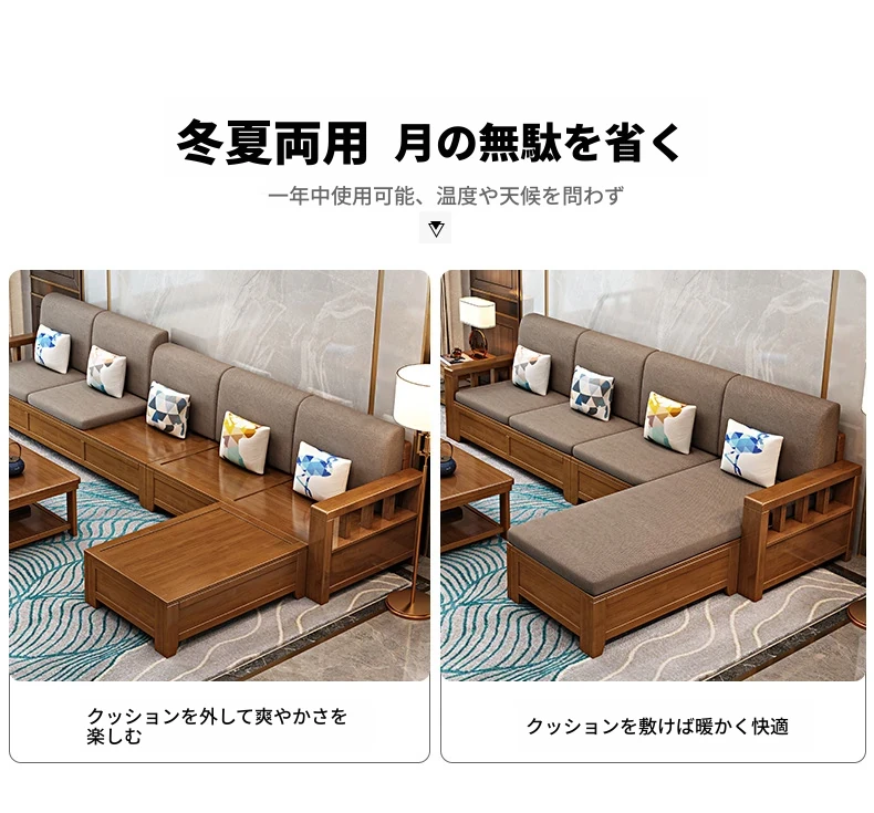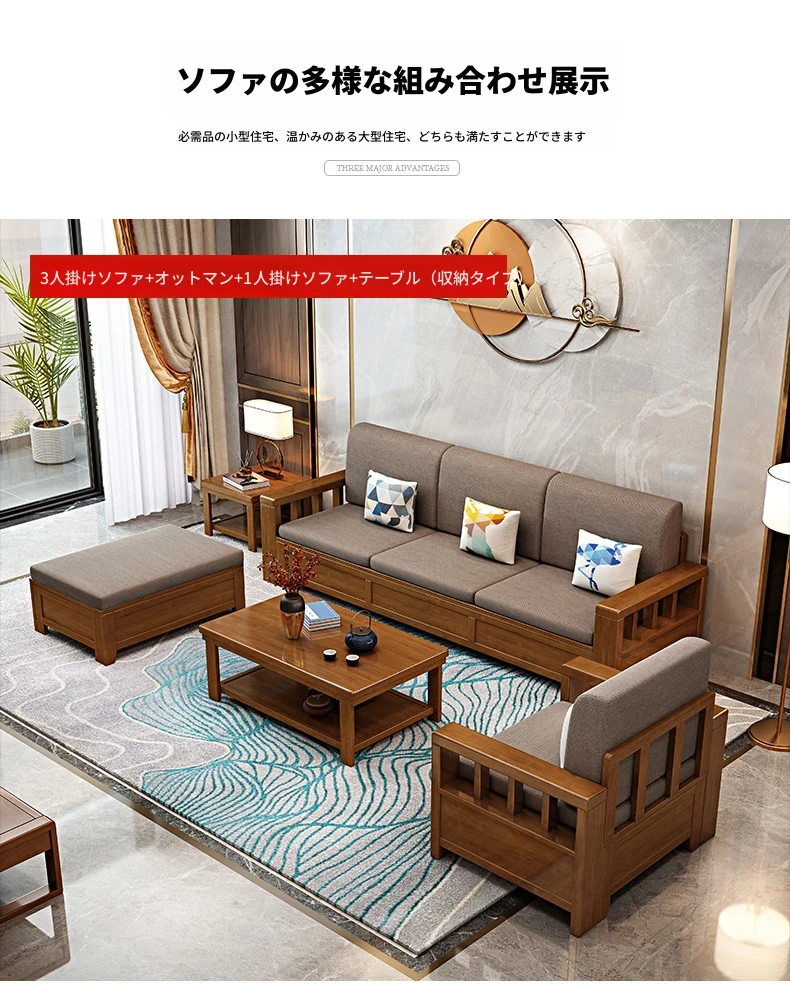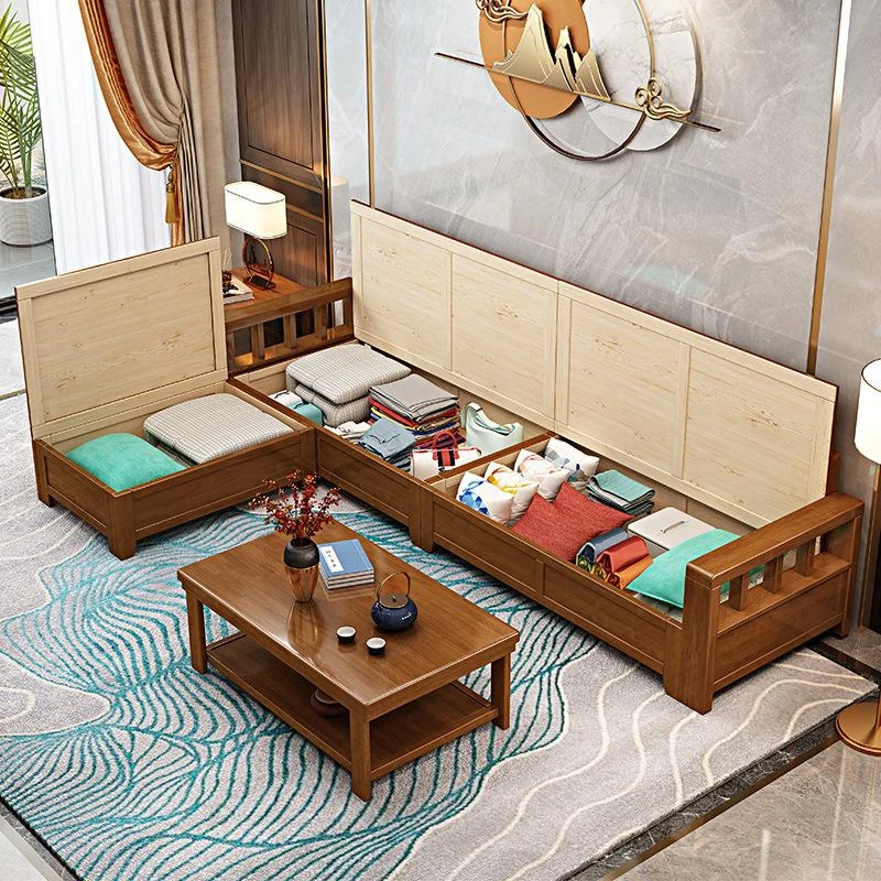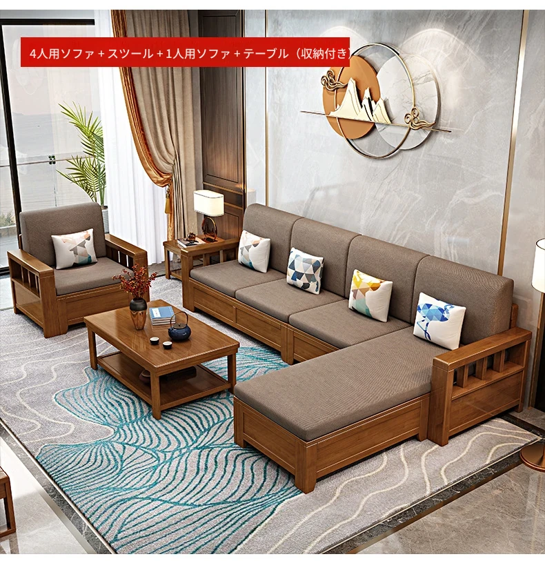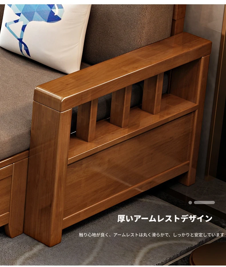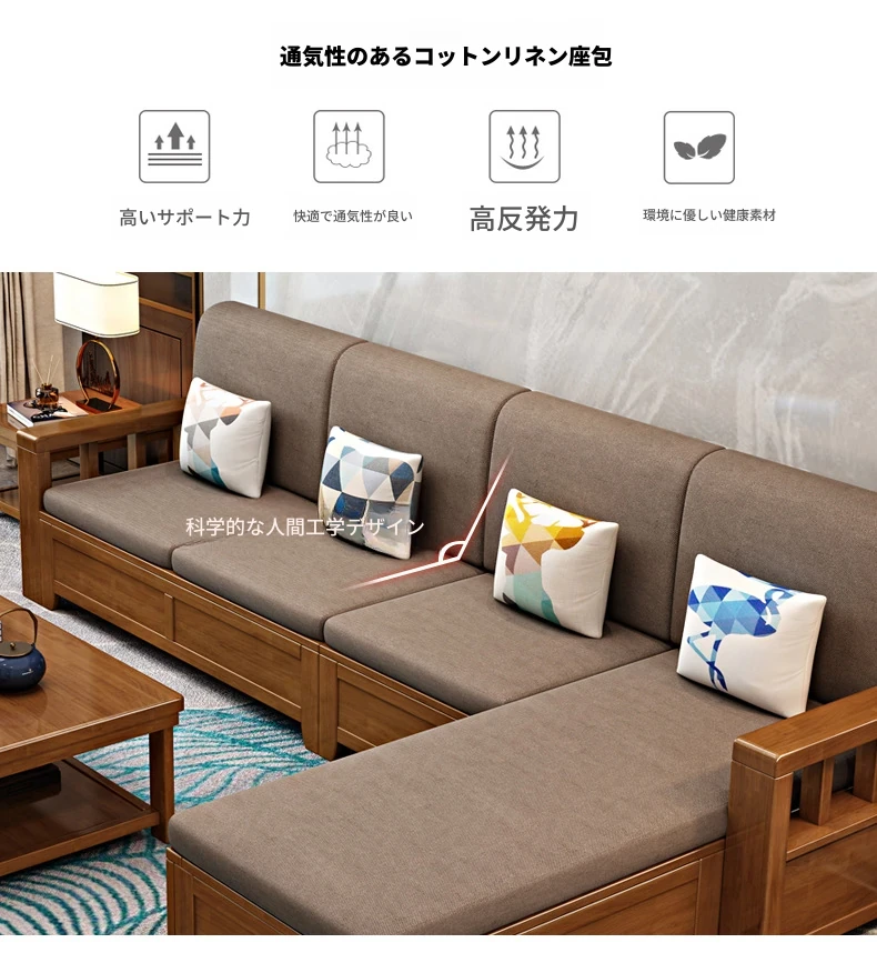 リビングに最適!新中式デザインのシンプルな天然木製ソファセット。貴妃木と布を使った収納付きハイバックソファ、狭いスペースでもおしゃれに収納力アップ!