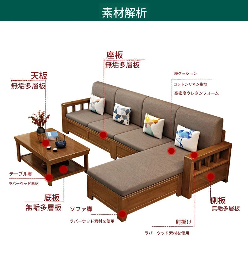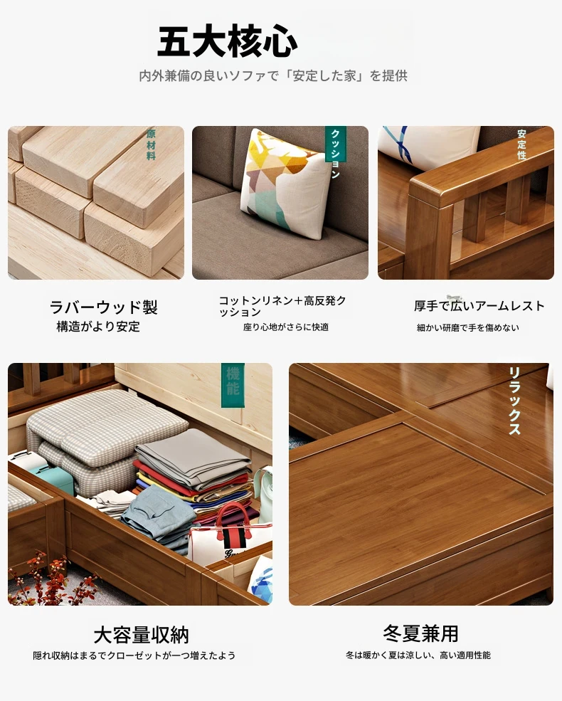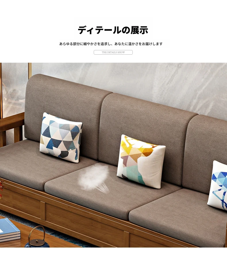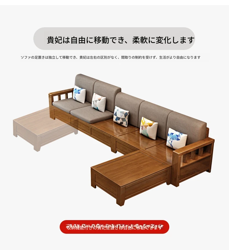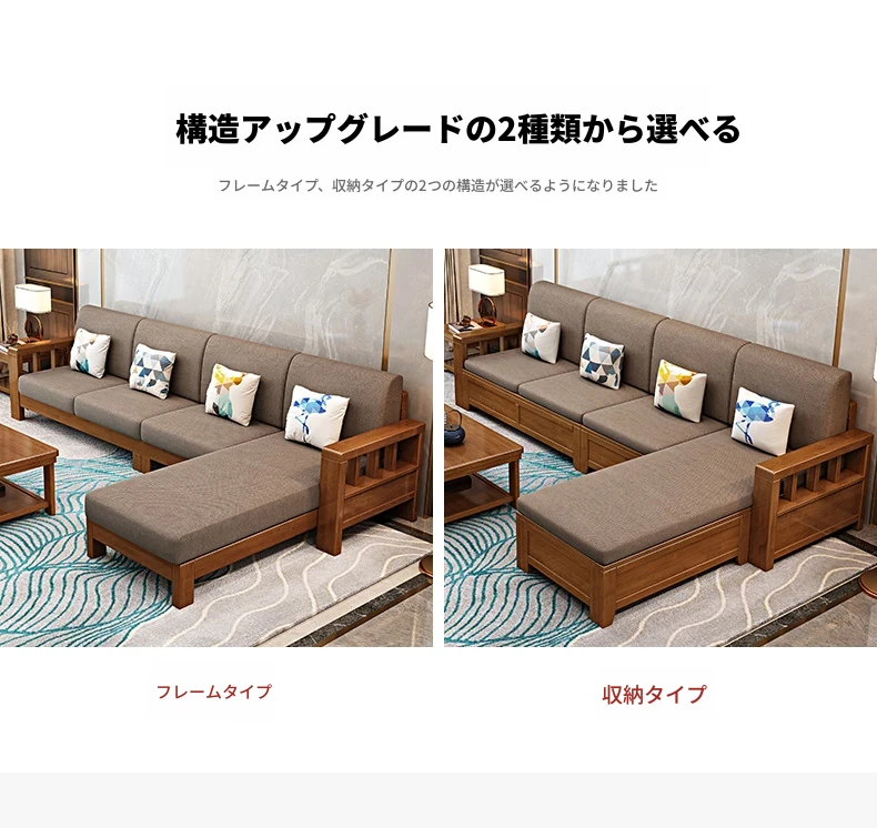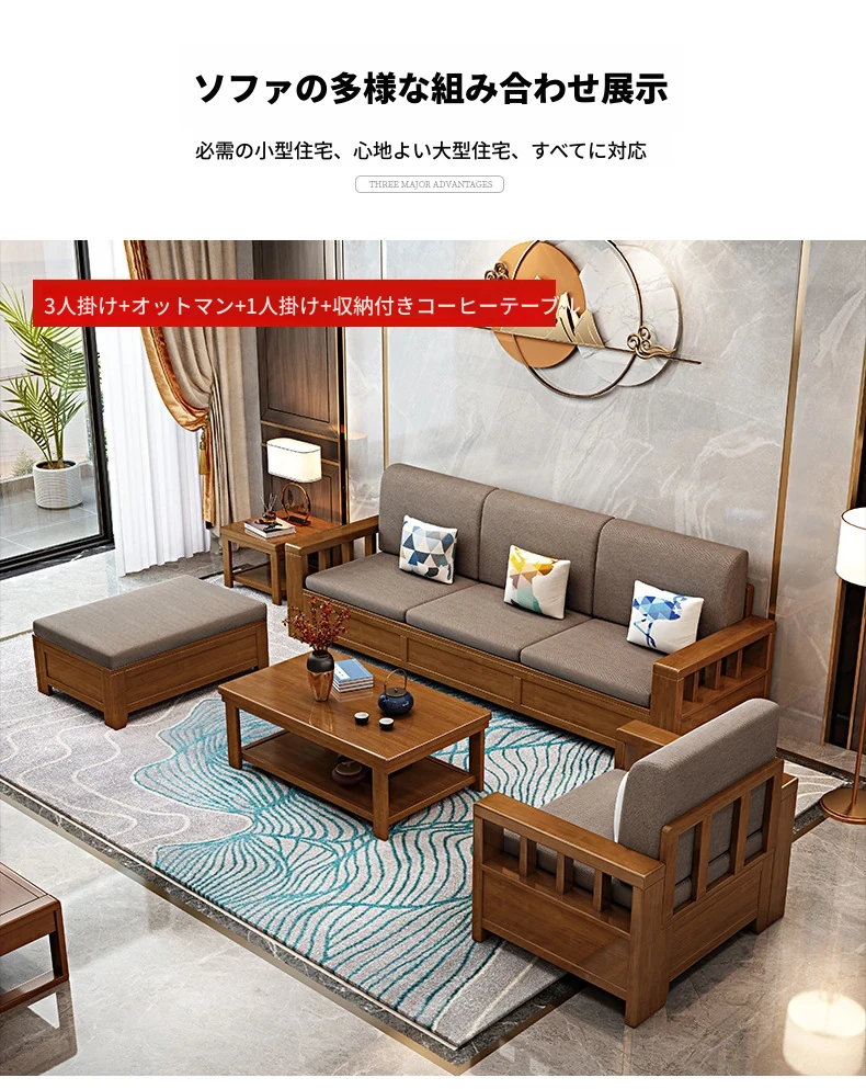 リビングに最適!新中式デザインのシンプルな天然木製ソファセット。貴妃木と布を使った収納付きハイバックソファ、狭いスペースでもおしゃれに収納力アップ!