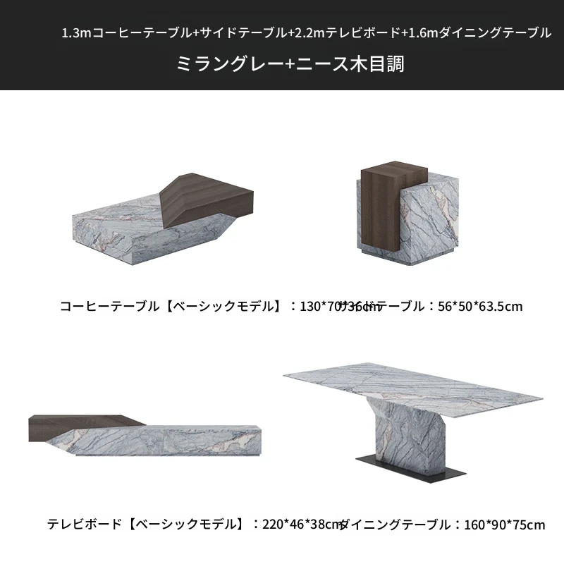 1.6mダイニングテーブル+1.3mコーヒーテーブル+2.2mテレビボード+サイドテーブル【イタリア・ミラングレー】