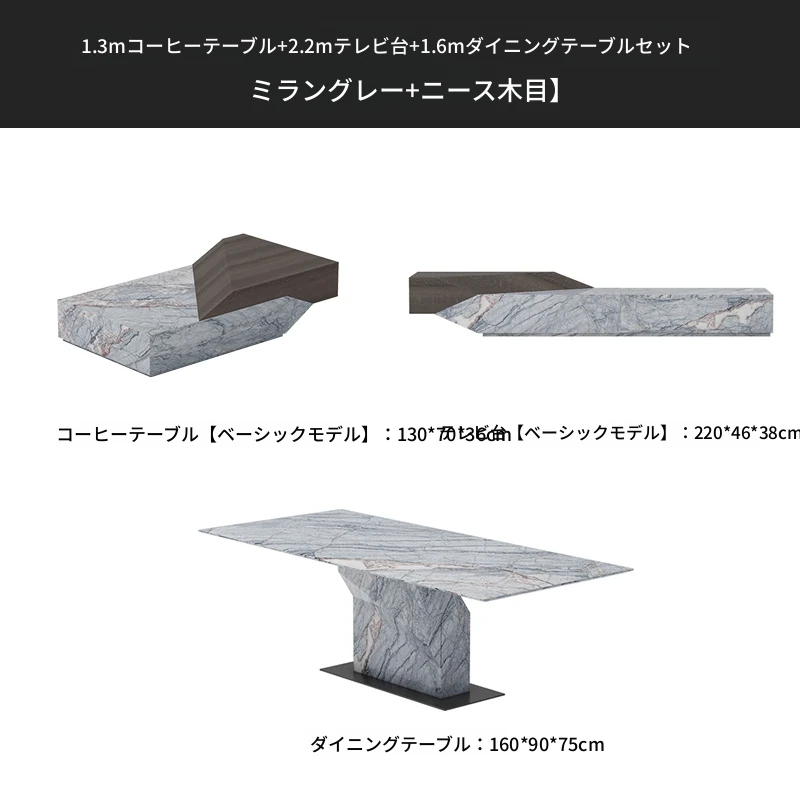 1.6mダイニングテーブル+1.3mコーヒーテーブル+2.2mテレビボード【イタリア・ミラングレー】