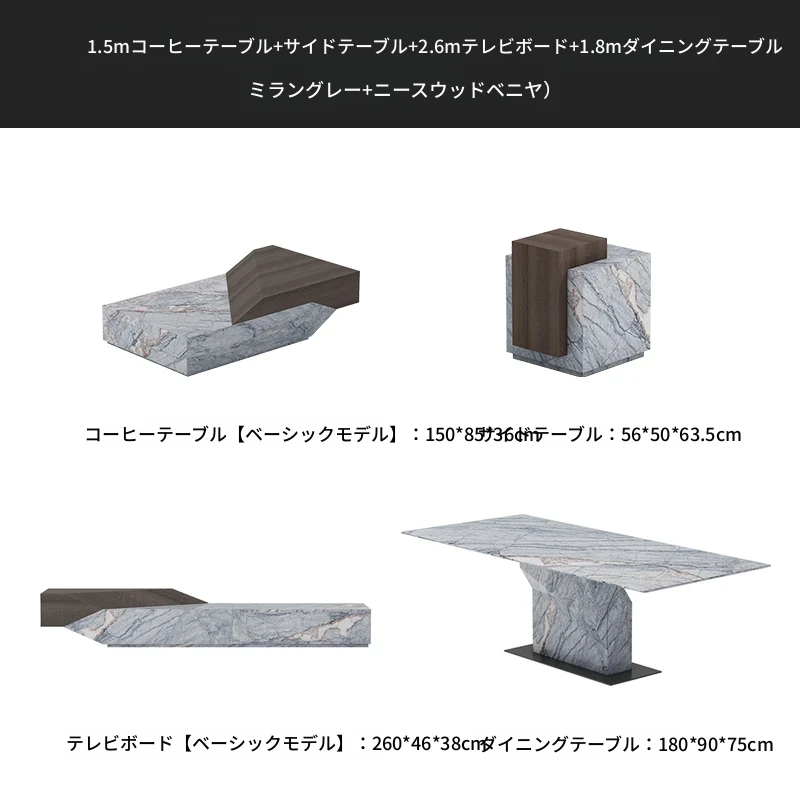 1.8mダイニングテーブル+1.5mコーヒーテーブル+2.6mテレビボード+サイドテーブル【イタリア・ミラングレー】