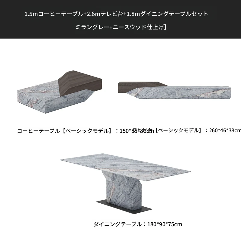 1.8mダイニングテーブル+1.5mコーヒーテーブル+2.6mテレビボード【イタリア・ミラングレー】