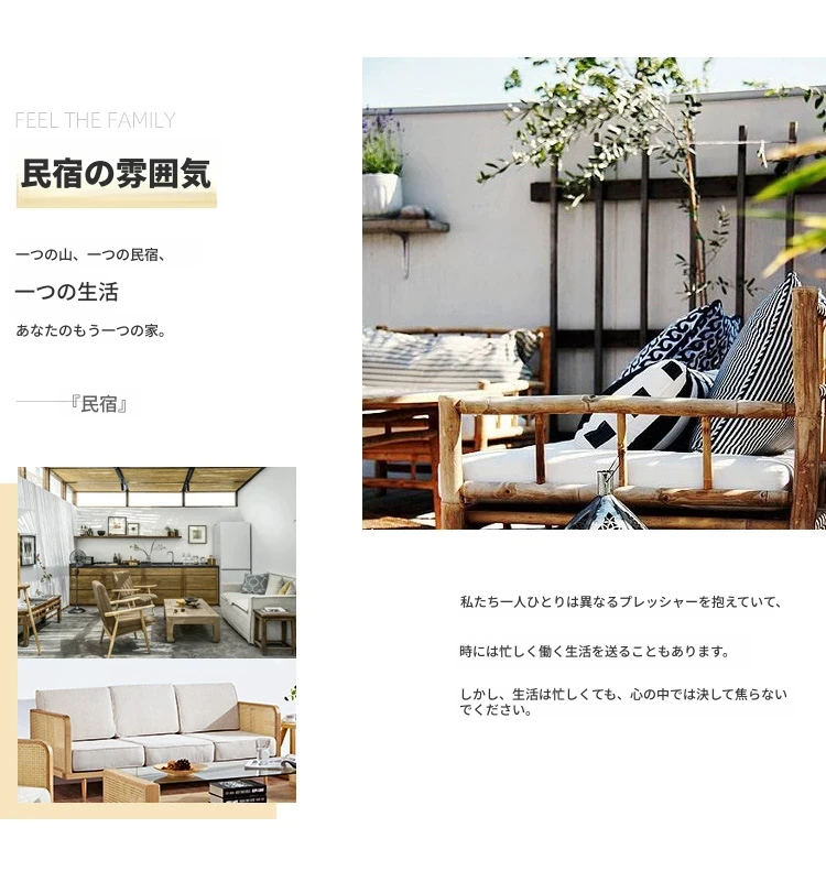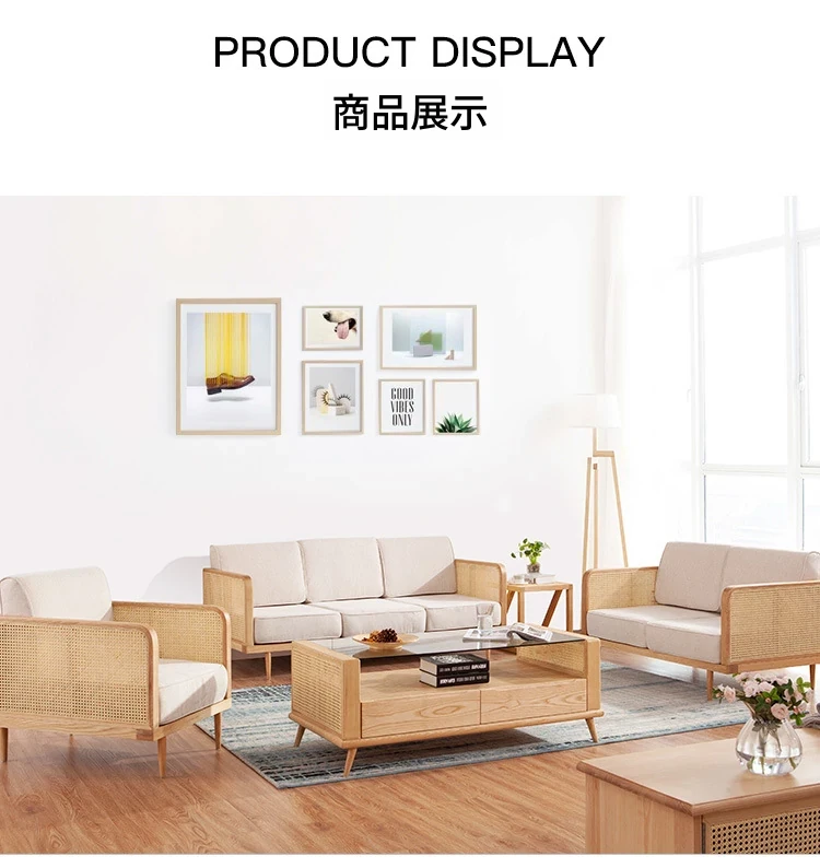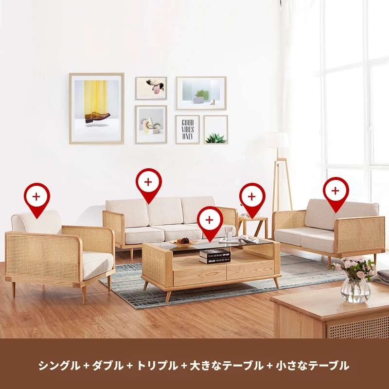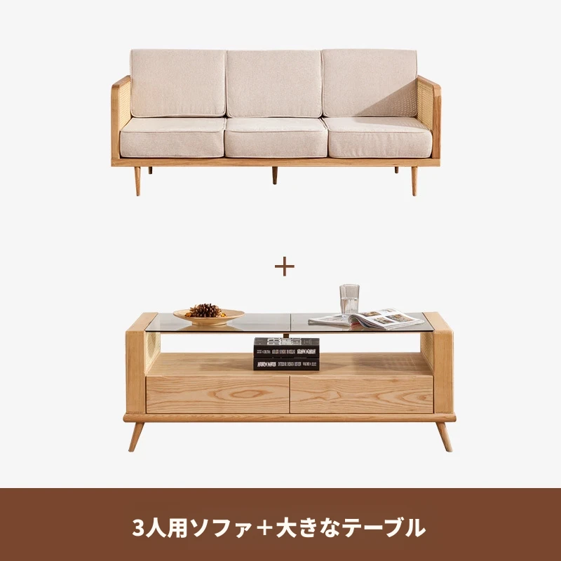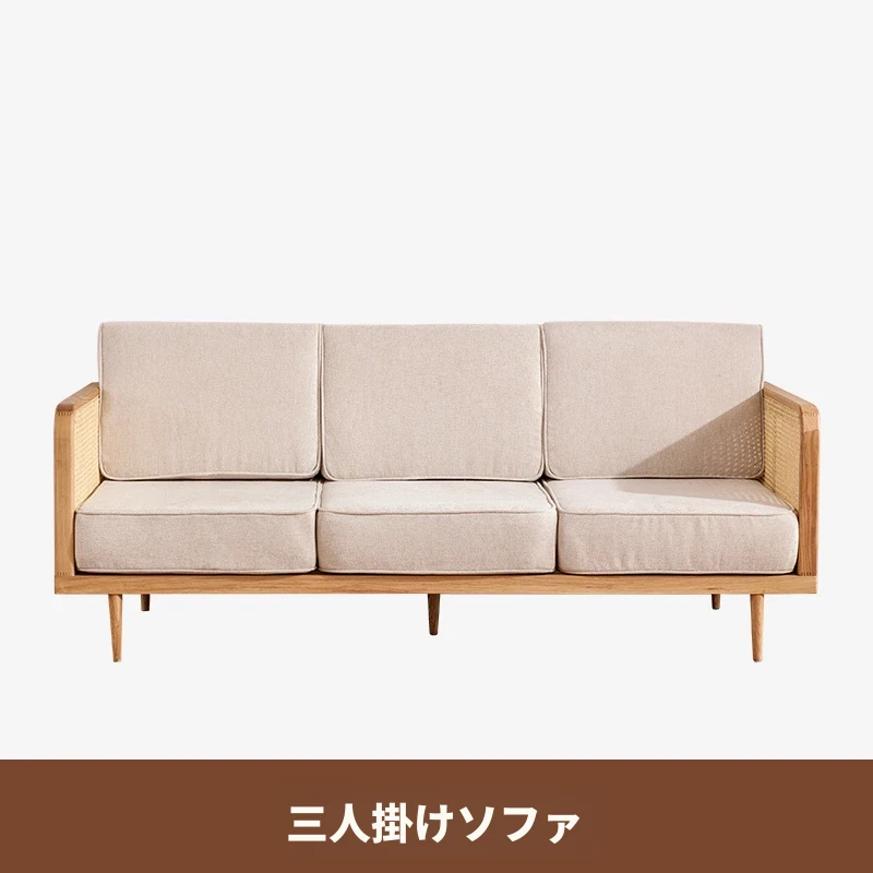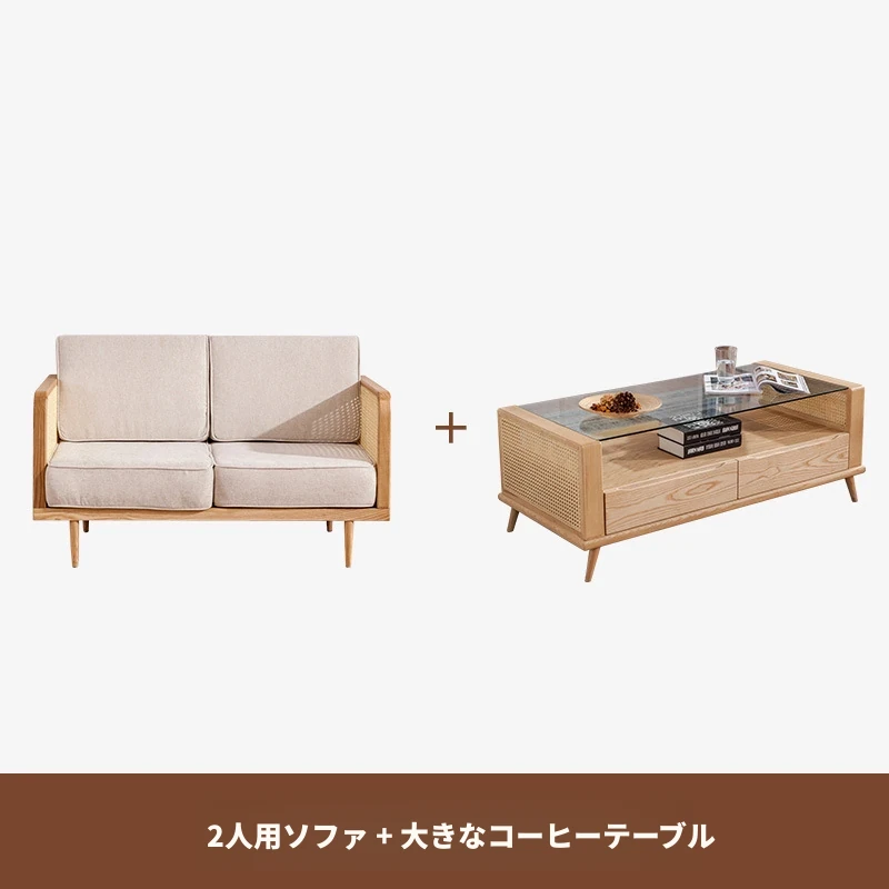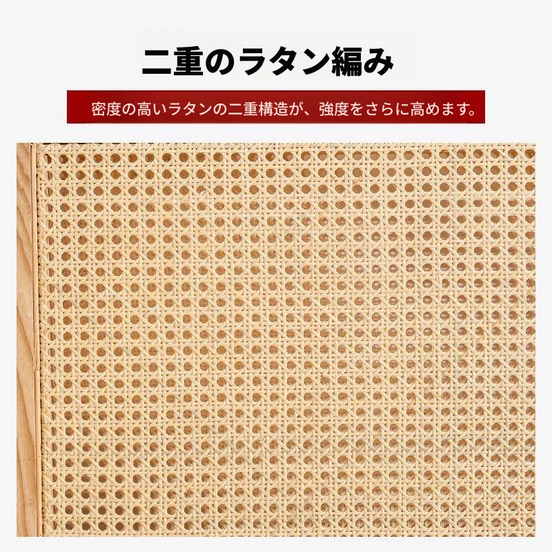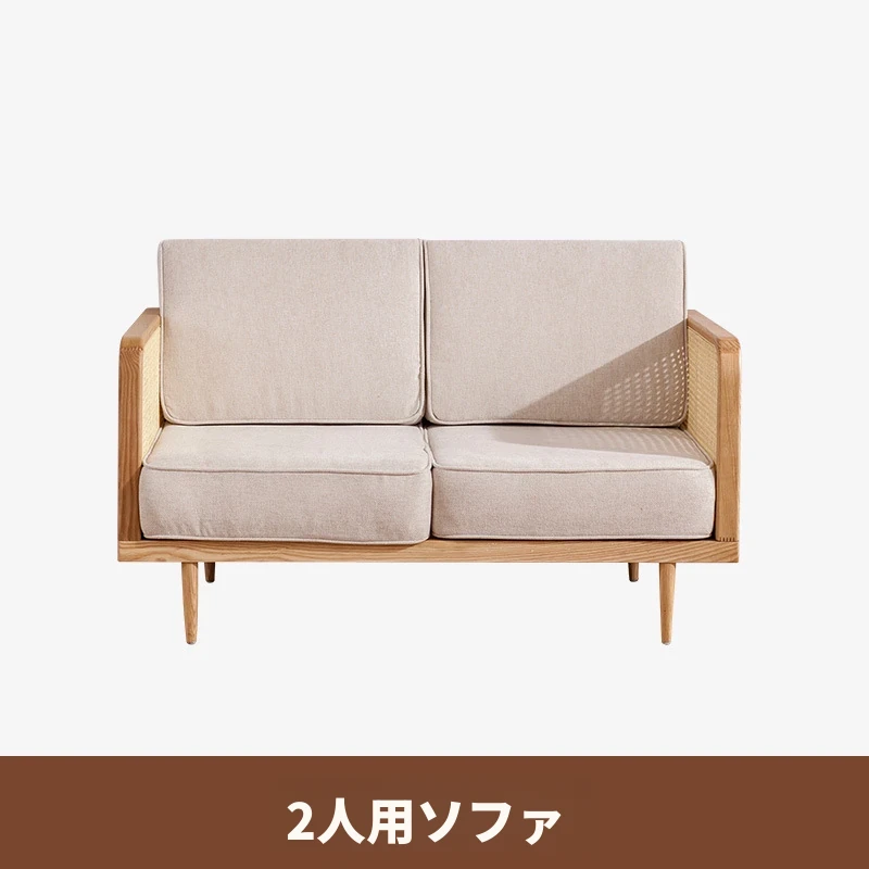 北欧スタイルの無垢材とラタン編みのリクライニングチェア - シンプルでおしゃれなデザインの2人用ウッドラタンチェア。快適な布張りで、リラックスできるひとときを提供します。