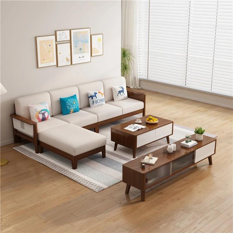 新中式クルミの無垢材ソファセット - モダンでシンプルな軽奢スタイルのリビング家具、上質な木の温もりを感じる贅沢な空間づくりに最適!